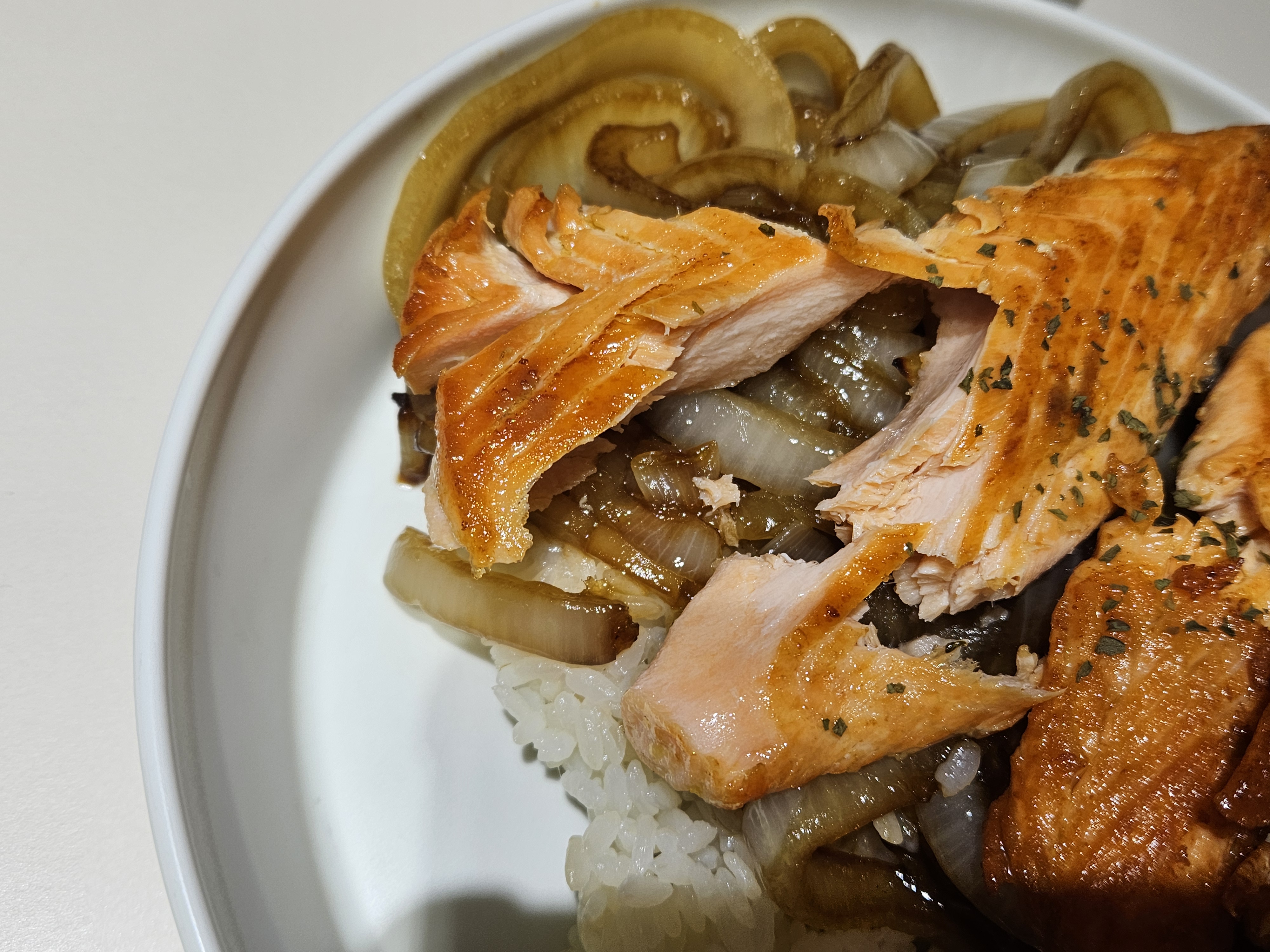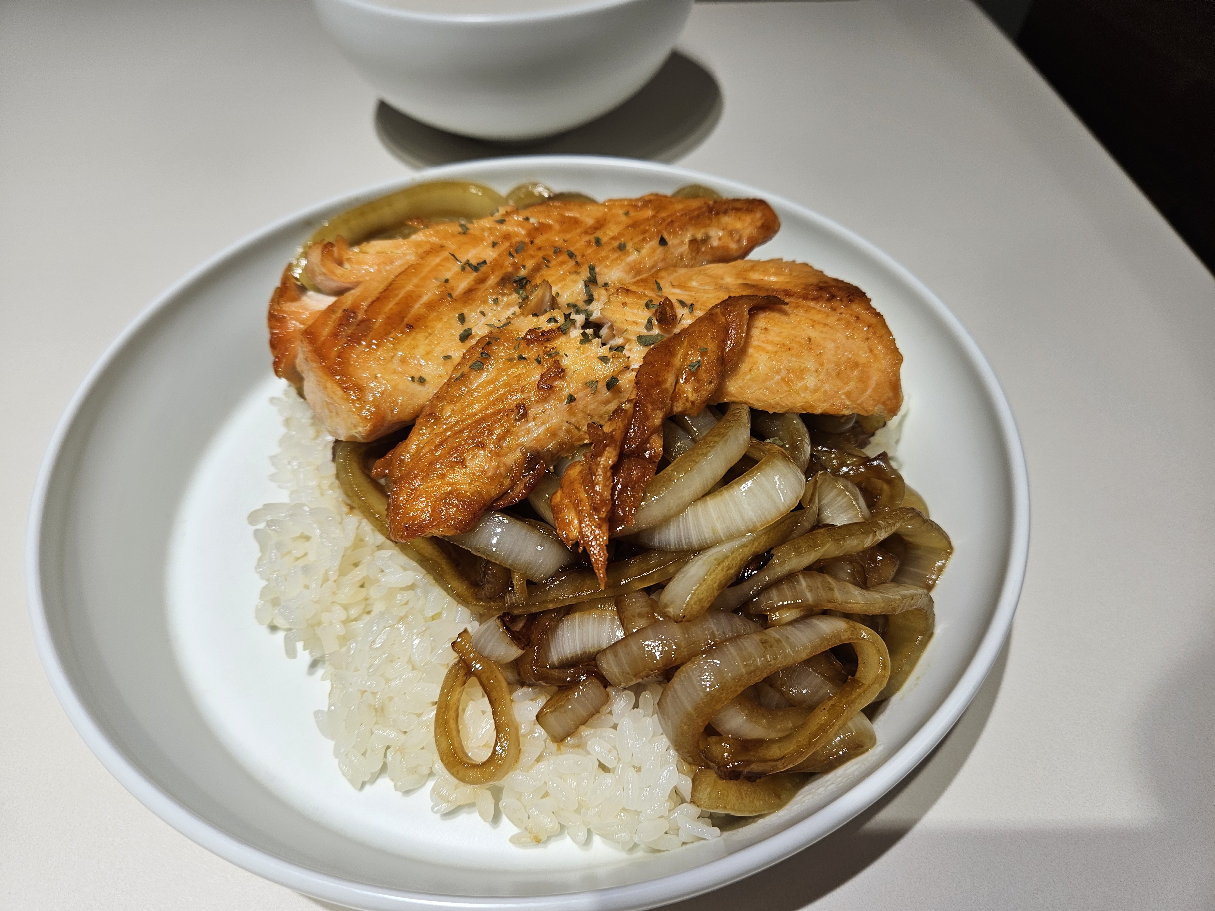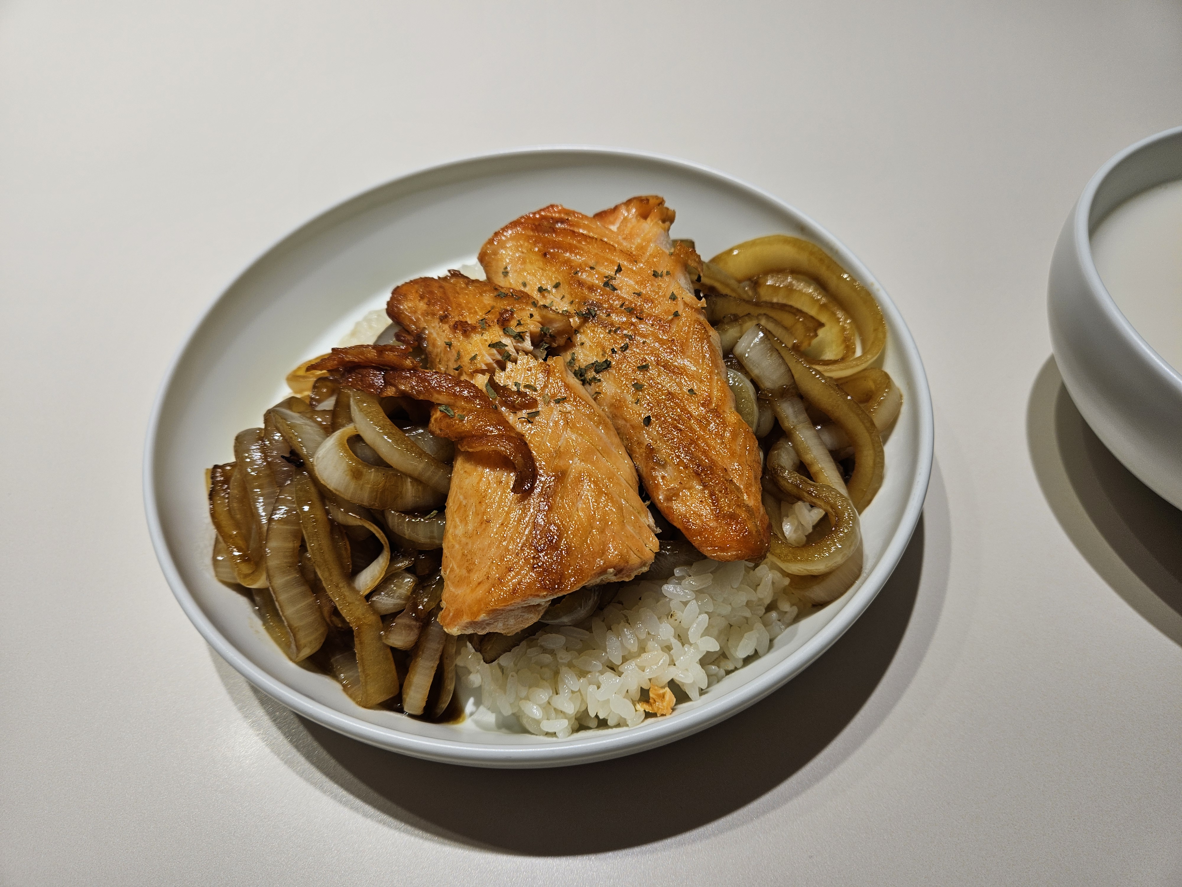 연어 자체도 간이 잘 베고, 겉은 바삭 속은 촉촉하게 잘 구워져서 너무 맛있는데, 구운 양파를 딱 곁들여 먹으면 진짜 감칠맛이 확 다가옵니다. 흰 쌀밥을 숟가락에 얹고 구운양파 탁탁 얹고, 거기 잘 구워진 연어 구이 한조각 올려서 한입 먹으면 진짜 몸에 온기가 돌아요. 너무 행복합니다.