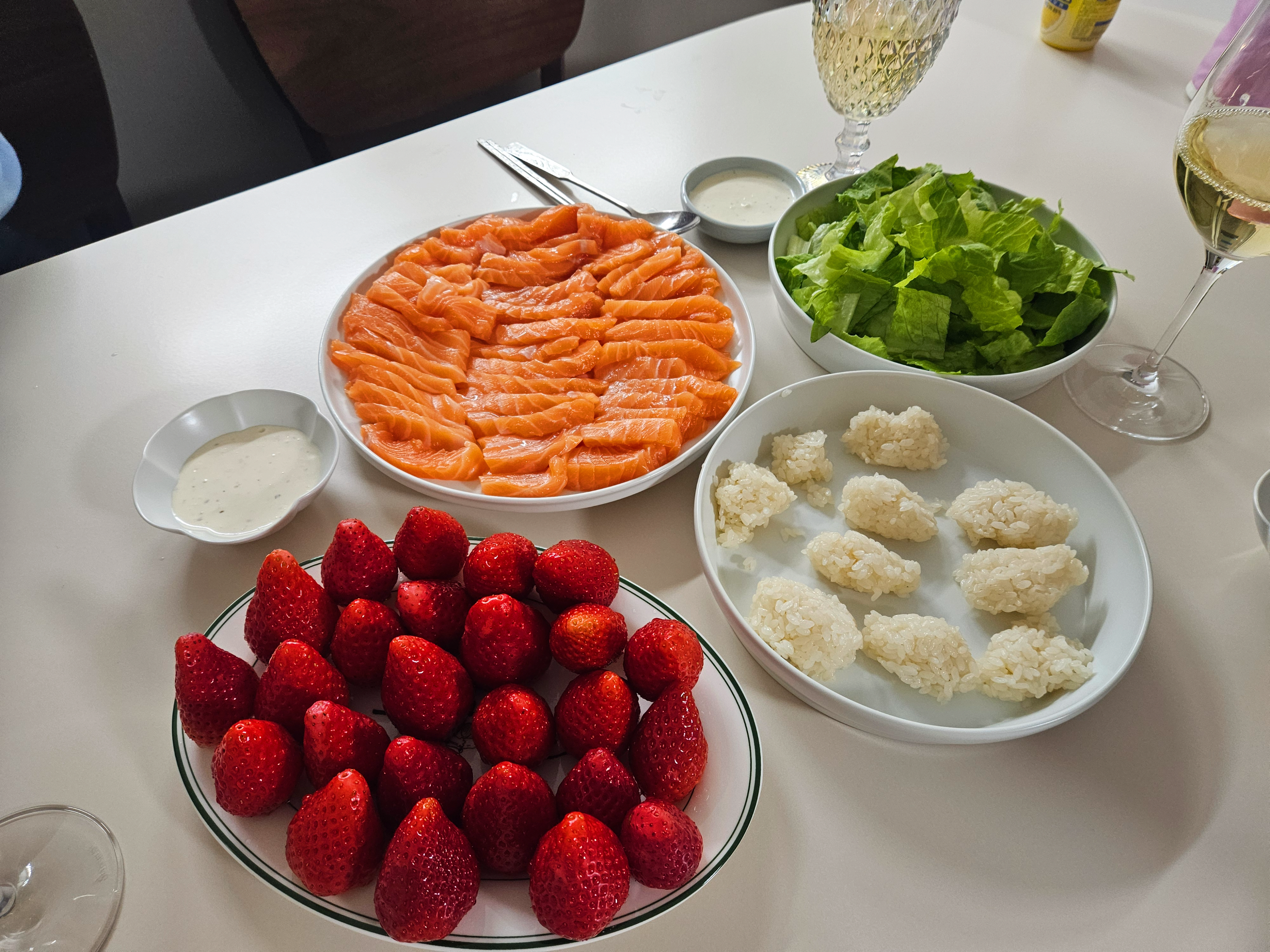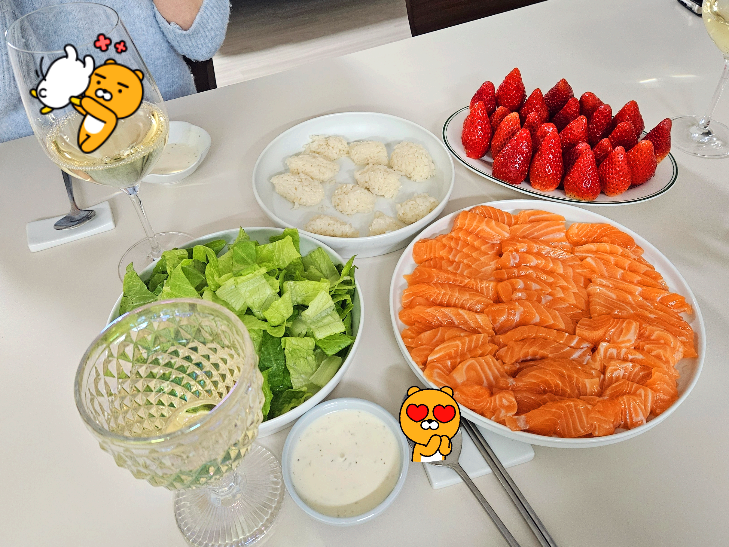 제가 준비한 메뉴는 연어회, 샐러드채소(생양파 대체 가능), 딸기, 연어회를 얹어 먹을 초밥 밥(샤리), 매콤한 토마토 파스타입니다.매콤한 토마토 파스타는 급히 만들어 먹느라 사진은 없습니다. 집에 라면이 다 떨어져서 제 입맛대로 만들었는데, 반응이 좋아서 뿌듯했어요. 매콤한 토마토 파스타도 다음에 포스팅 해보는 걸로! (근데 비주얼은 별로입니다.)