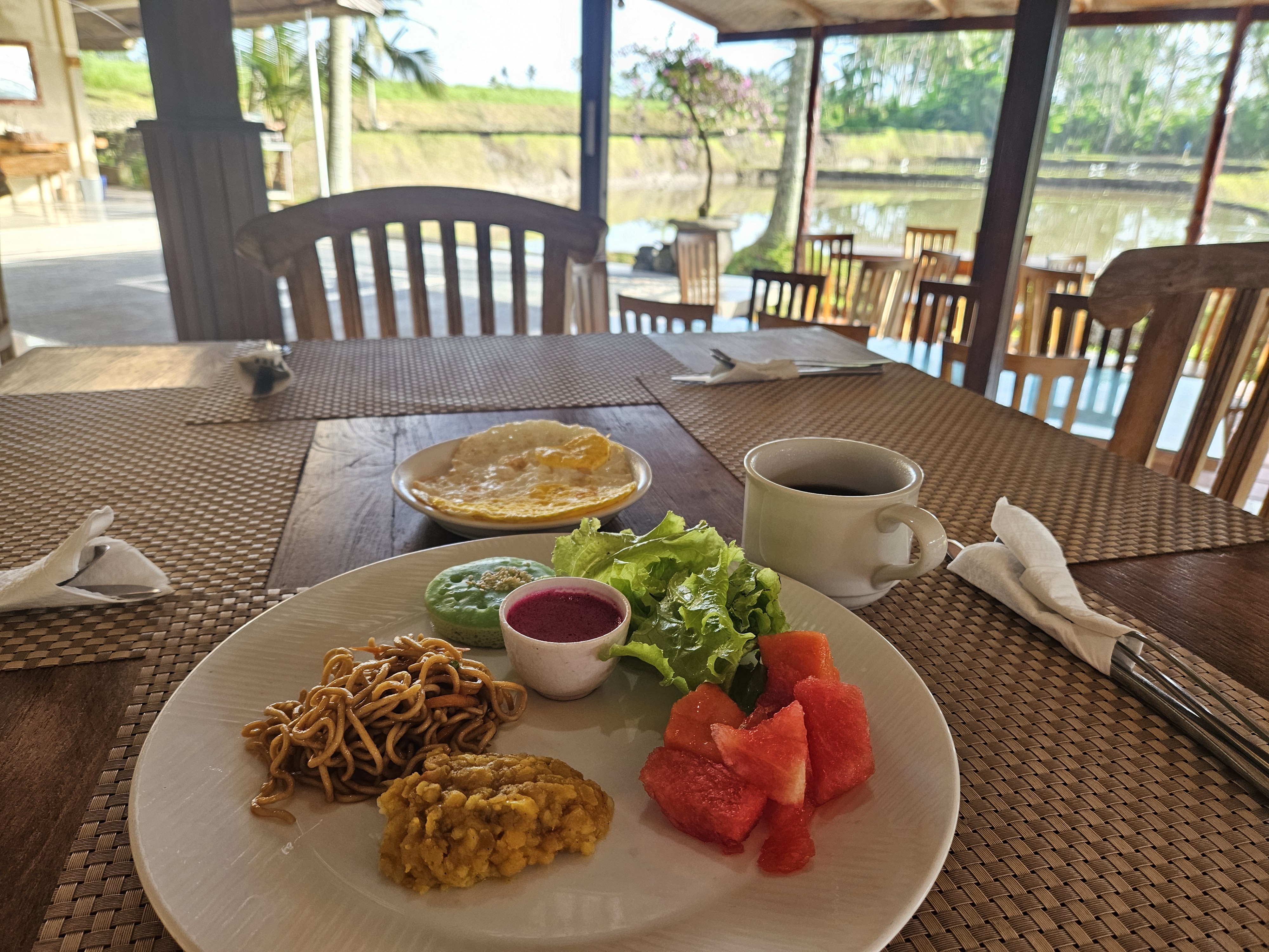 조식은 7시 30분부터고, 7시 15분쯤 방에서 나와서 리조트를 돌아보았다. 왠걸 어제 지옥같이 느껴졌던 낡은 리조트가 엄청 자연친화적으로 느껴졌다. 평화롭고 녹색이 가득한 천국같았다, 가장 멀리 있는 요가 강의실은 폭포와 산이 둘러싸인 곳에 있었는데, 마치 요정들의 집 같았다. 나중에 여기서 명상수업을 하게되는데, 물소리와 새소리, 바람소리를 들으면서 명상하면 내 호훕과 내 몸 안의 중심에 집중하게 되는 느낌을 받아서 정말 좋았다.