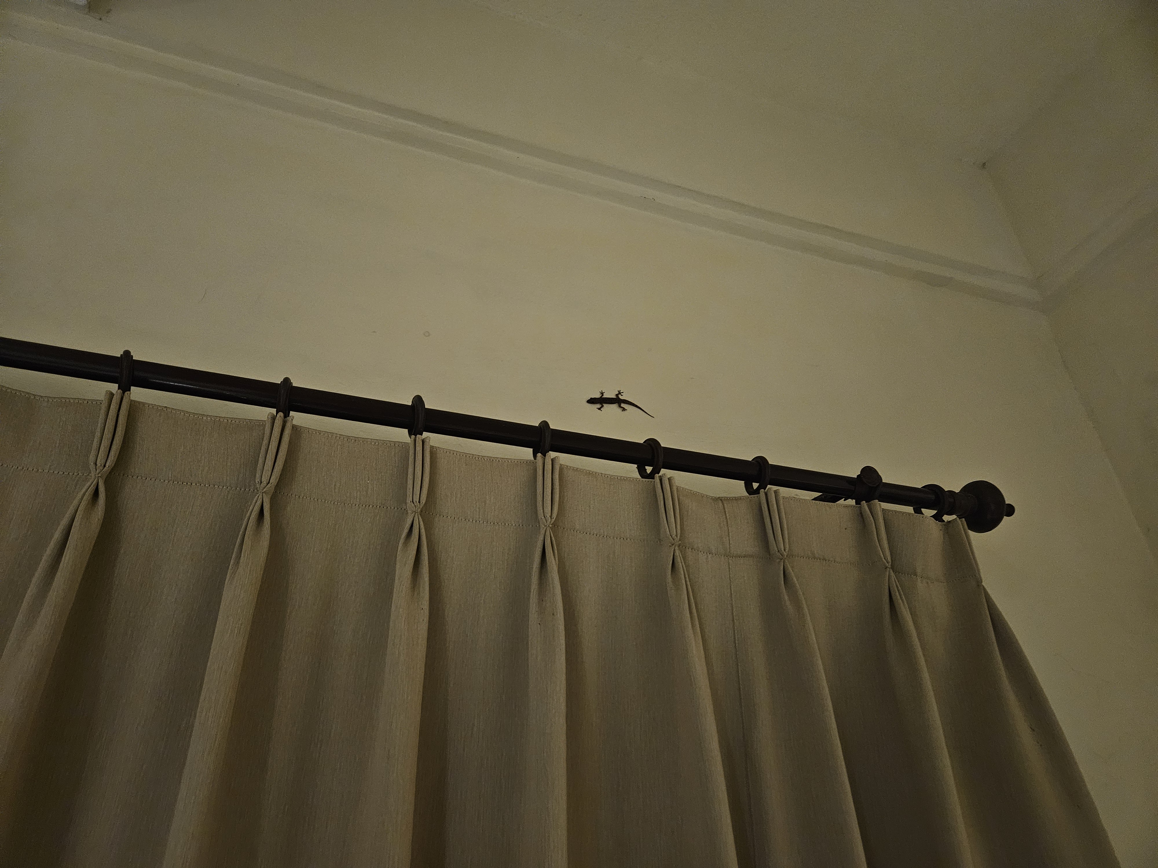 짐 풀고 느적느적 씻고 새벽 2시 넘어서 잠이 들었나보다. 원래 8시에 일어나려고 했는데, 느닷없는 "챱" 소리에 6시 30분쯤 눈을 떴다. 눈을 딱 떴을 때, 커튼봉 위 멱지 위에 있는 도마뱀과 눈을 마주쳤다. 어젯밤 나를 놀리킨 도마뱀일까. 챱 하는 귀여운 소리는 어떻게 내는 걸까, 손바닥과 벽지랑 하이파이브 하는 소리일까, 별별 생각을 하던 차에 '찹'소리가 한 번 더 들렸다. 다른 쪽에서 한 마리가 더 등장하는 소리였다. 그렇게 도마뱀의 모닝콜 덕에 4시간만에 일찍 일어났다.
