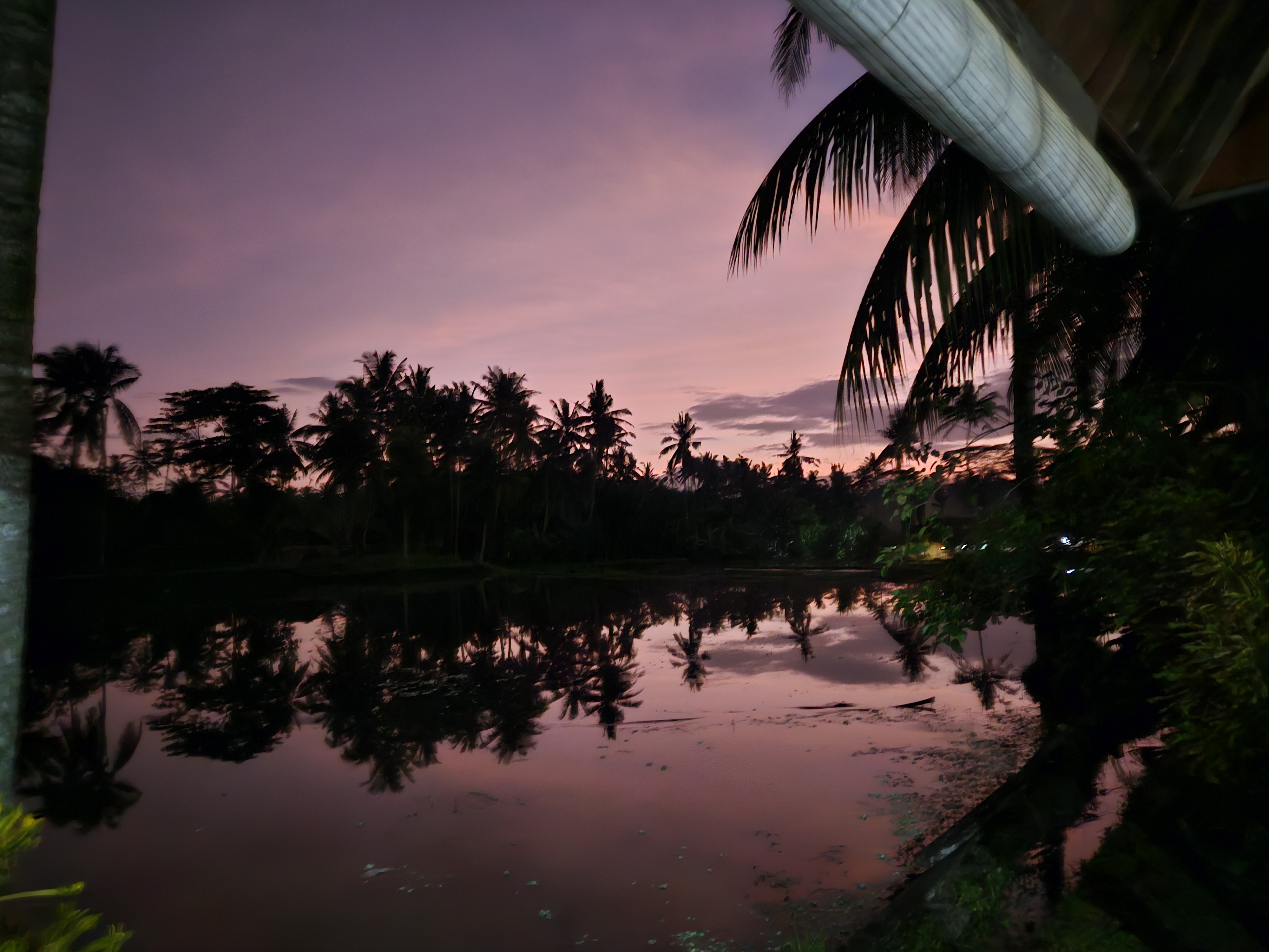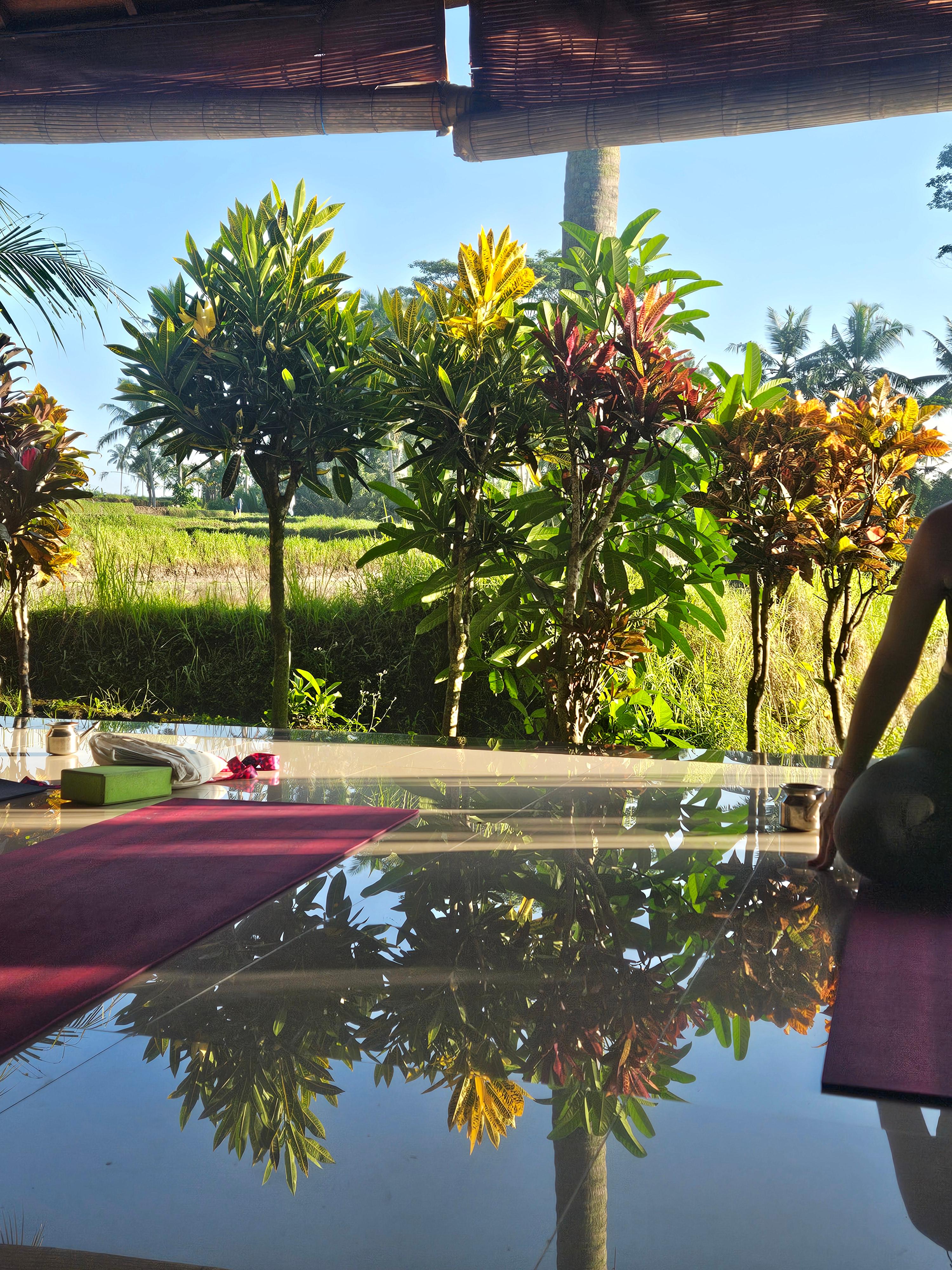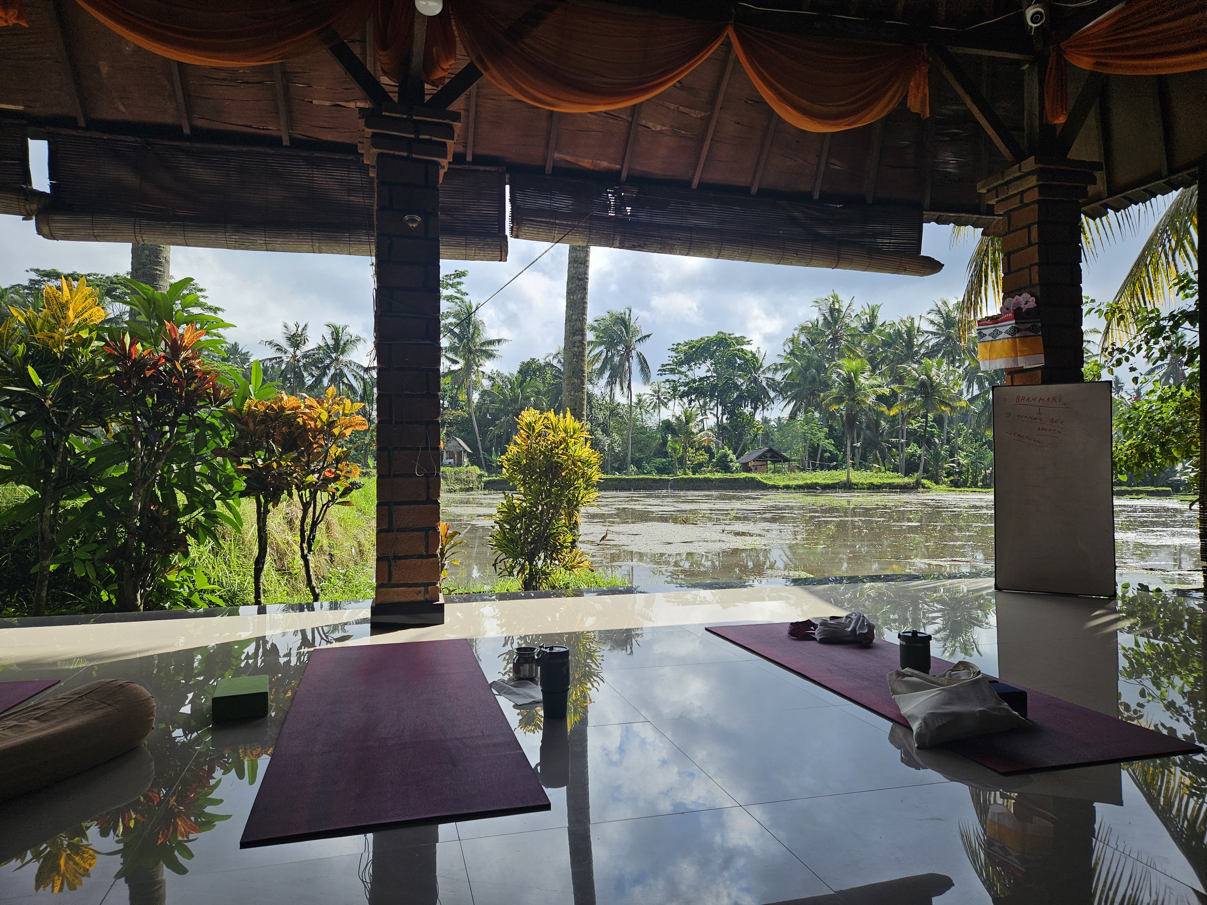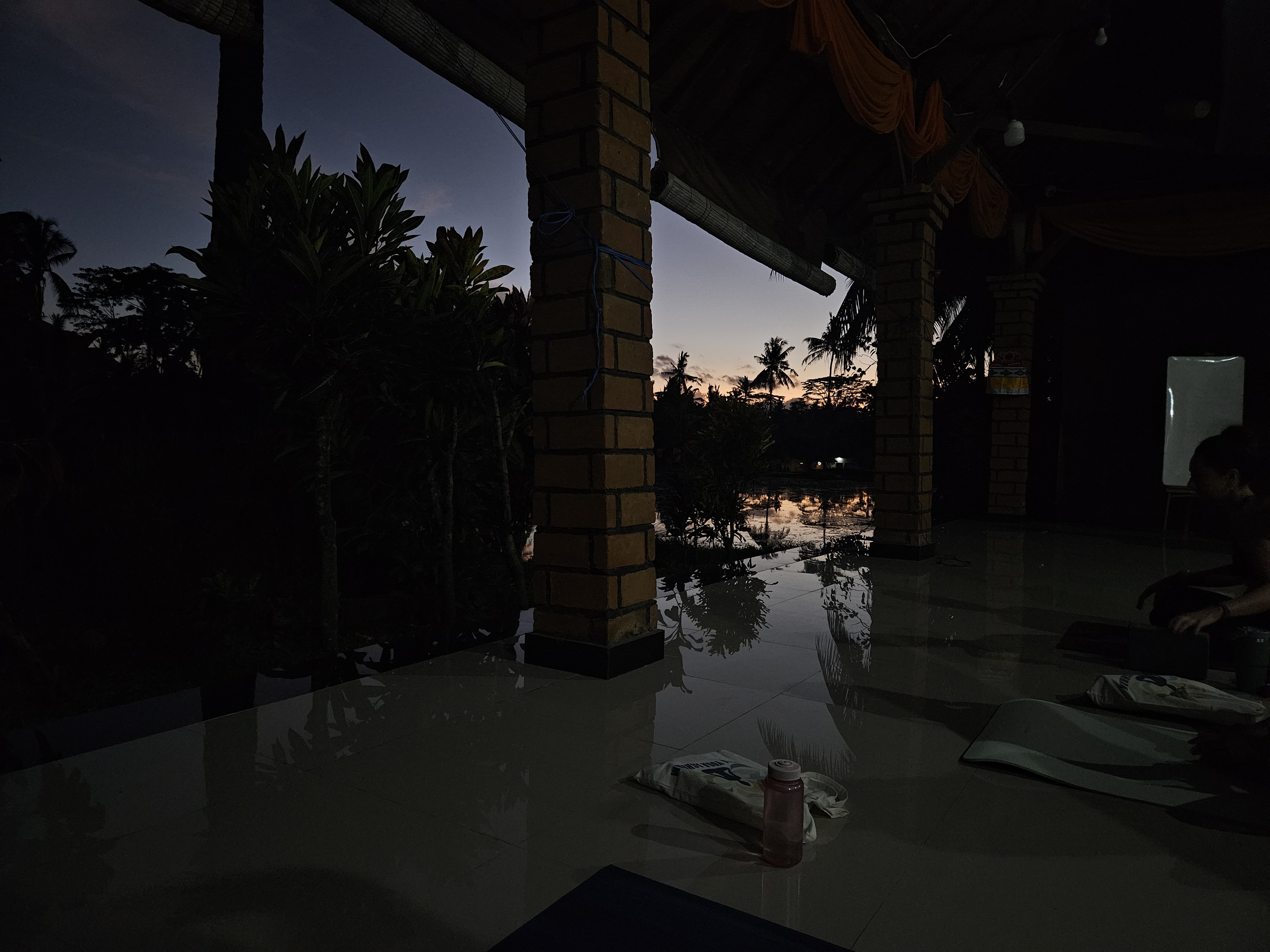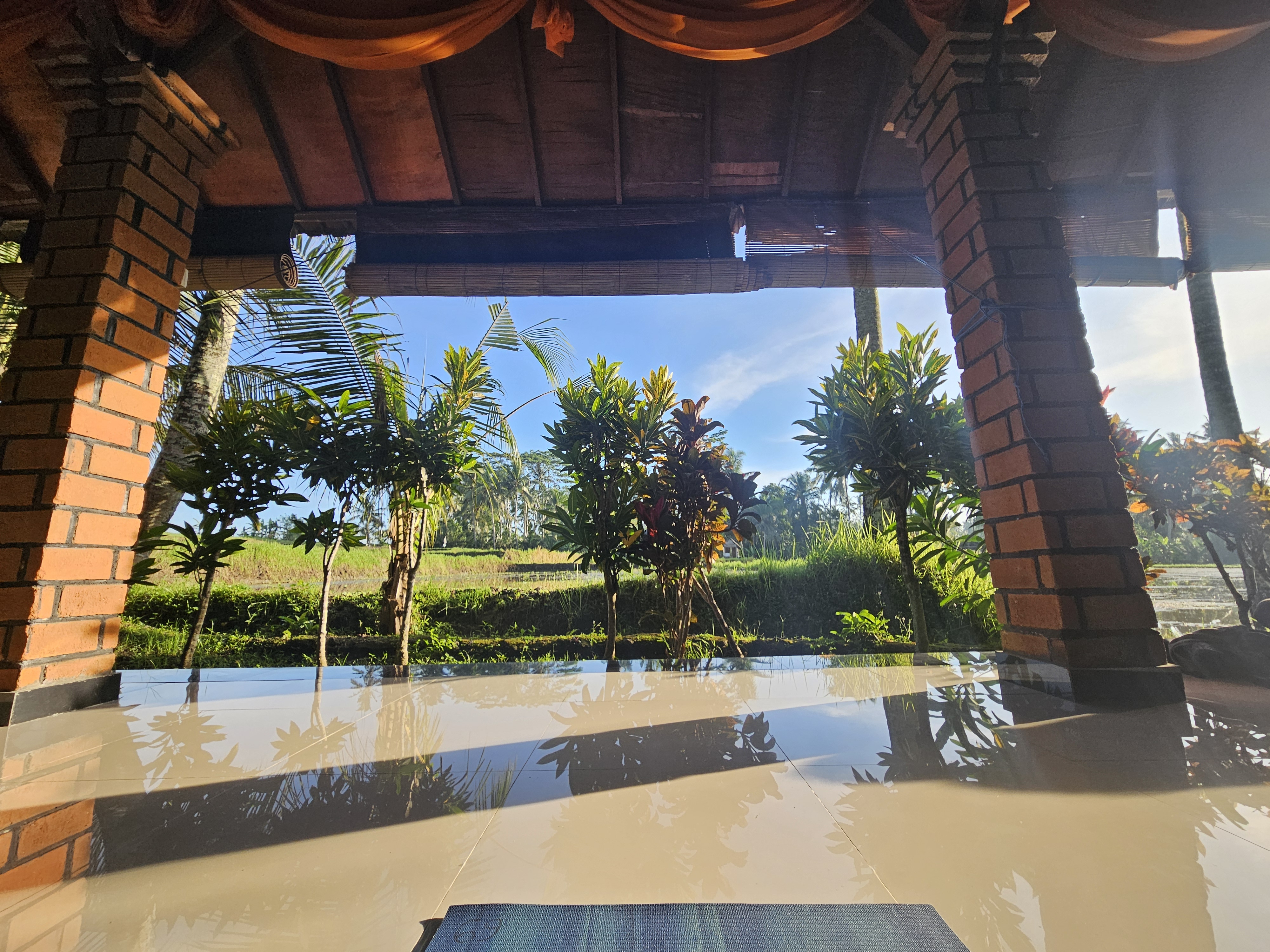 라이스 필드 옆의 샬라는 바닥이 타일로 이루어져, 나무와 하늘이 바닥에 비춰보이는데요. 저는 이런 무드가 정말 좋았어요. 바닥에 하늘이 비칠 때는 하늘에 떠 있는 것 같기도 했고, 나무가 비칠 때는 거꾸로 된 세상에 앉이 있는 것 같기도 해서 수업이 끝나고 샬라 바닥을 보며 멍때리는 시간을 좋아했습니다.