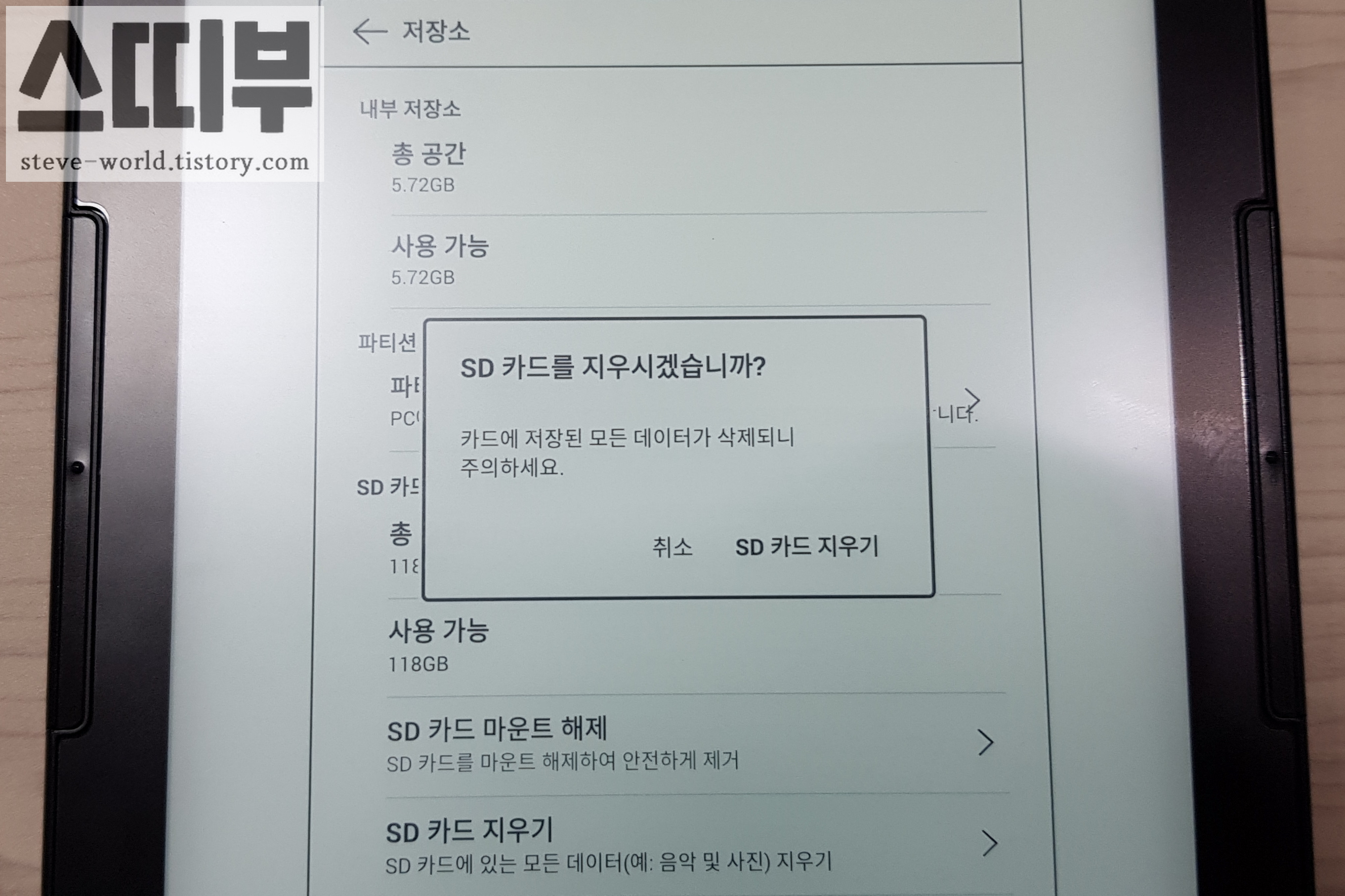 5. 완료 후, SD 카드의 '총 공간' 118GB, '사용 가능' 118GB로 확인