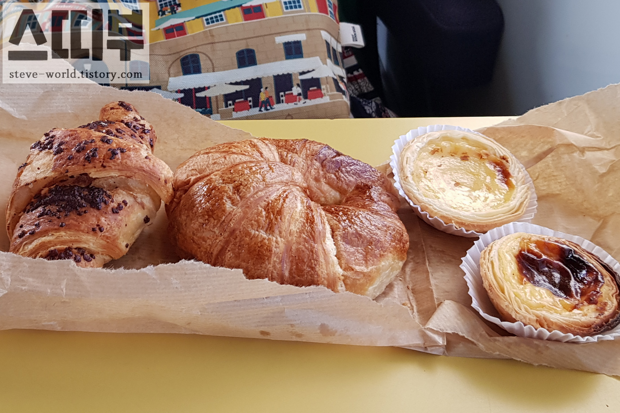 Blu Coffee Shop 내부 우측 상단에 있는 Pastel de Nata 좌측부터 초콜릿 크루아상, 크루아상, 나타 2개 나타 전문점도 아니고, 역사 카페라 전혀 기대하지 않았었는데, 맛있었습니다. 얇은 파이 결과 흘러내리는 커스터드 크림이 보기만 해도 배고프게 만듭니다.