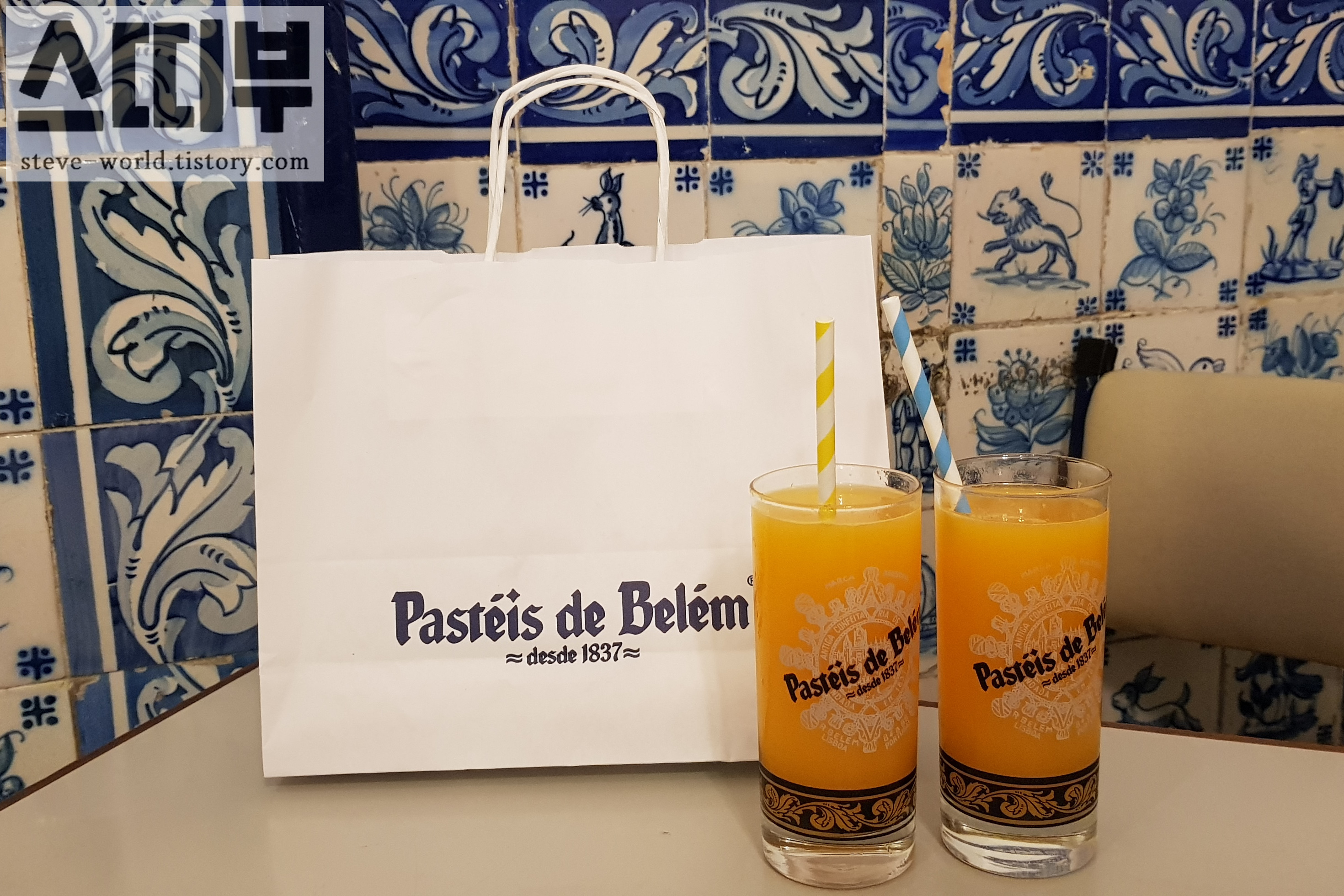 파스테이스 드 벨렝의 오렌지 주스와 나타 포장 오픈 시간에 맞춰 일찍 오면 줄도 짧습니다. 일찍 오셔서 커피와 함께 주문해서 맛보시고, 맛있으면 포장을 해가는 걸 추천드립니다.