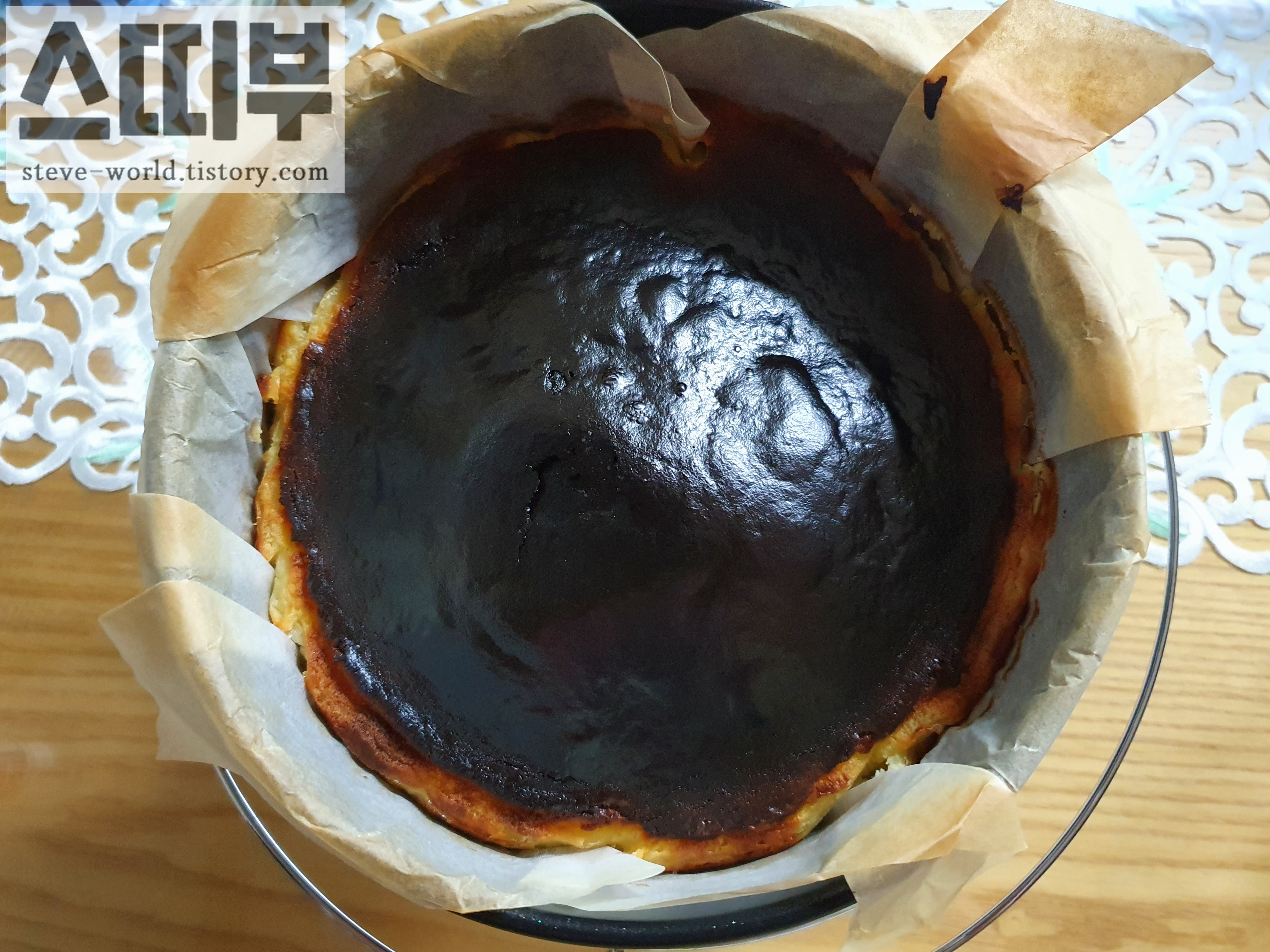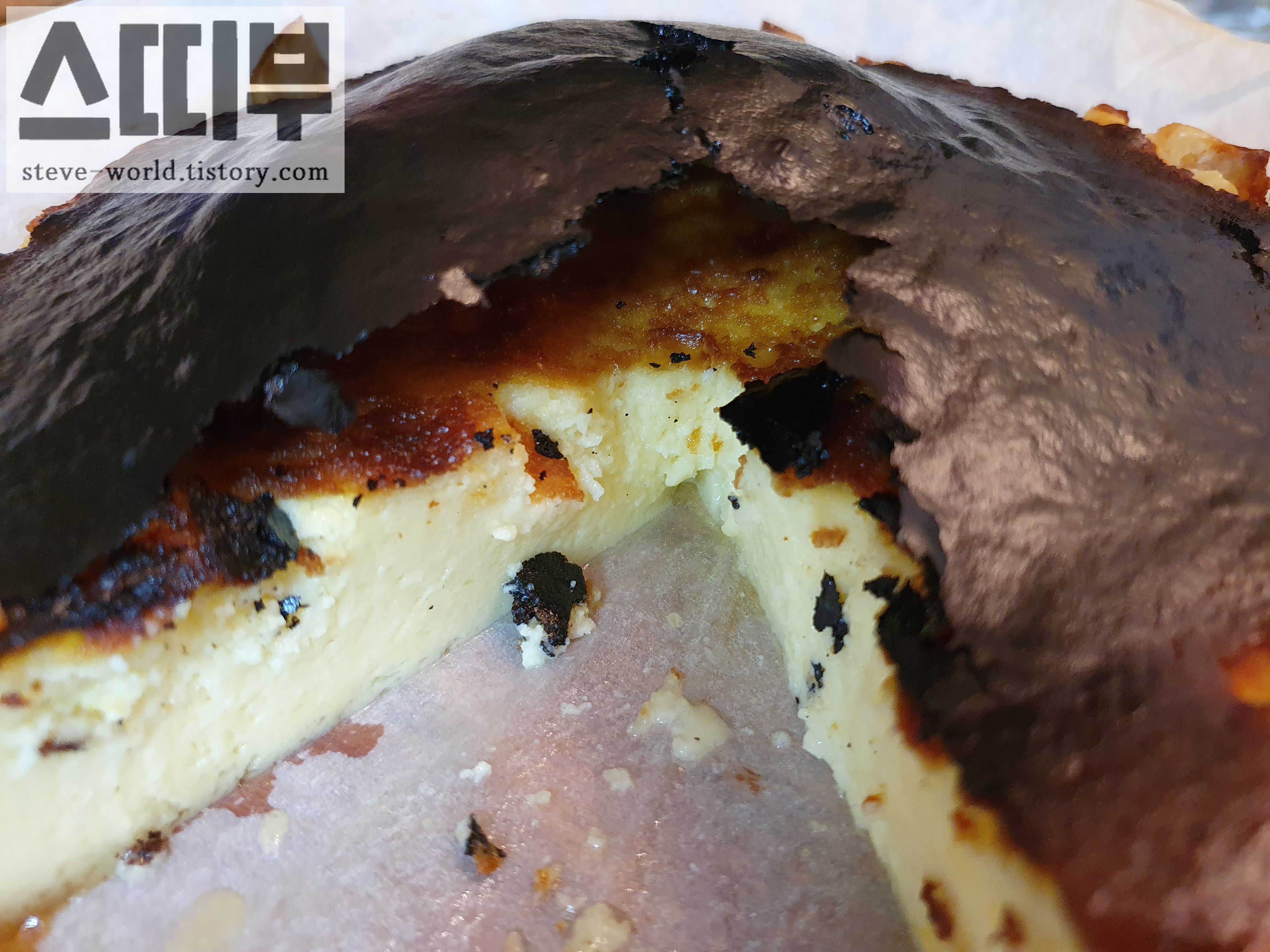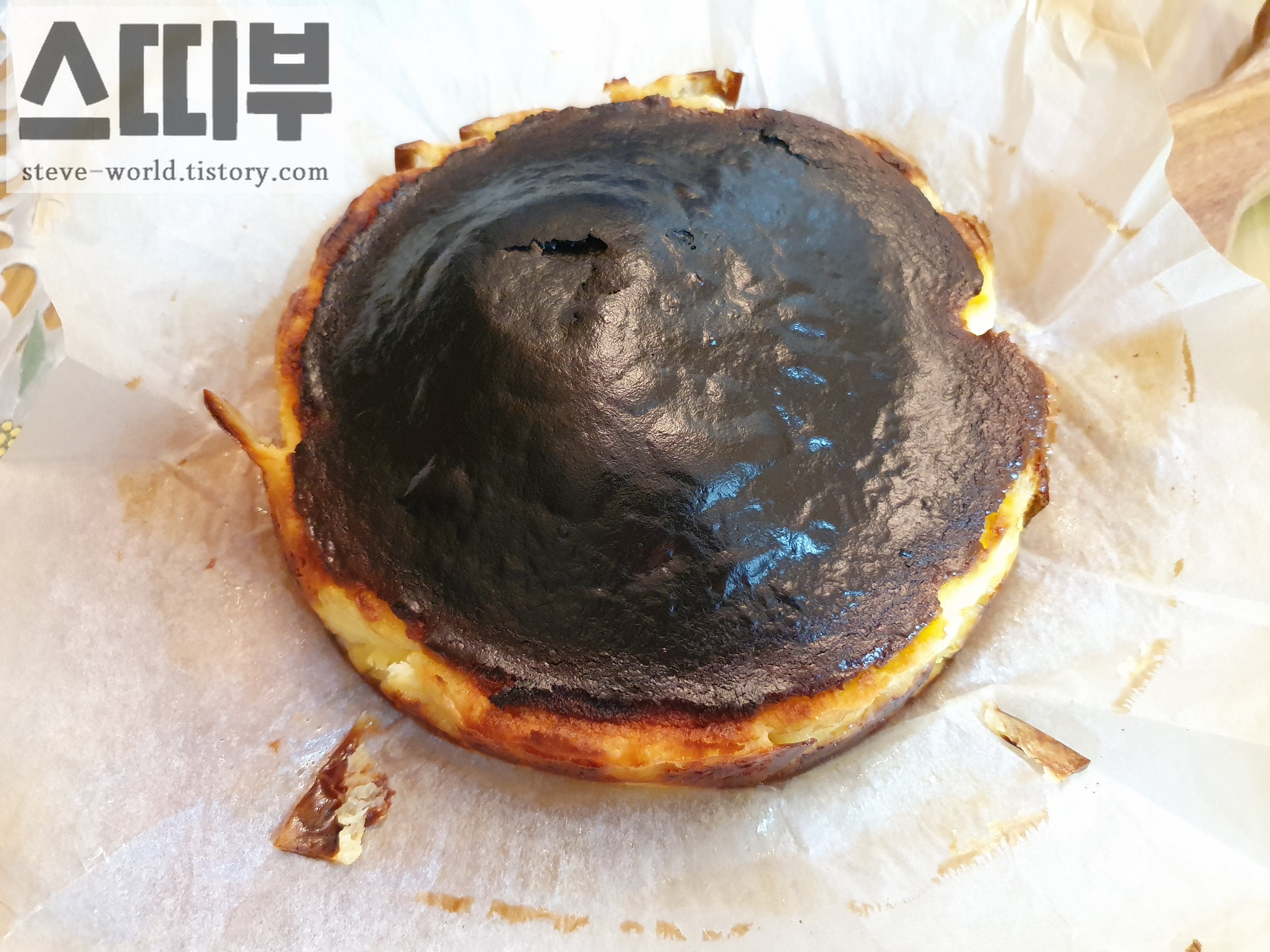 처음으로 구워본 바스크 치즈케이크는 외관 측면에서 조금 실패했습니다. 흔히 보던 바스크 치즈케이크의 모양과는 다르게, 윗부분이 꺼지지 않고 부푼 상태로 탔습니다. 실패 요인은 오버 쿡인 듯합니다. 온도가 높거나, 구움 시간이 긴 경우, 오버 쿡되어 이렇게 부푼 모양의 탄 형태로 나온다고 합니다.