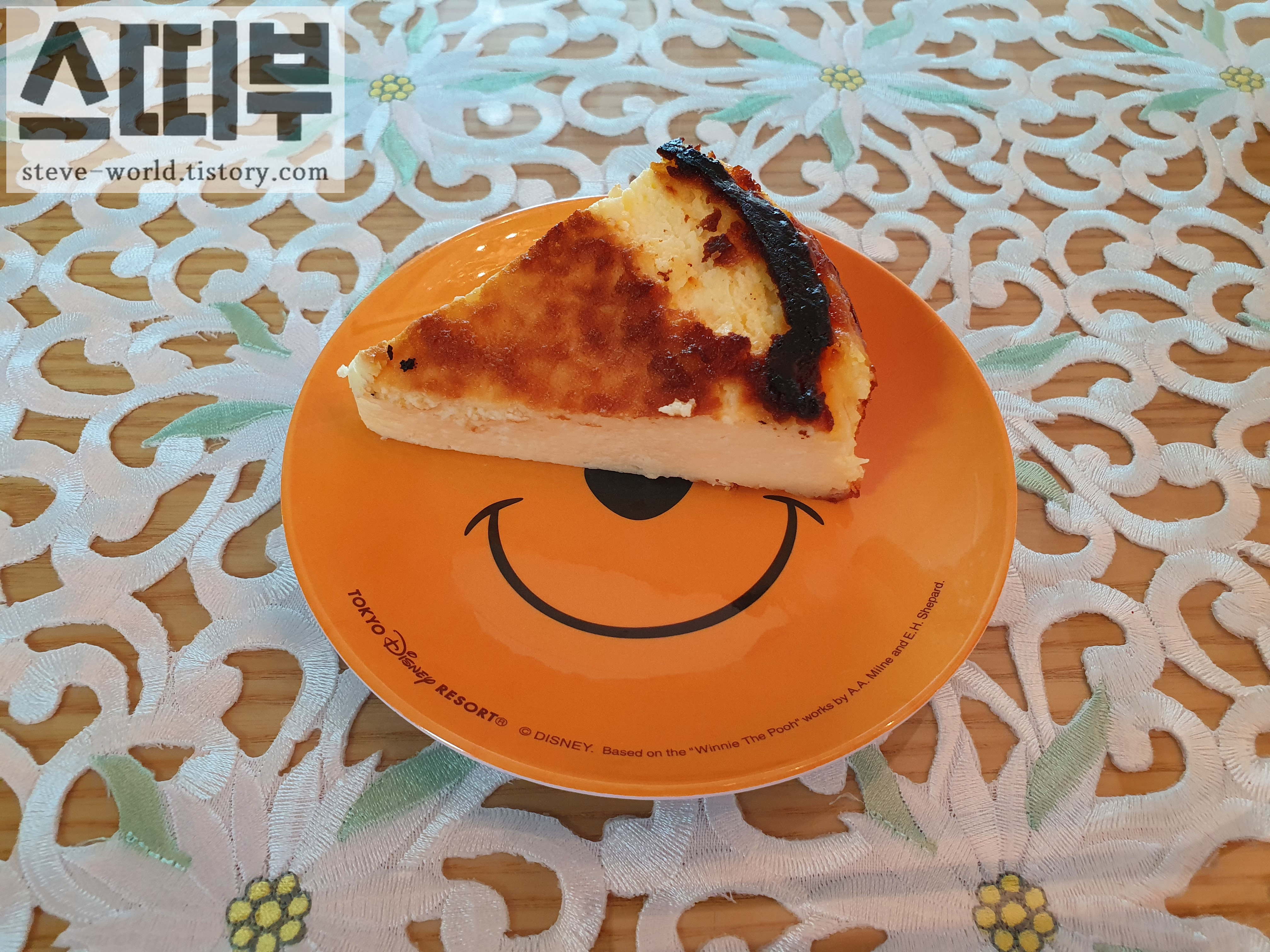 곰돌이 푸 접시에 얹은 바스크 치즈 케이크