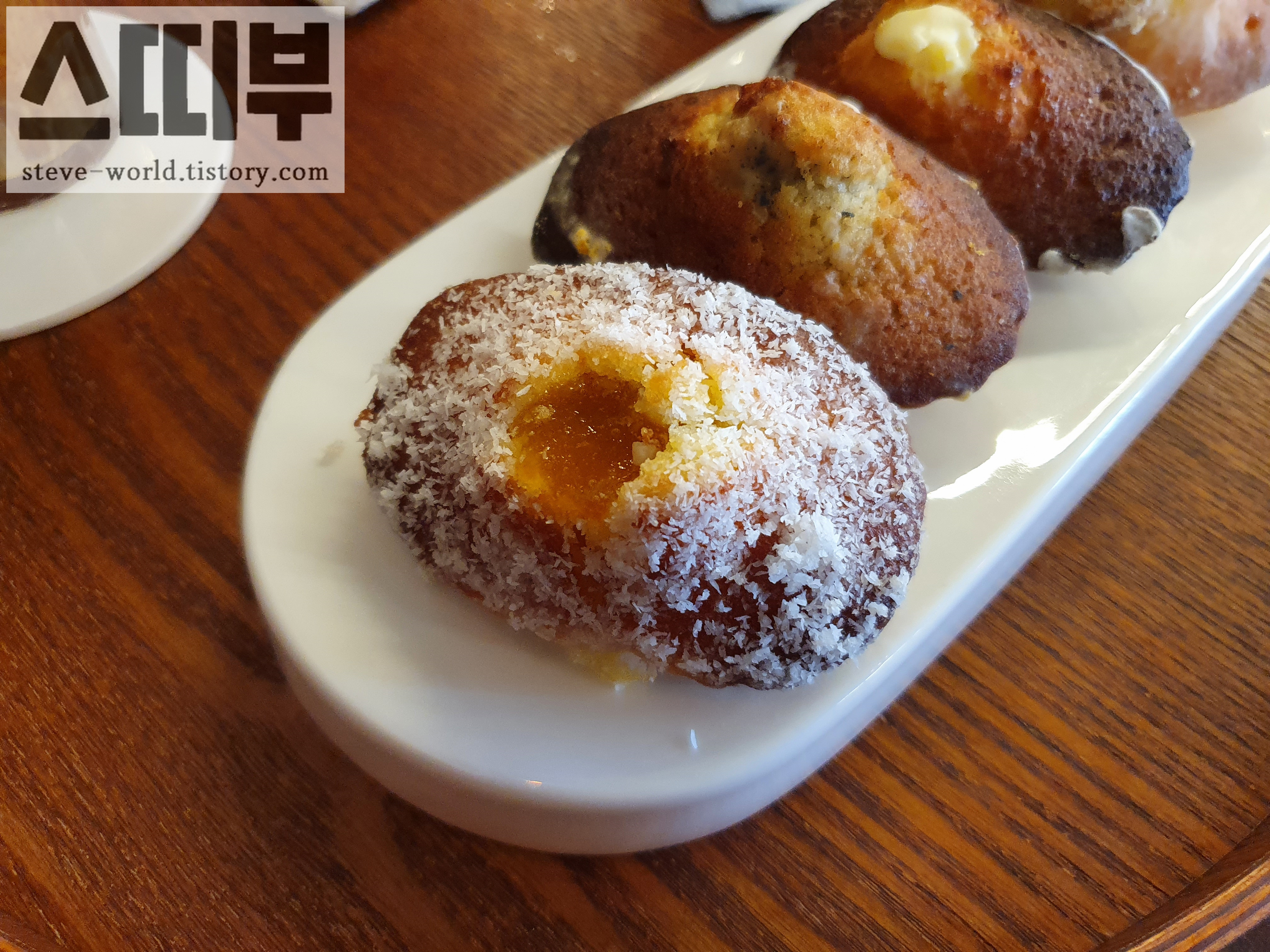 망고 필링을 넣고, 코코넛 가루를 입힌 적도 마들렌
