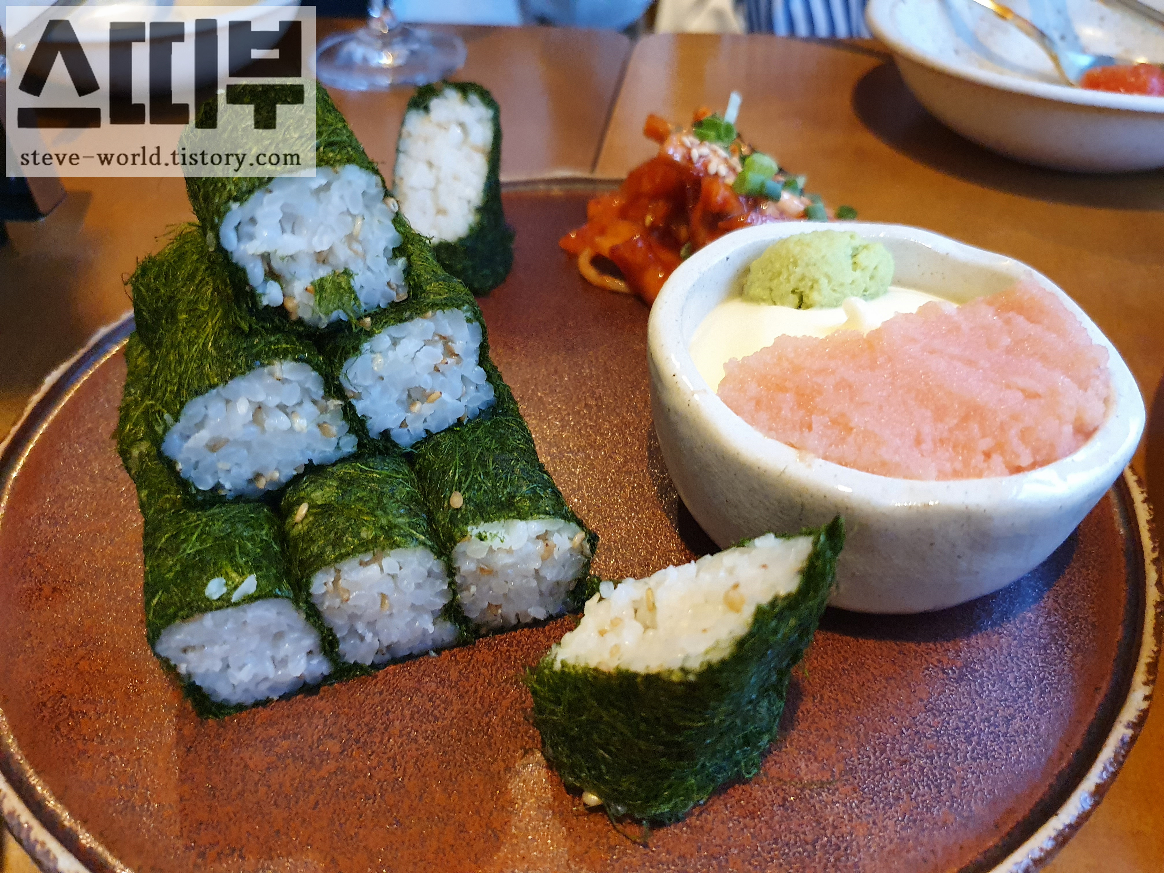 한븟에서 꼭 주문해야 하는 메뉴로 토마토 유자절임과 감태 김밥이 있습니다. 주문 안 하기엔 너무 아쉬워요!