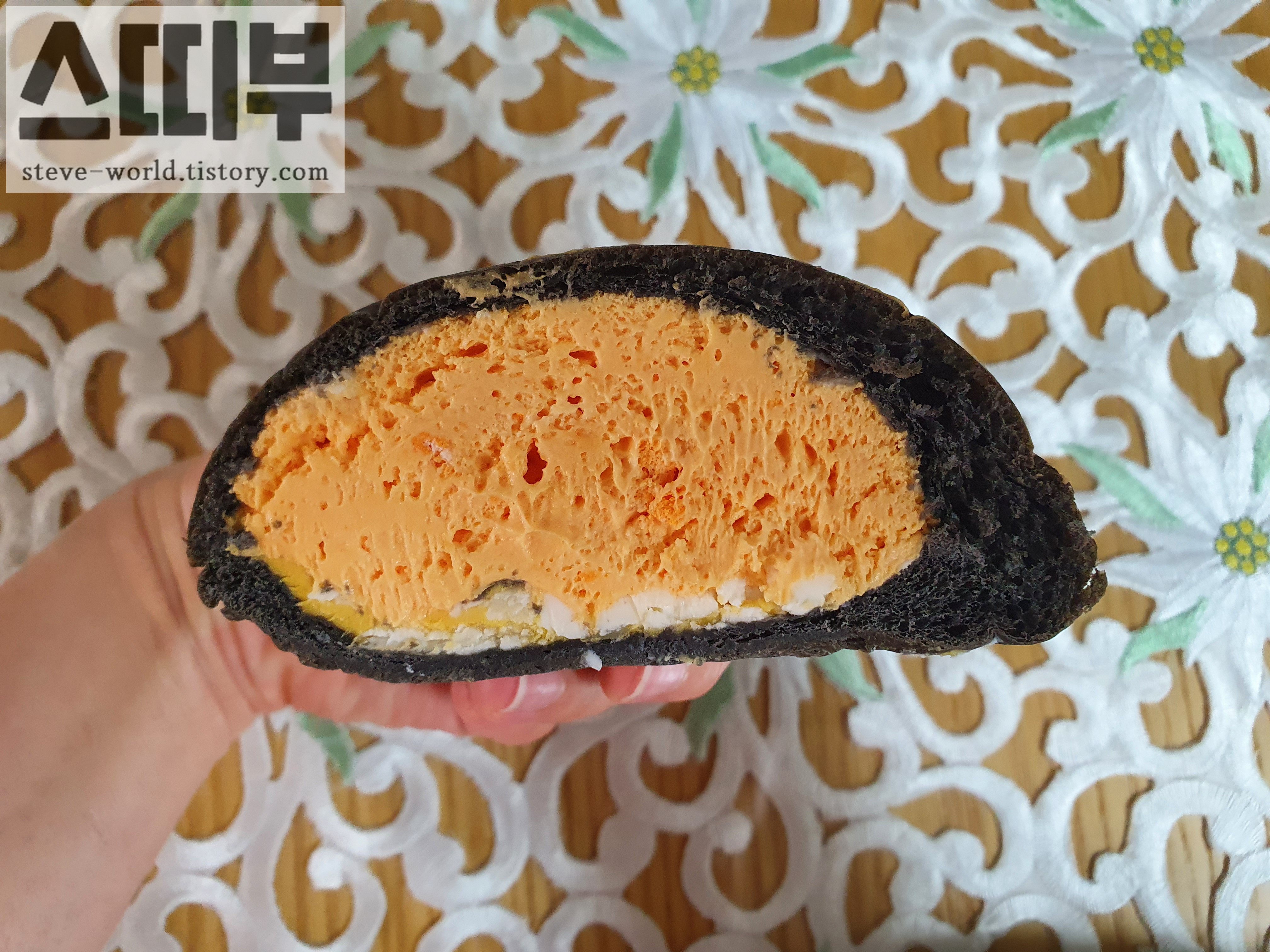먹물 색의 까만 빵속에 이렇게 예쁜 노란색이 숨어있을 줄은 몰랐어요. 단짠단짠 치즈의 매력적인 맛들만 쏙 뽑아낸 크림빵이었습니다.