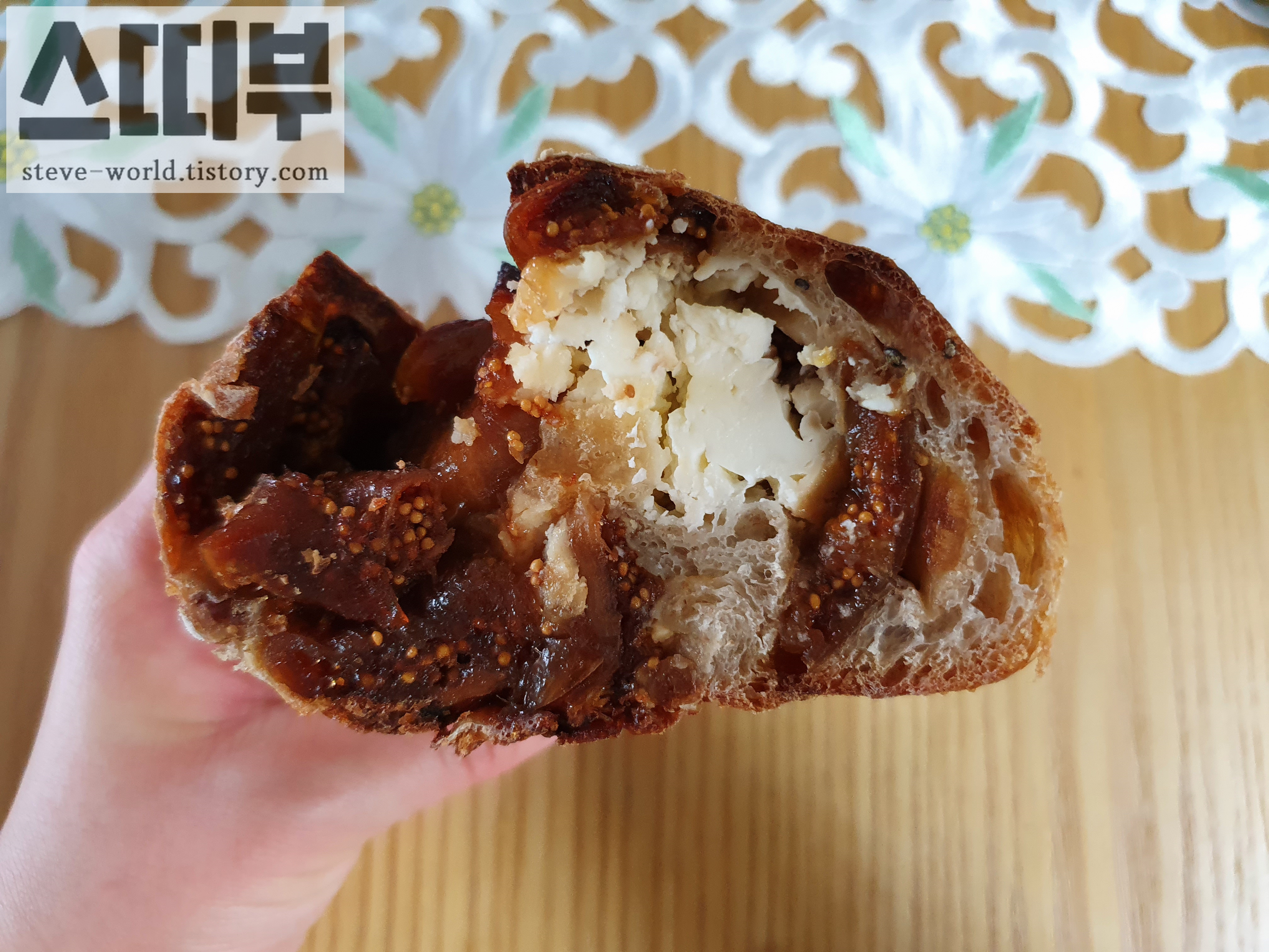 반을 갈라 보면, 빼곡히 찬 무화과와 크림치즈를 만나볼 수 있습니다. 고소하고 단단한 빵과 달콤한 무화과, 크림치즈의 조합이 최고입니다. 정말 맛있었어요.