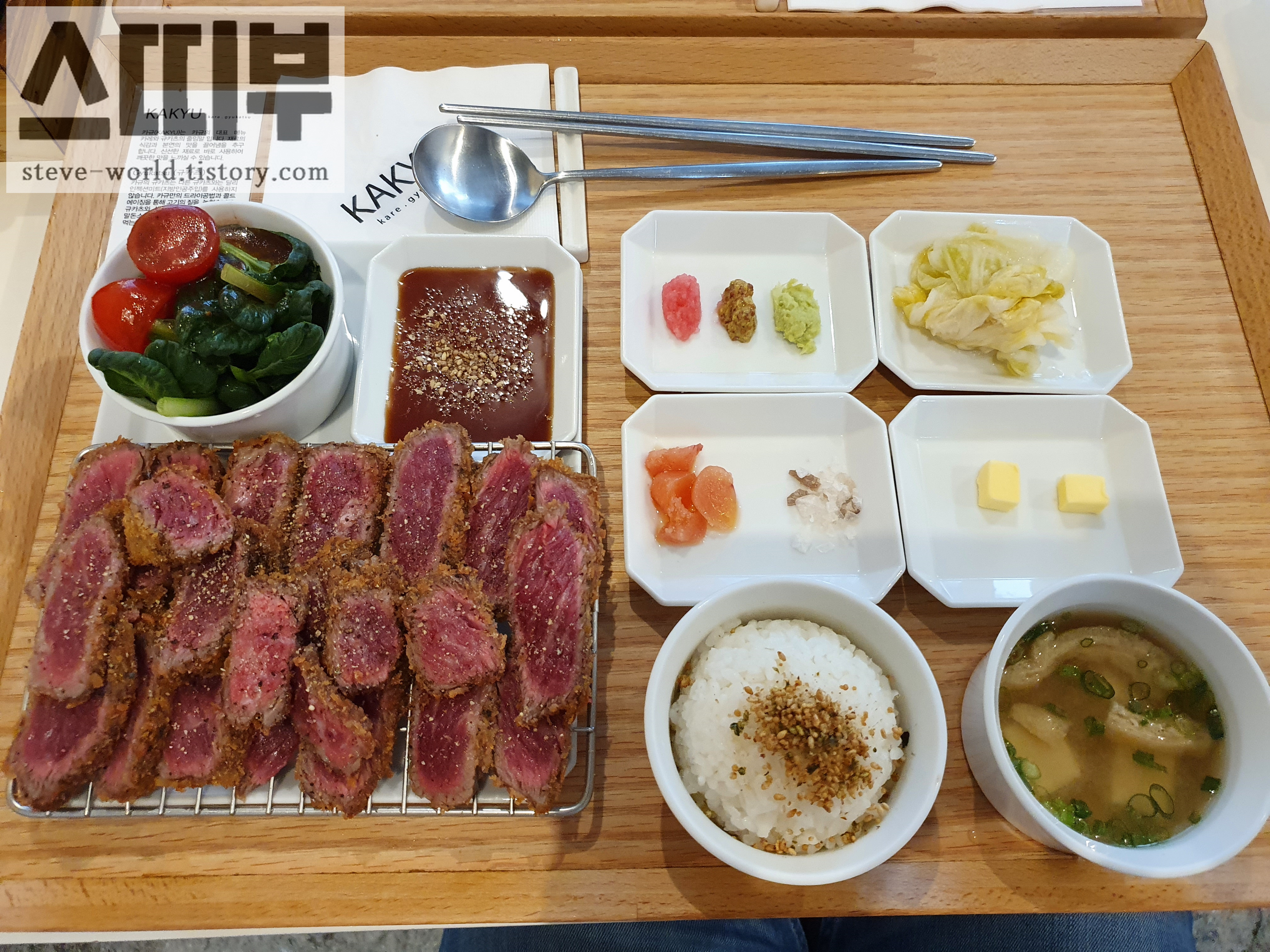 3명이서 '규카츠 180g 2개' + '닭카레, 규카츠 180g, 음료 세트' 해서 총 66,000원 지불했습니다.