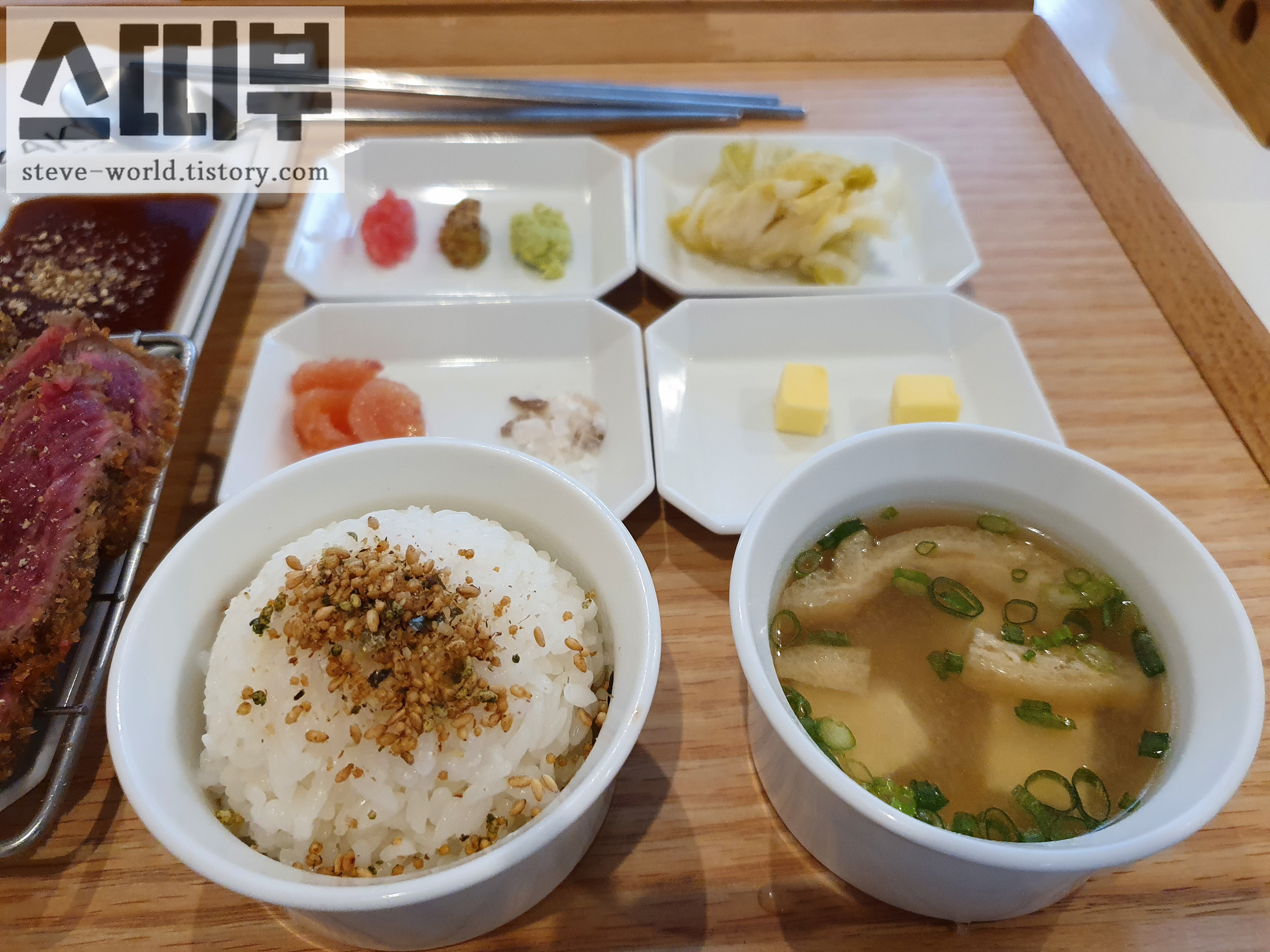 샐러드와 일반 규카츠 소스, 명란, 홀그레인머스타드, 와사비, 소금, 백김치, 밥과 미소국