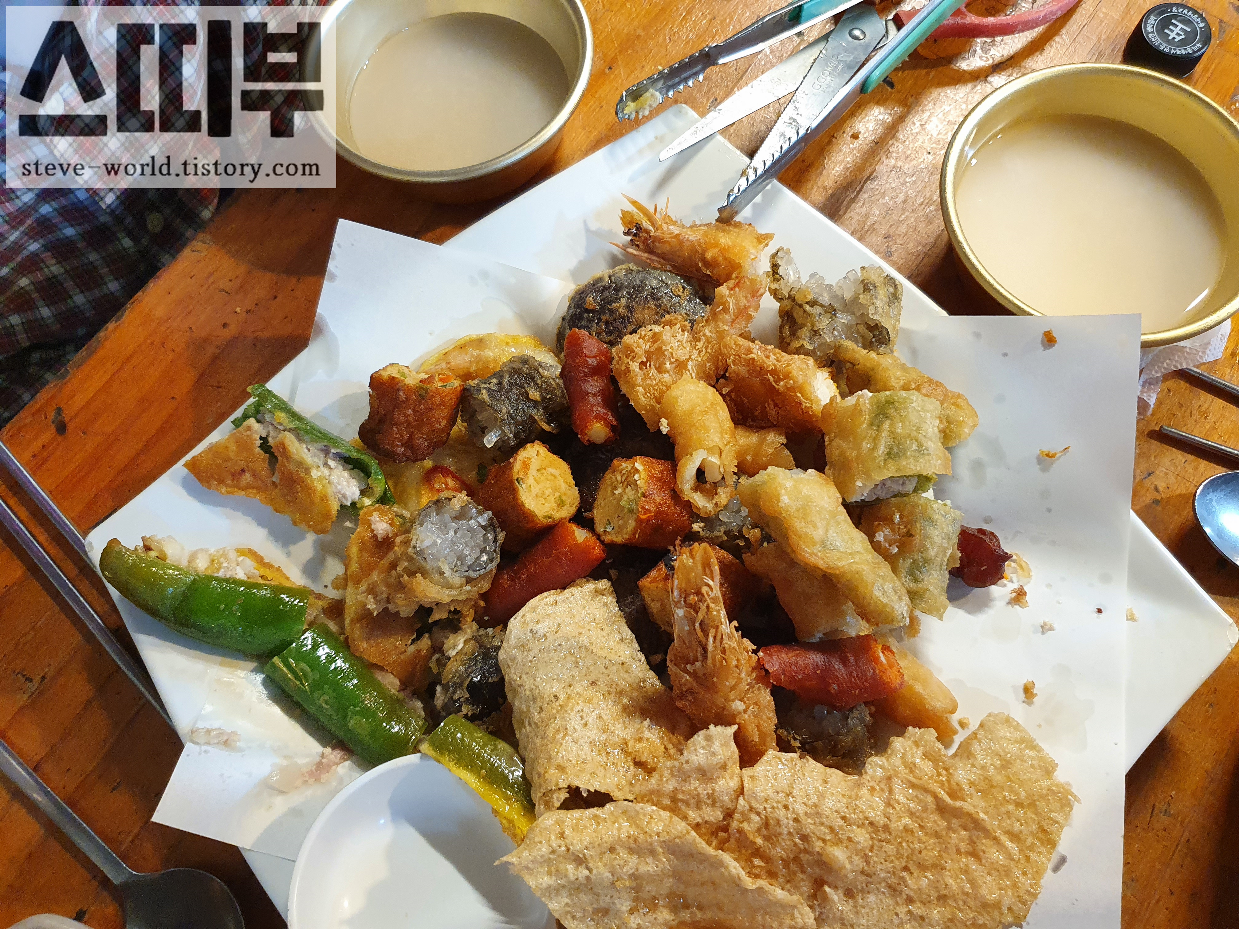 제 시선을 끈 메뉴였던 대왕 김말이, 동행의 추천으로 쥐포튀김, 그리고 막걸리와 궁합이 잘 맞을 것 같은 어묵과 버섯전, 고추전, 매운 빨간 튀김옷을 입힌 오징어 튀김, 새우튀김까지 바삭바삭하게 튀겨져 나왔습니다.