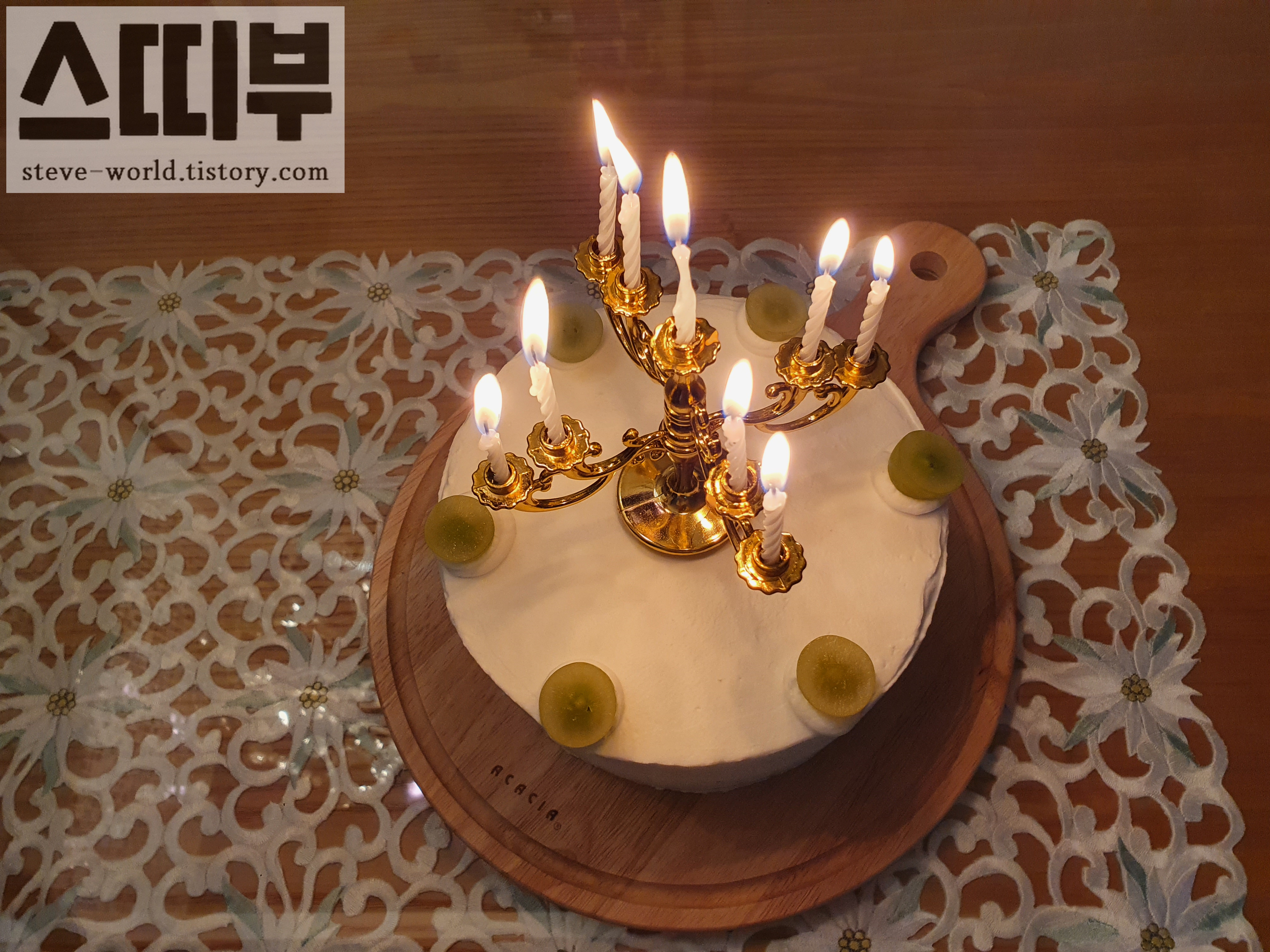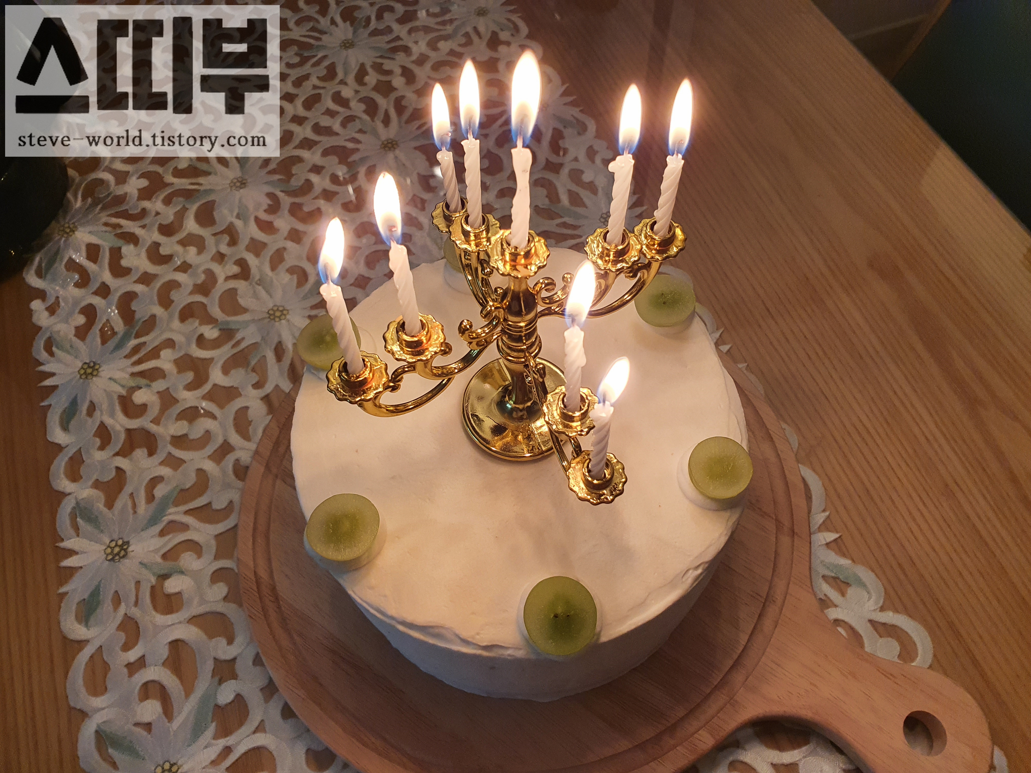 두 번째 케이크 아이싱이었는데, 아직 많이 부족하지만 저번 케이크보다는 마무리가 잘 된 것 같아 마음에 듭니다. 이번엔 샹들리에 초를 구입해서 꽂아 봤는데 화려하고 예뻐서 하얀 생크림 케이크에 정말 잘 어울립니다.