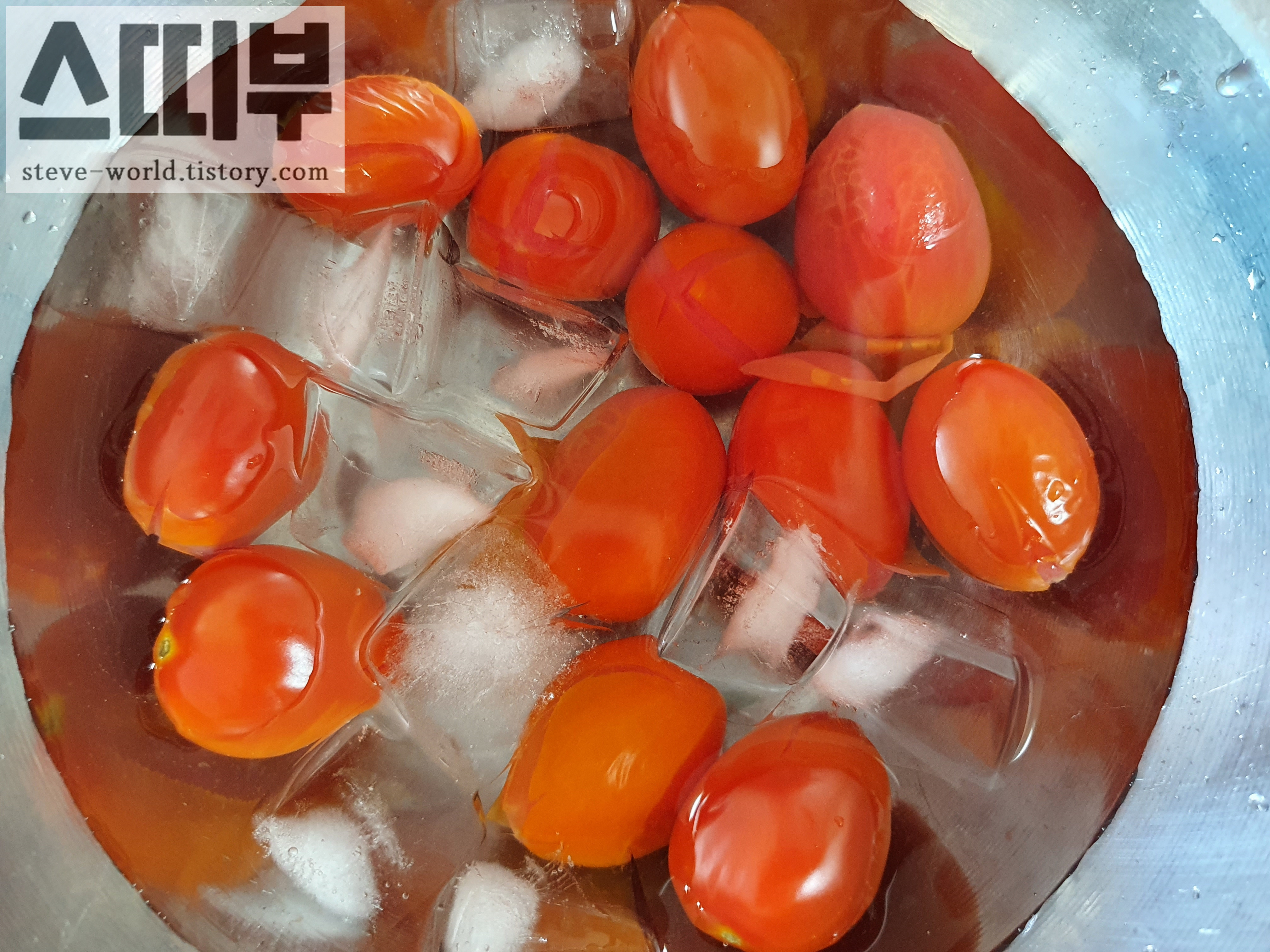 끓는 물에서 나와 얼음물에 들어간 방울토마토