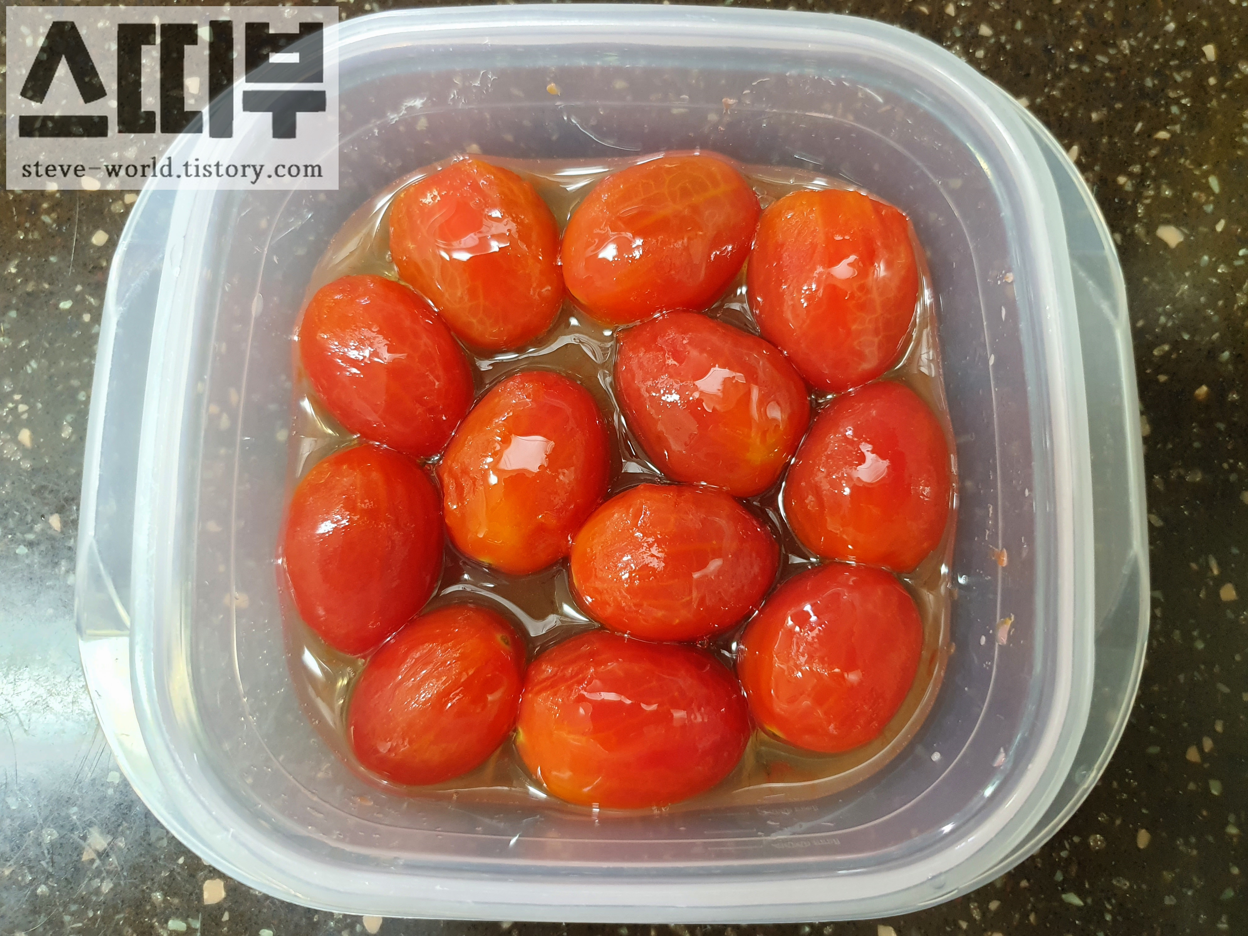 토마토의 껍질을 모두 벗긴 후, 보관할 통에 담아 꿀을 넉넉히 둘러 주었습니다.