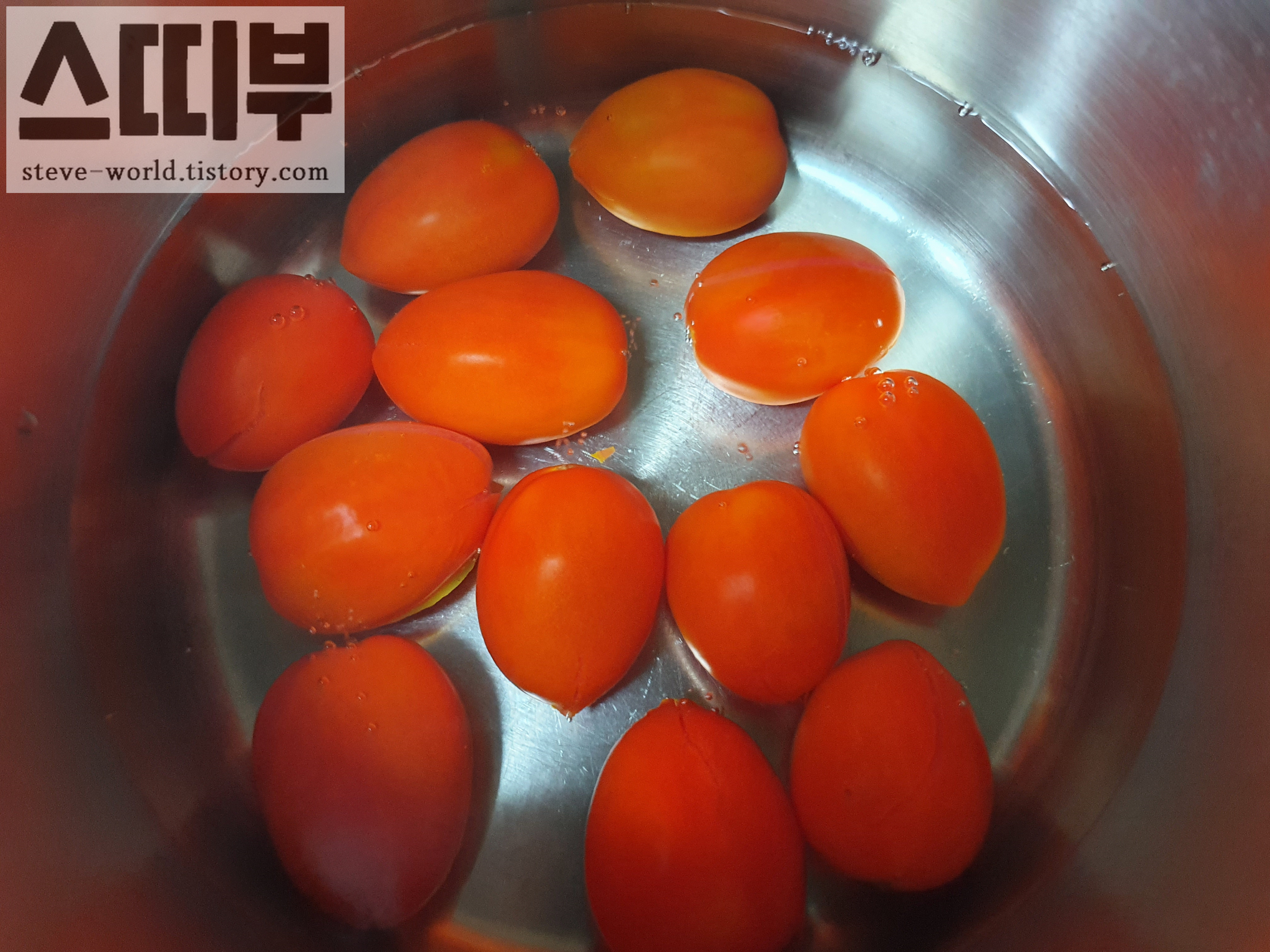이미 껍질이 벗겨진 토마토도 보입니다.