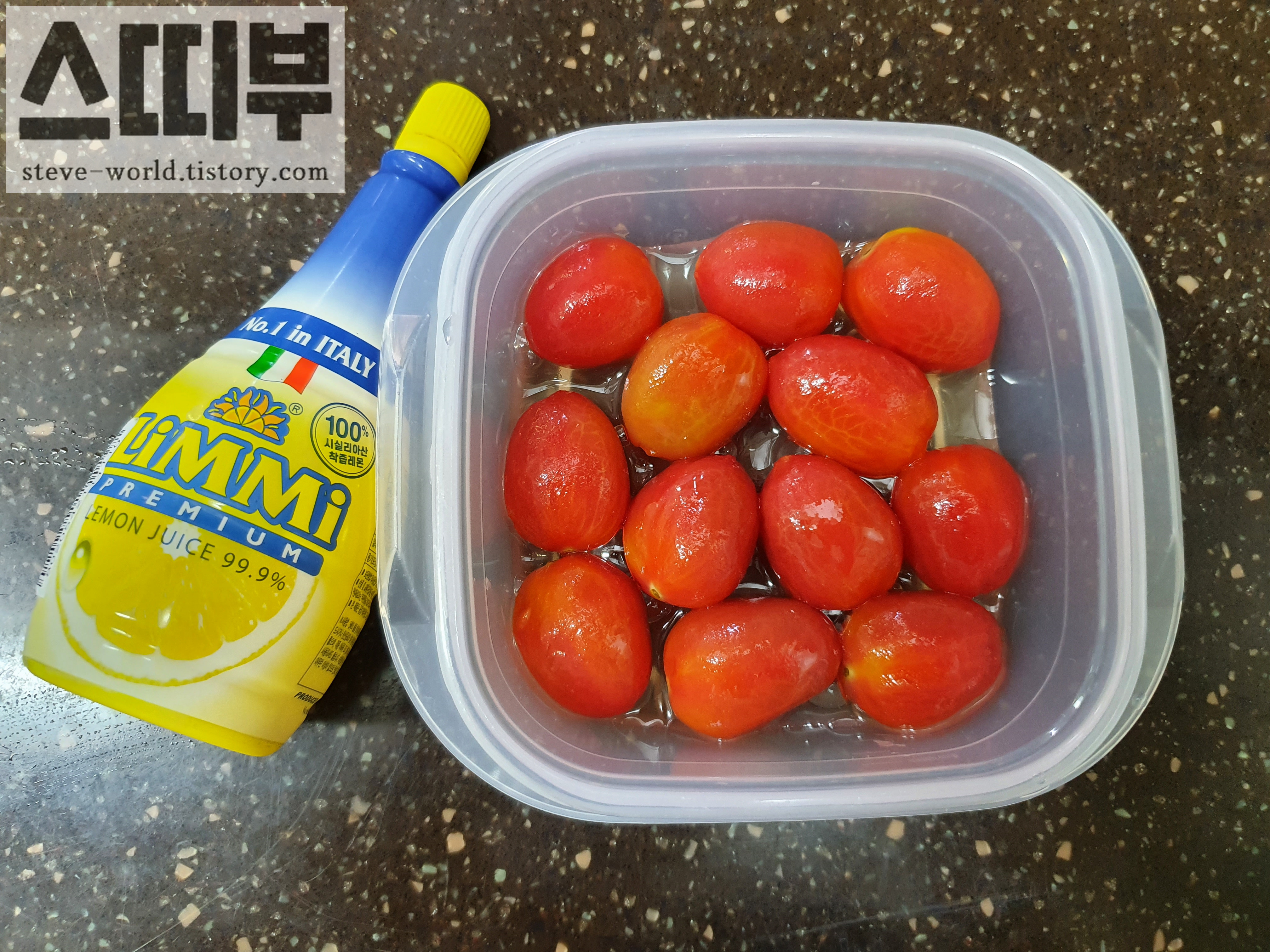 꿀은 방울토마토가 반 이상 잠길 정도로 넉넉히, 레몬즙은 두 스푼 정도 뿌려주었습니다.