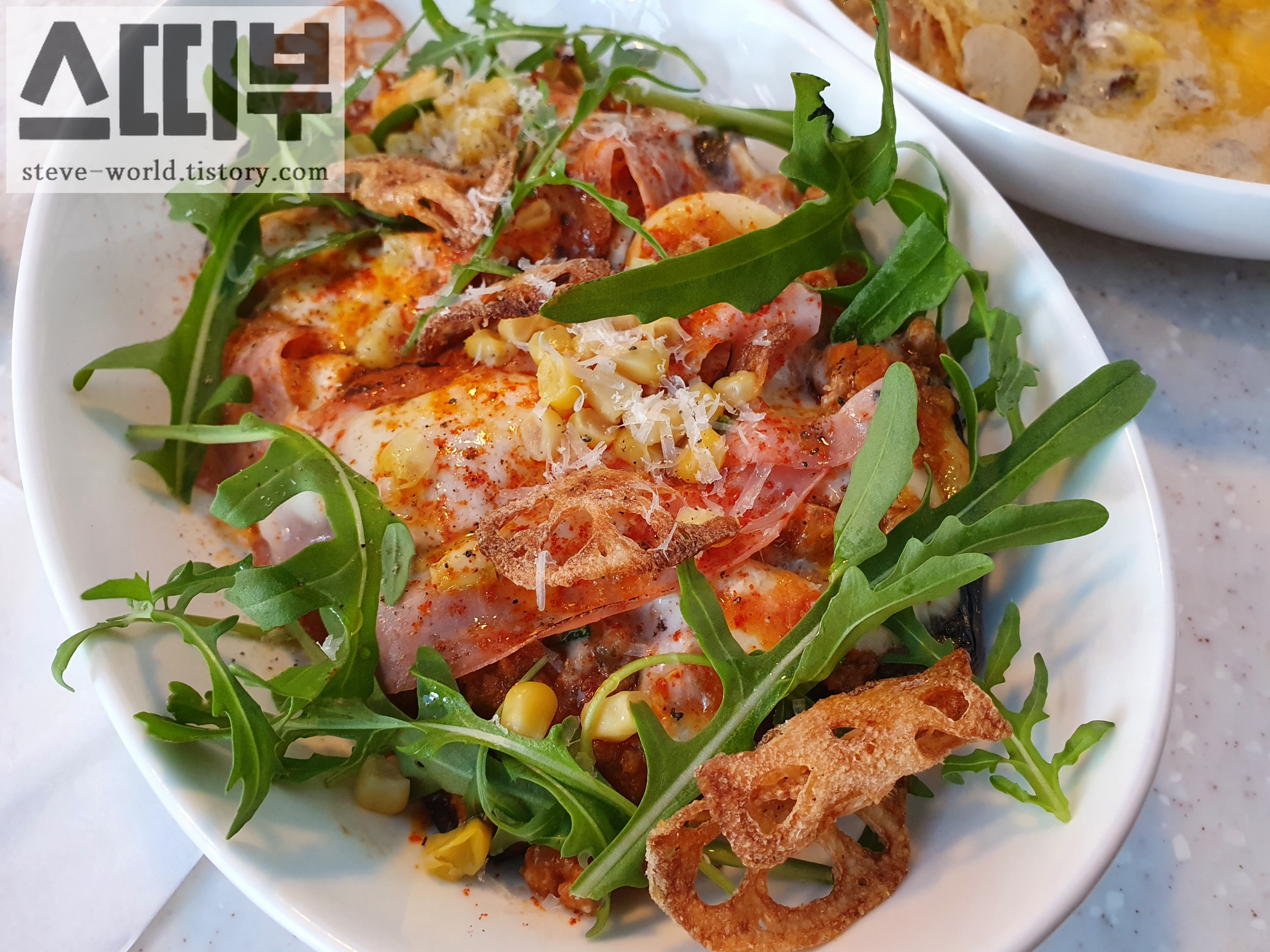 플레이팅 정말 예쁘지 않나요? 녹색의 루꼴라 잎과 얇게 튀겨진 연근, 그 사이로 보이는 빨간 라자냐의 색감이 정말 예쁩니다.