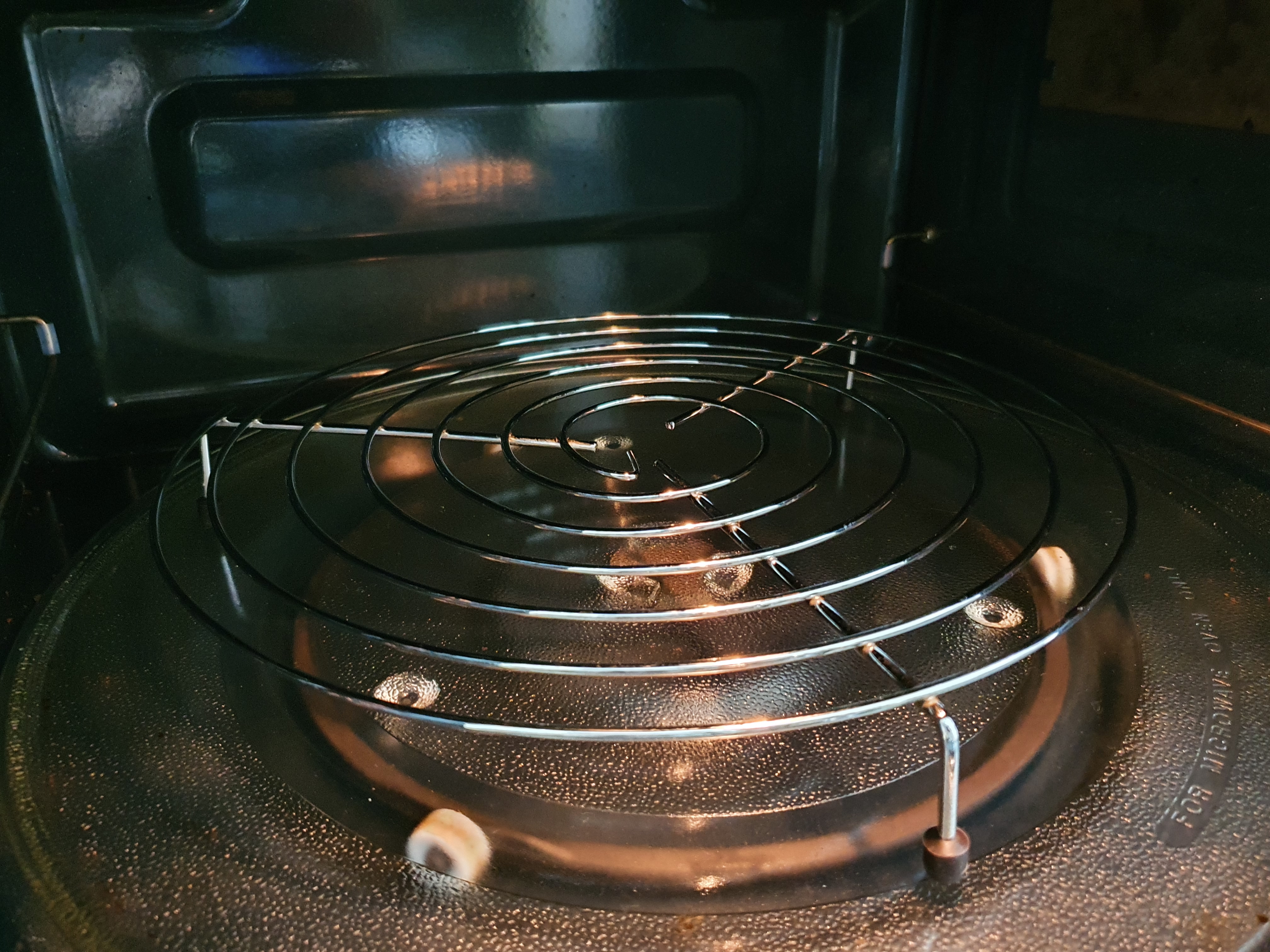[2] 탈취가 끝나면, 오븐을 열어 유리 회전판 위에 낮은 석쇠를 올린 후 오븐을 닫고 예열합니다.