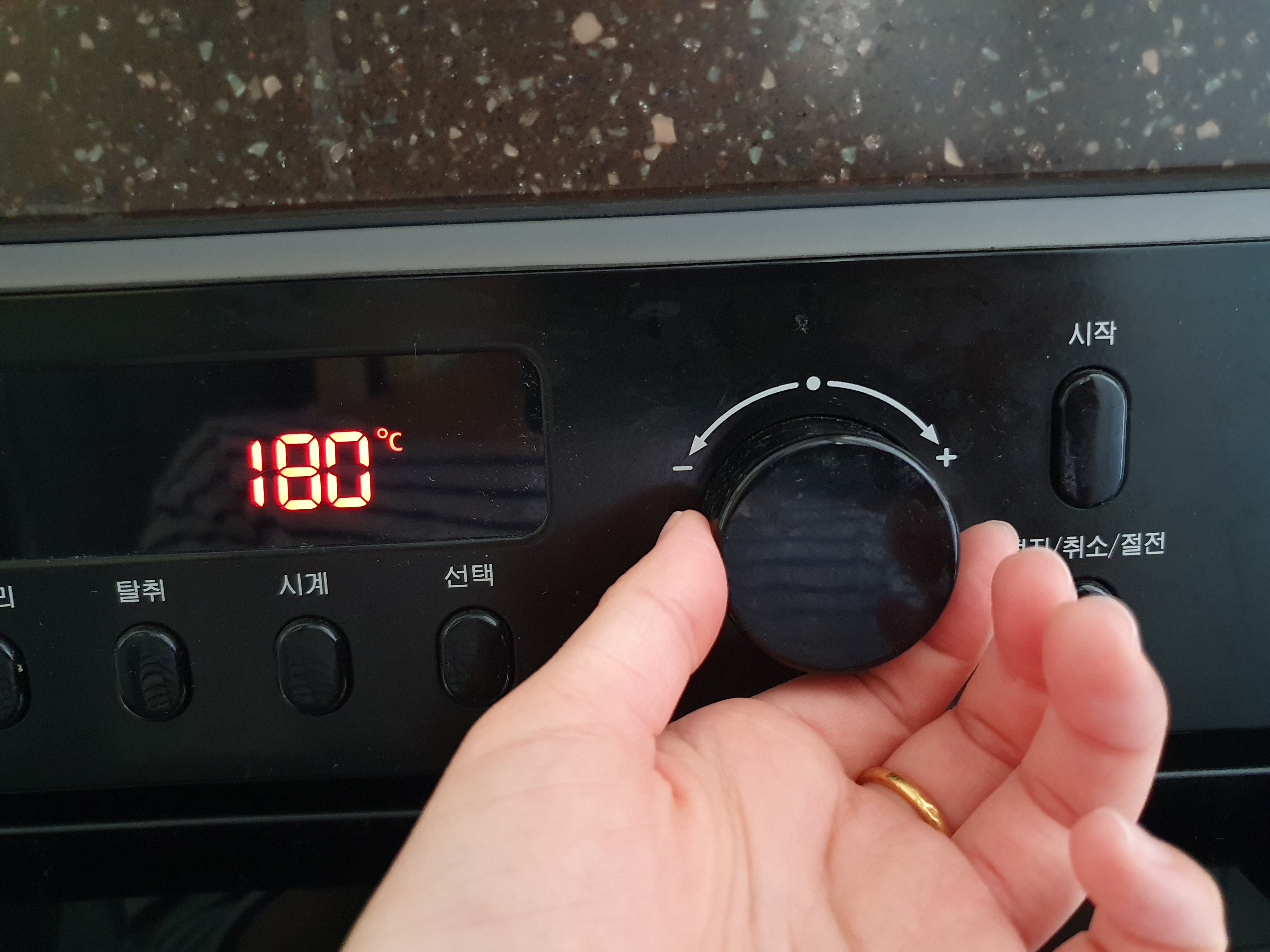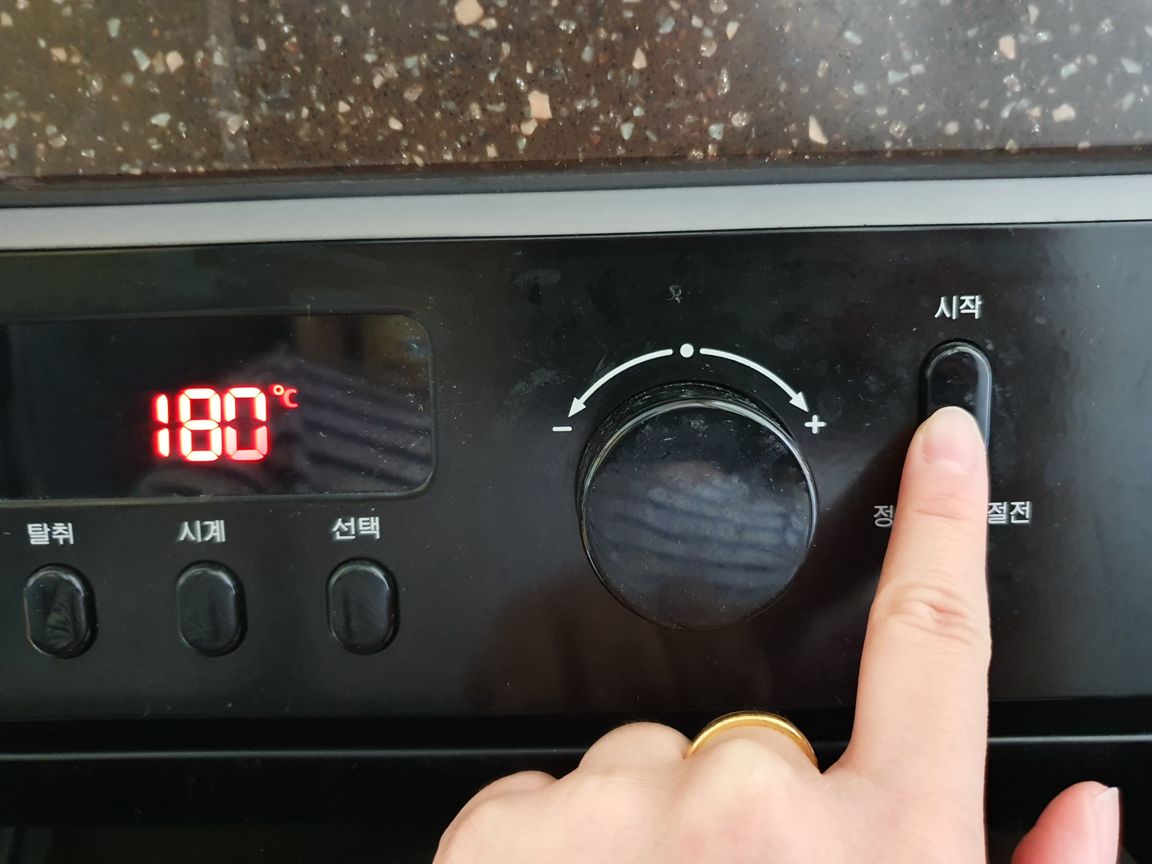 오븐 상단 좌측 다이얼을 '오븐' ▶ 우측 다이얼을 돌려서 예열하고자 하는 온도에 맞춘 후, 우측 상단의 '시작' 버튼을 누릅니다.