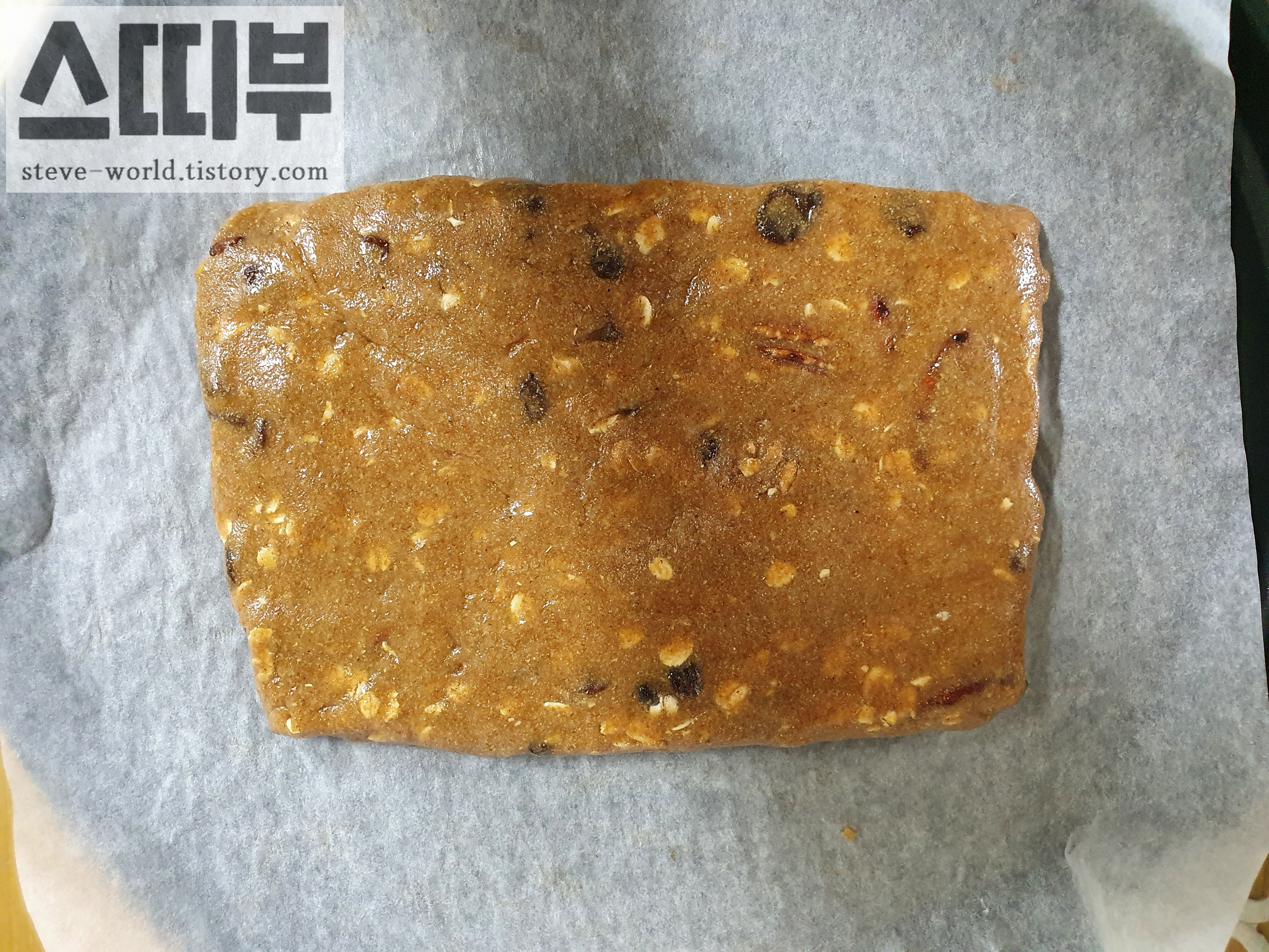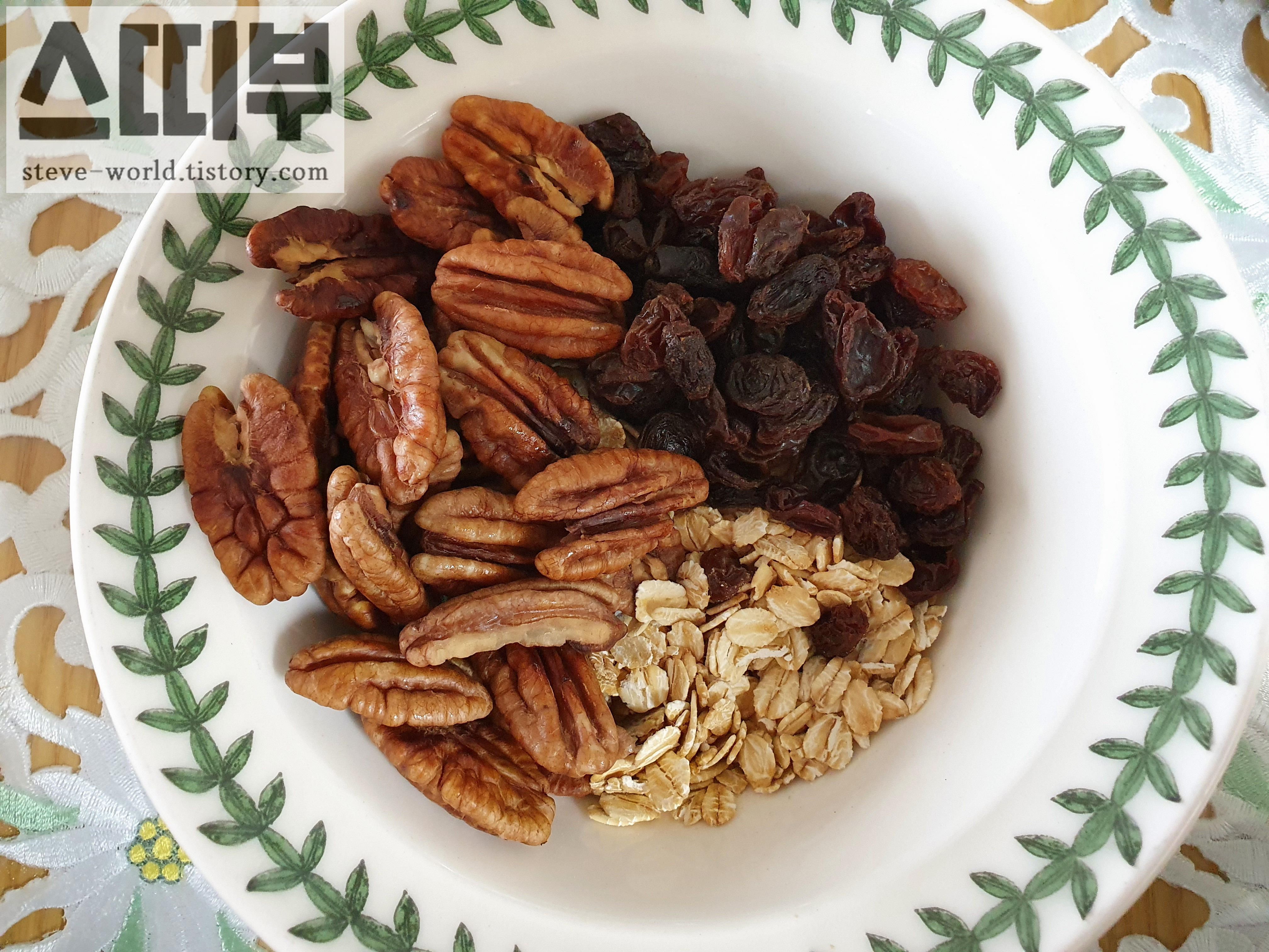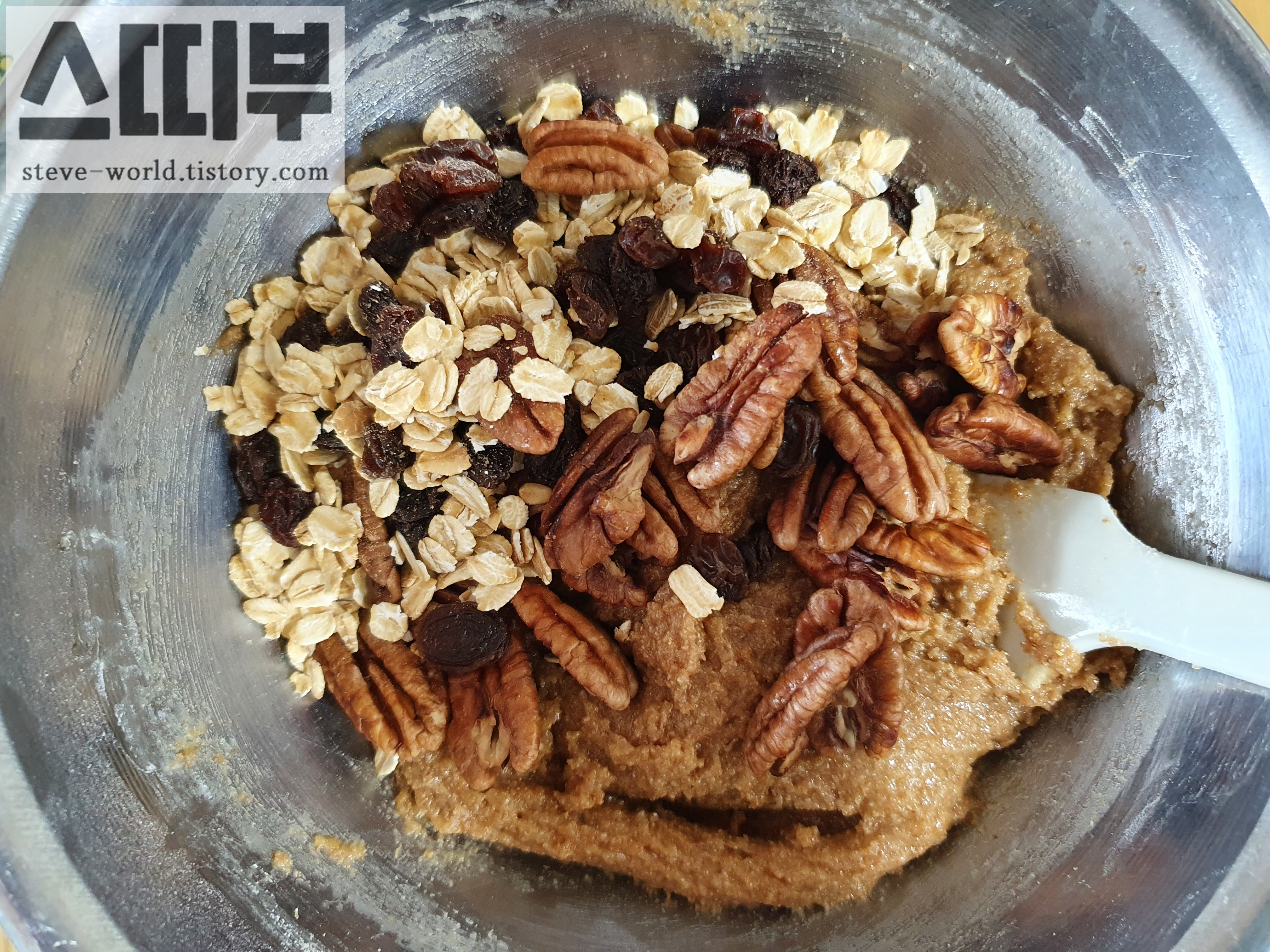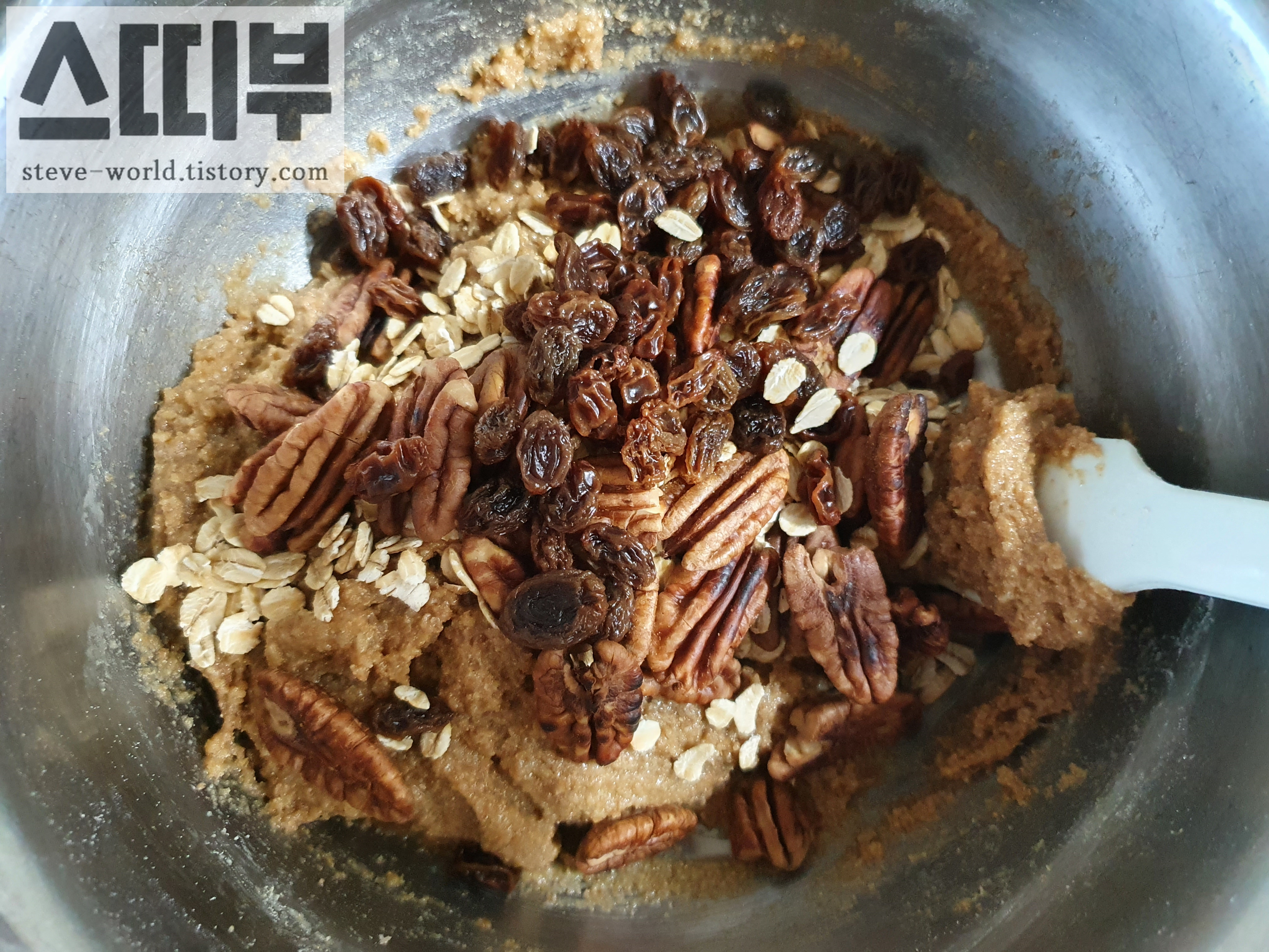 [4] 준비해둔 견과류와 건과일을 넣고 골고루 섞어줍니다. 저는 레시피대로 건포도, 오트밀, 피칸을 넣어주었습니다.
