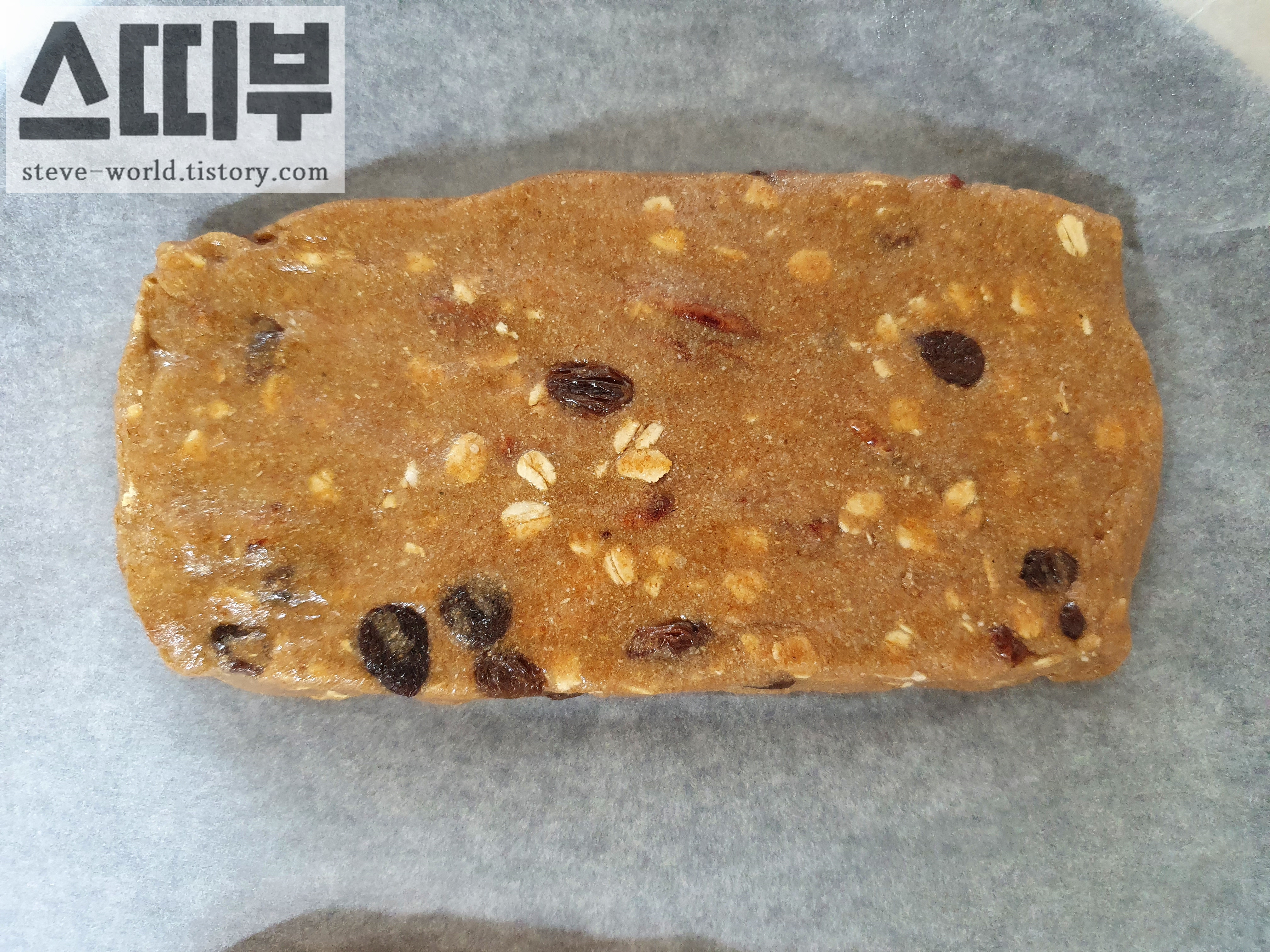 통밀가루 110g, 머스코바도 40g, 꿀 20g, 계란 40g, 식물성 오일 30g, 소금 1g, 베이킹파우더 1g, 건포도 25g, 오트밀 15g, 피칸 30g