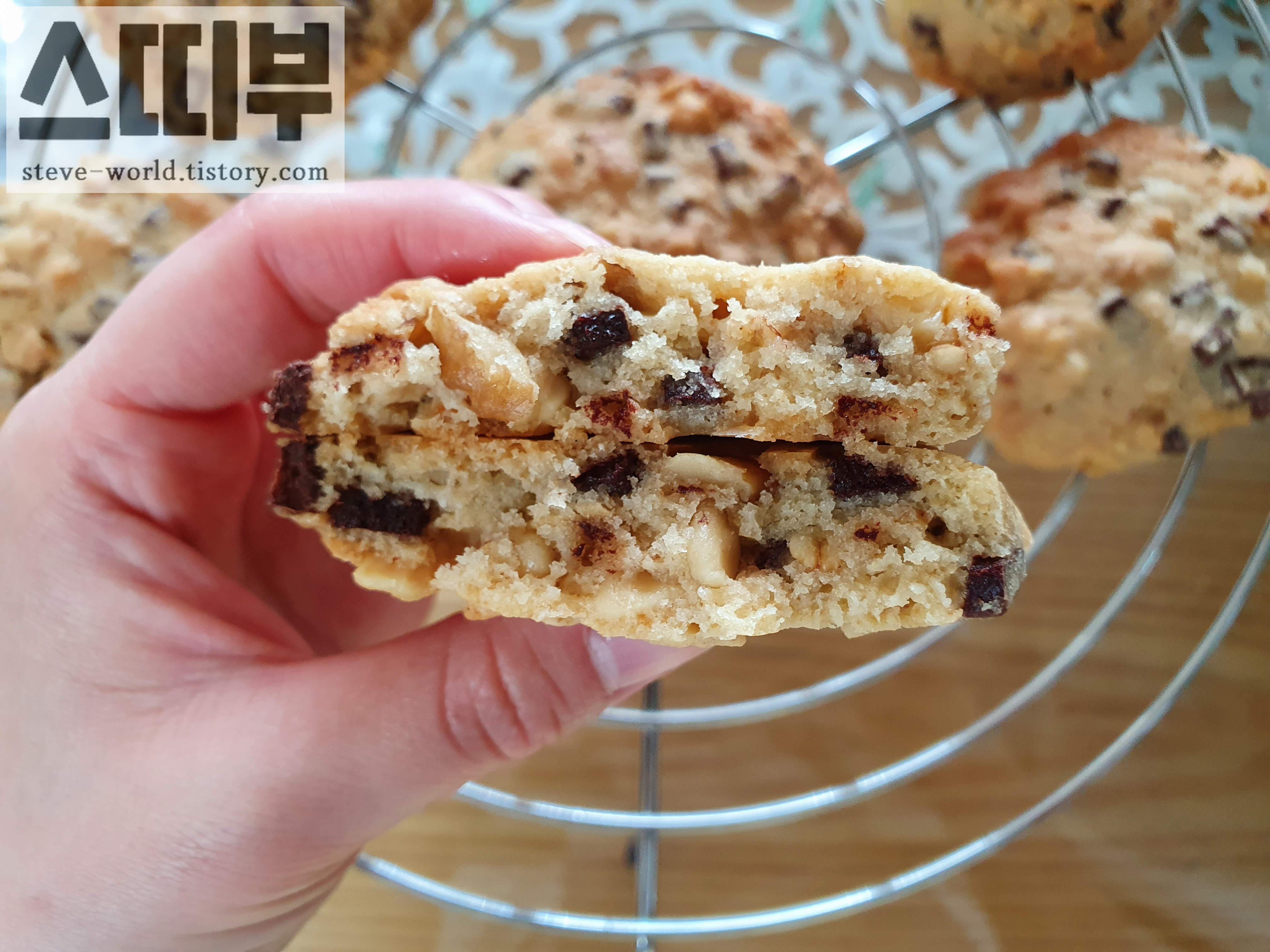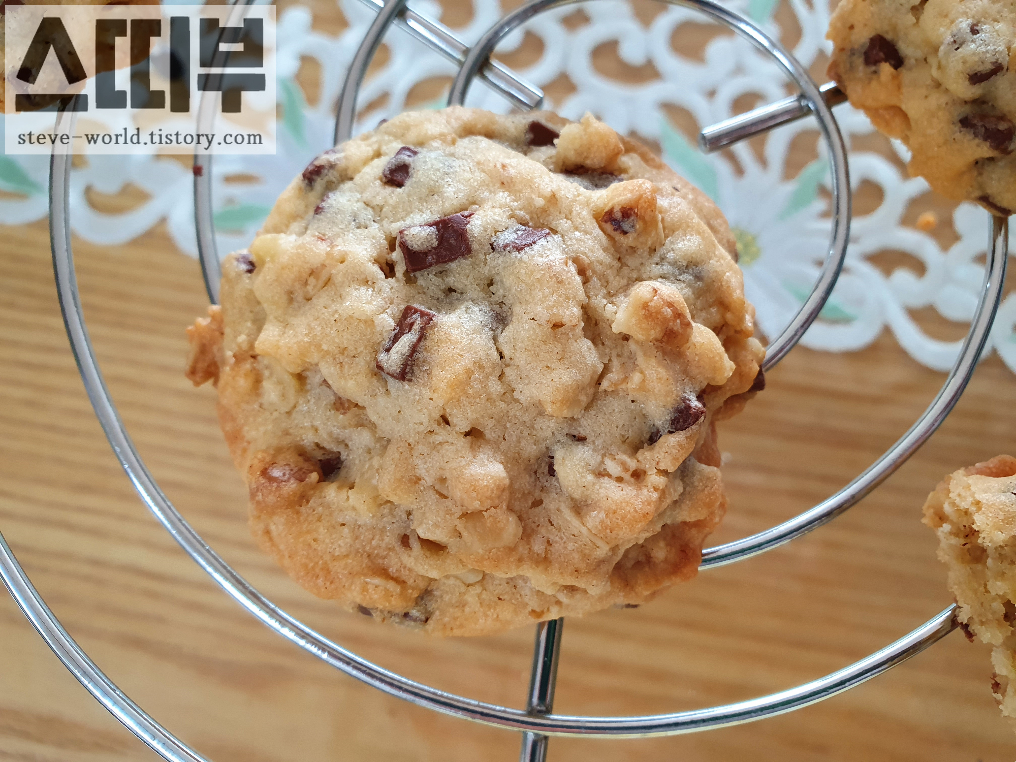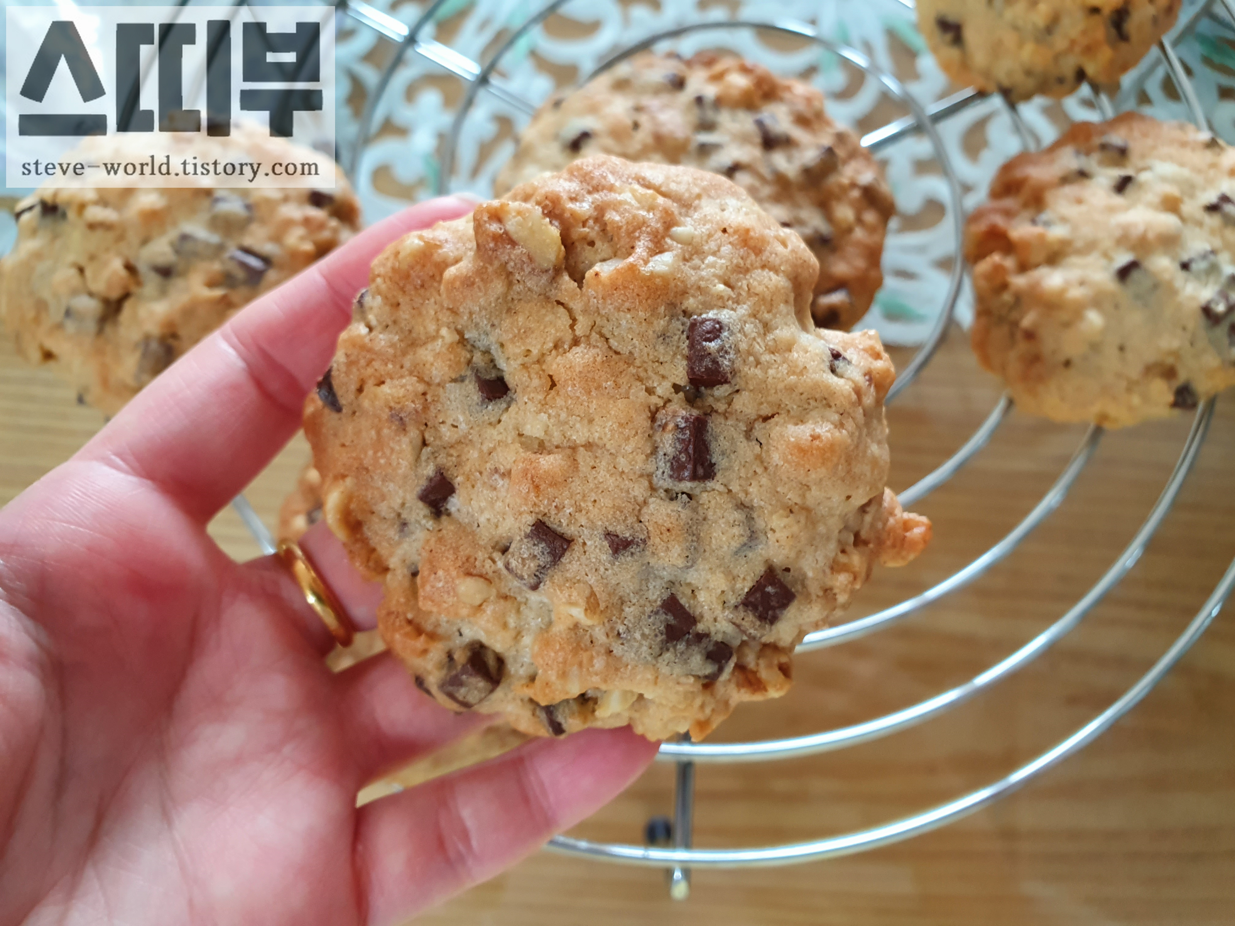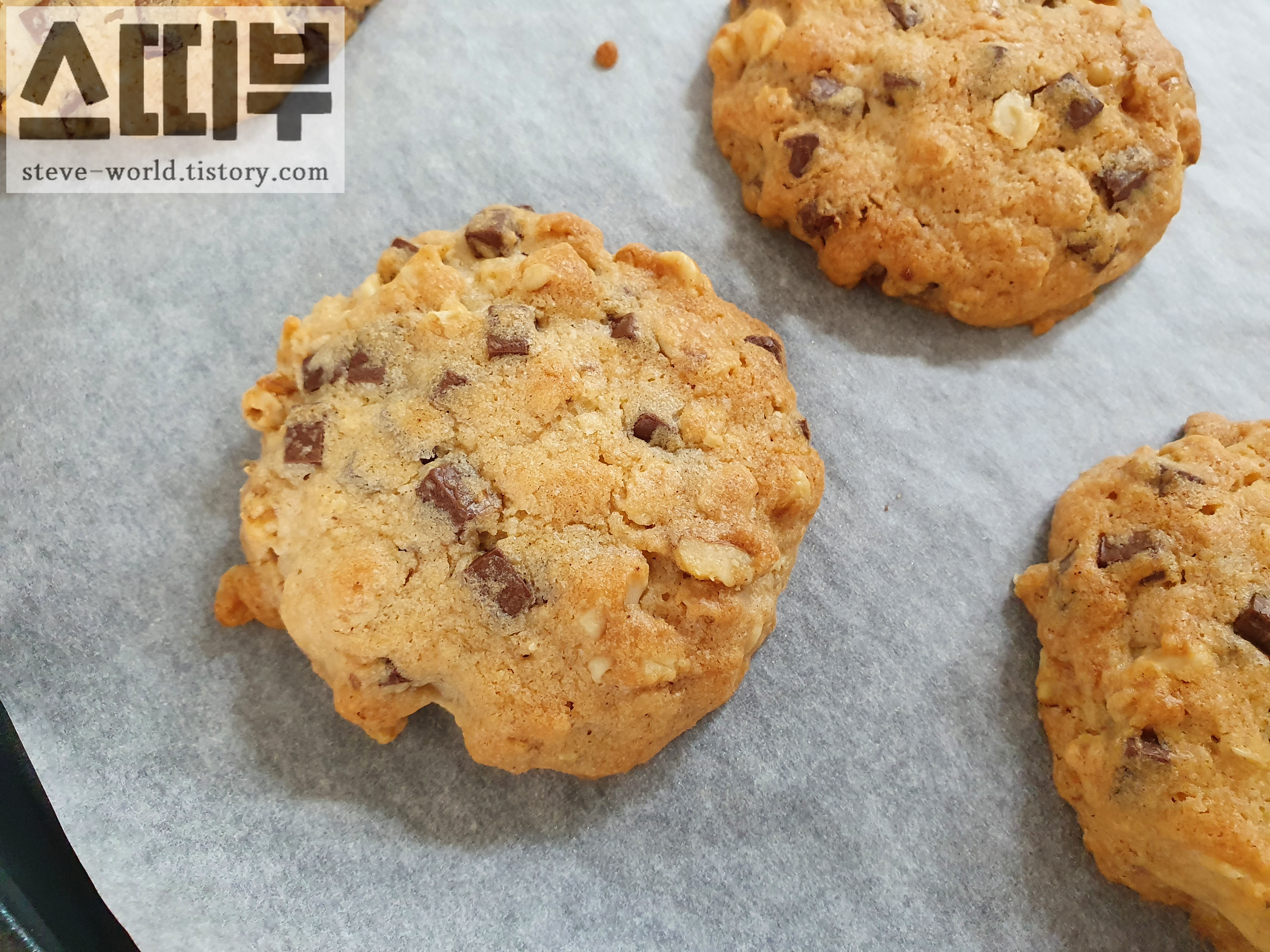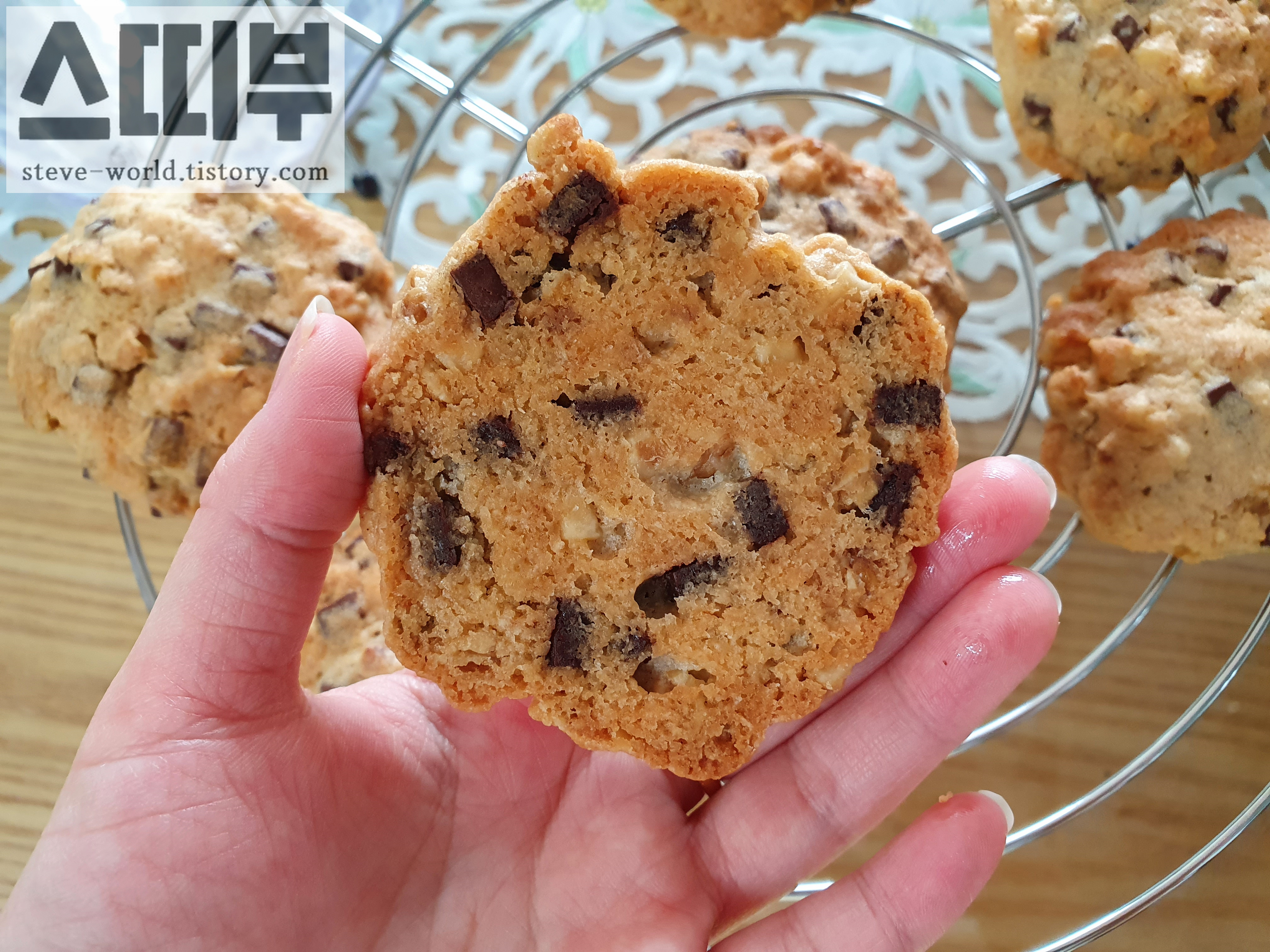 무염버터 113g, 백설탕 85g, 황설탕 79g, 계란 50g, 바닐라 익스트랙 3g, 레몬즙 1g, 중력분 163g, 오트밀 23g, 베이킹소다 2.4g, 소금 3g, 다크 초코칩 240g, 다진 호두 110g, 시나몬 파우더 한 꼬집