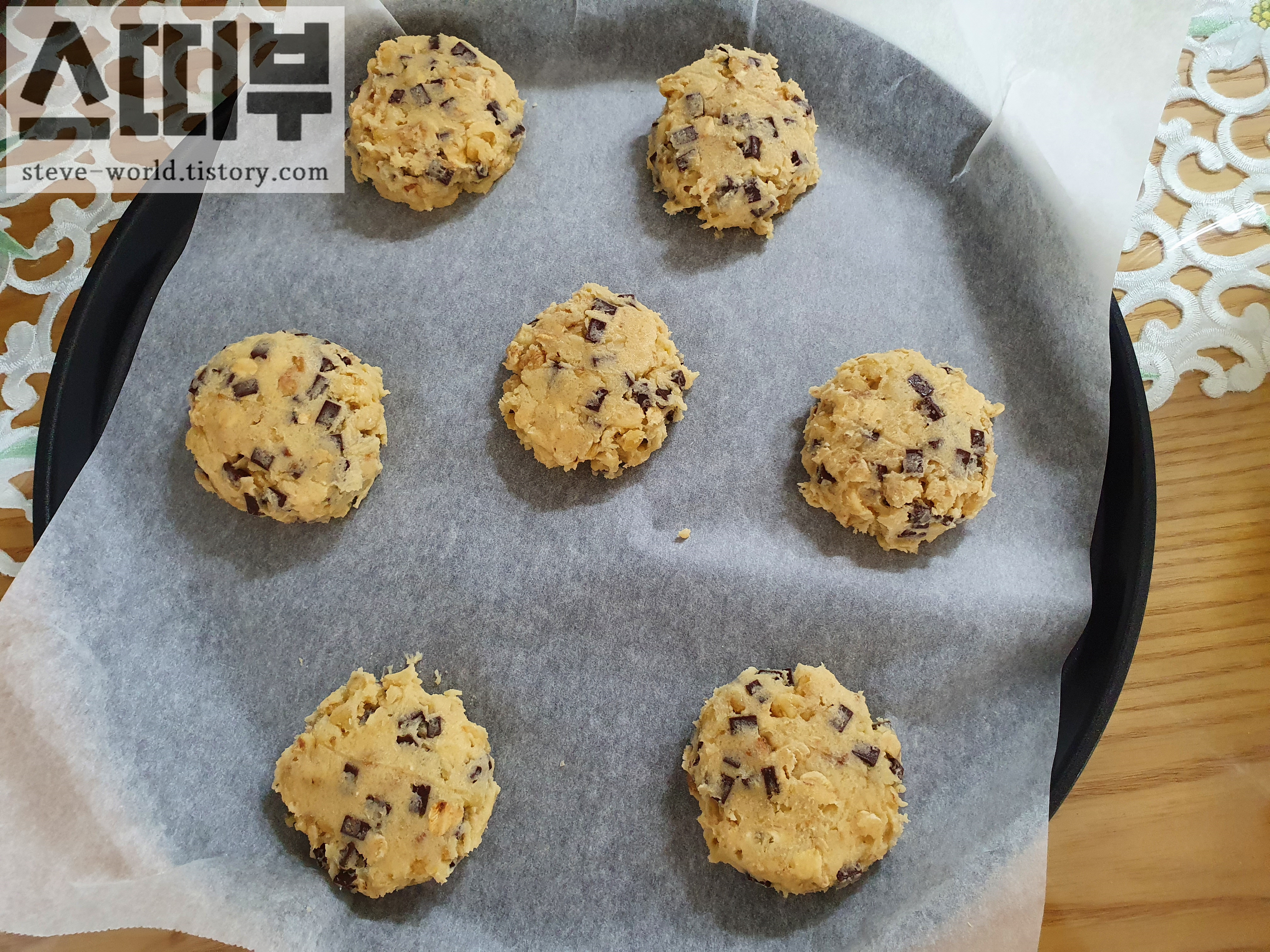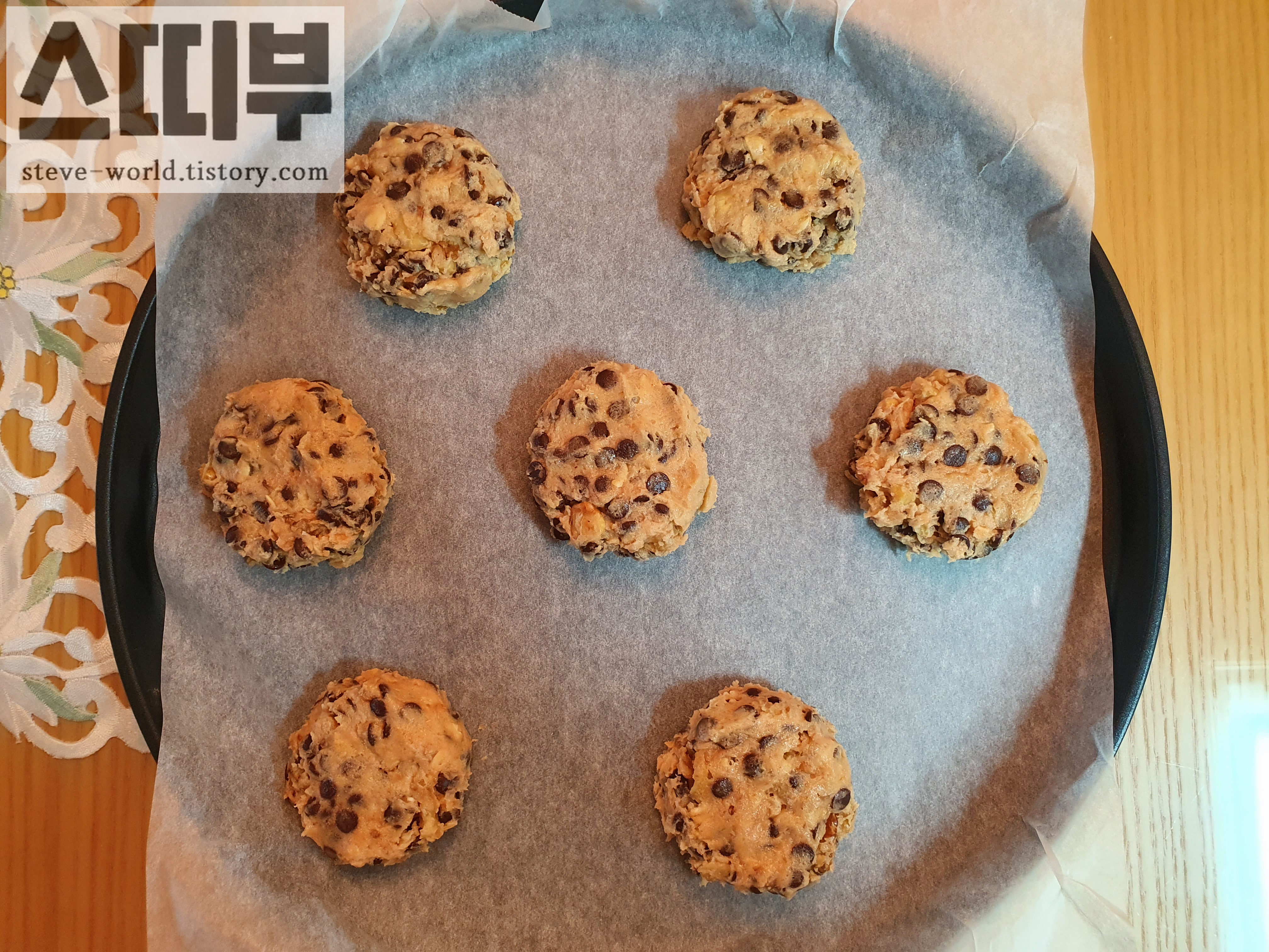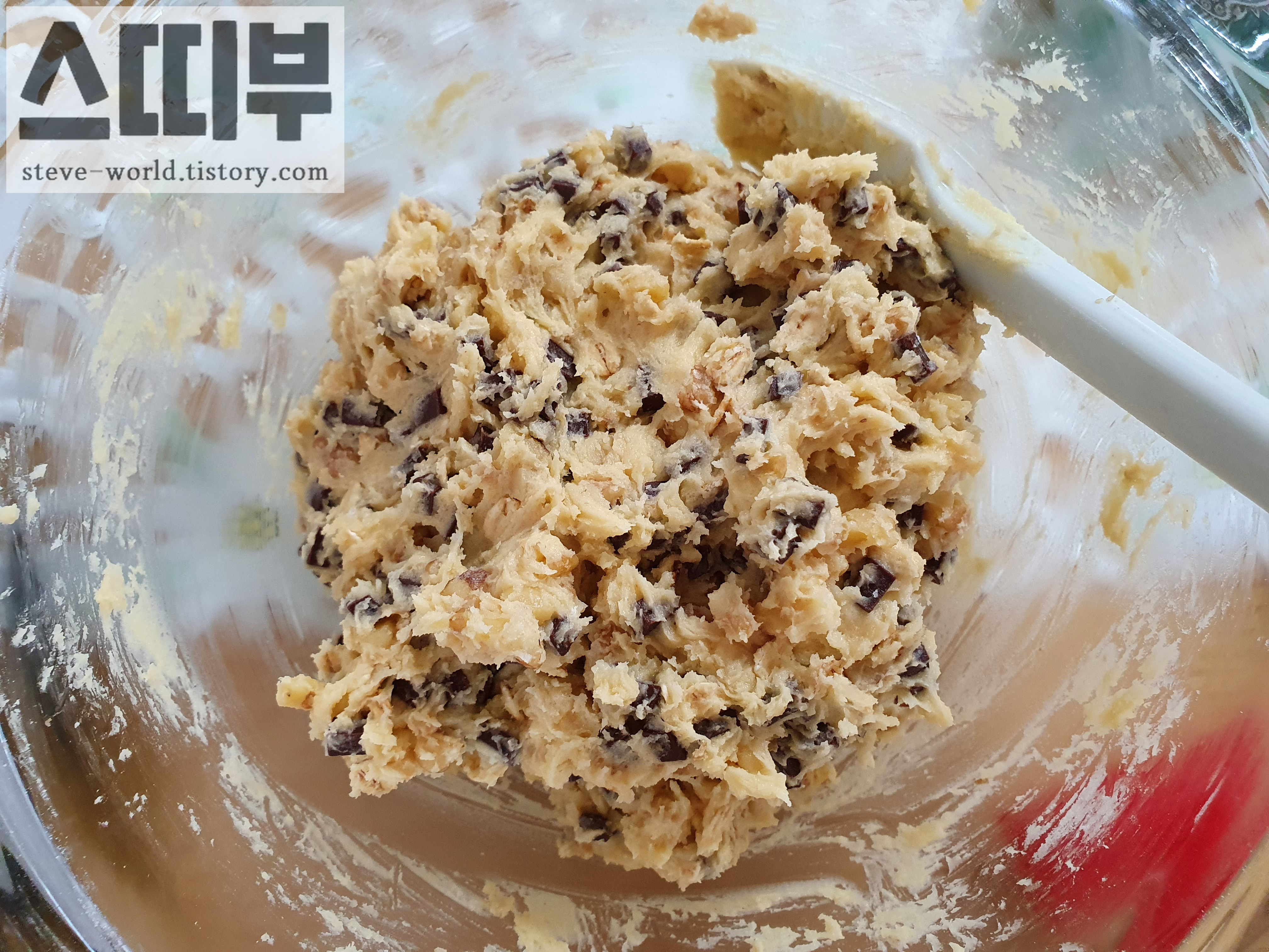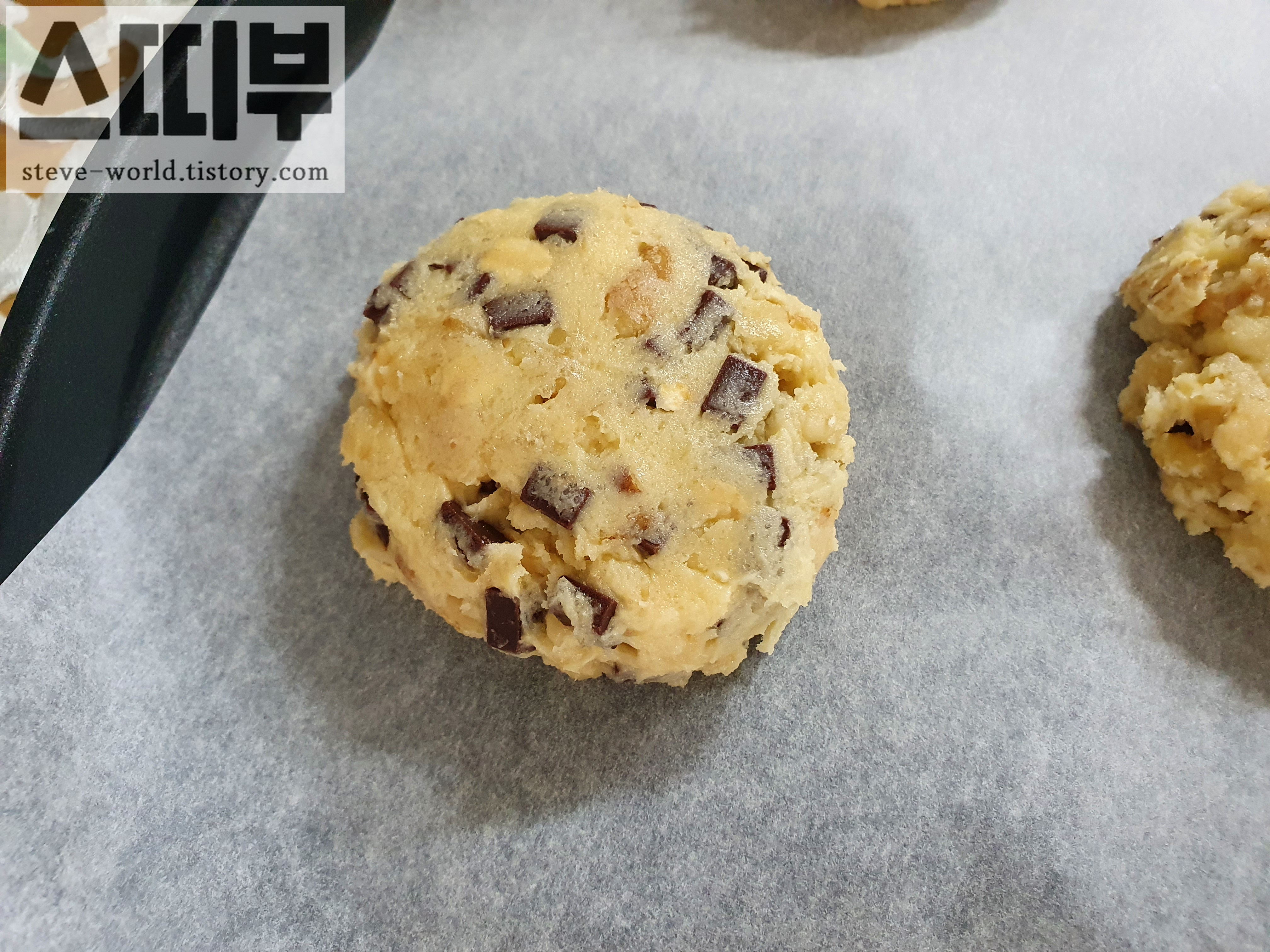 - 저는 다크 초코칩이 없어서 일반 초코칩을 사용했습니다. 다크 초코칩을 넣으면 좀 더 카카오향이 짙고 덜 단 초코칩이 될 것 같아요. 다음엔 다크 초코칩을 넣어 도전해보겠습니다.