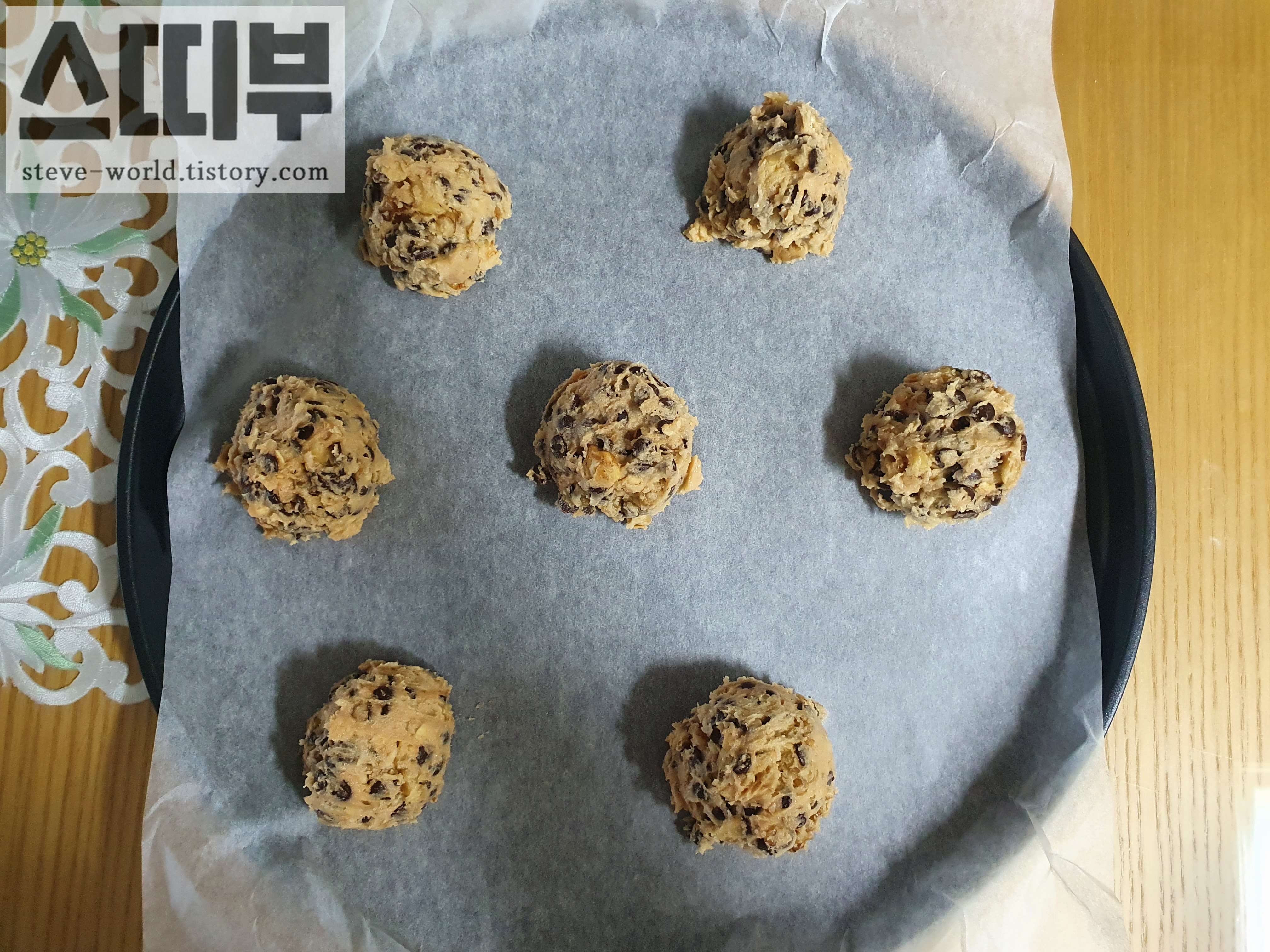 [6] 지름 50mm 스쿱으로 간격을 두고 팬닝 합니다. 스쿱이 없다면 적당한 크기로 둥글게 뭉쳐서 팬닝 해주세요.