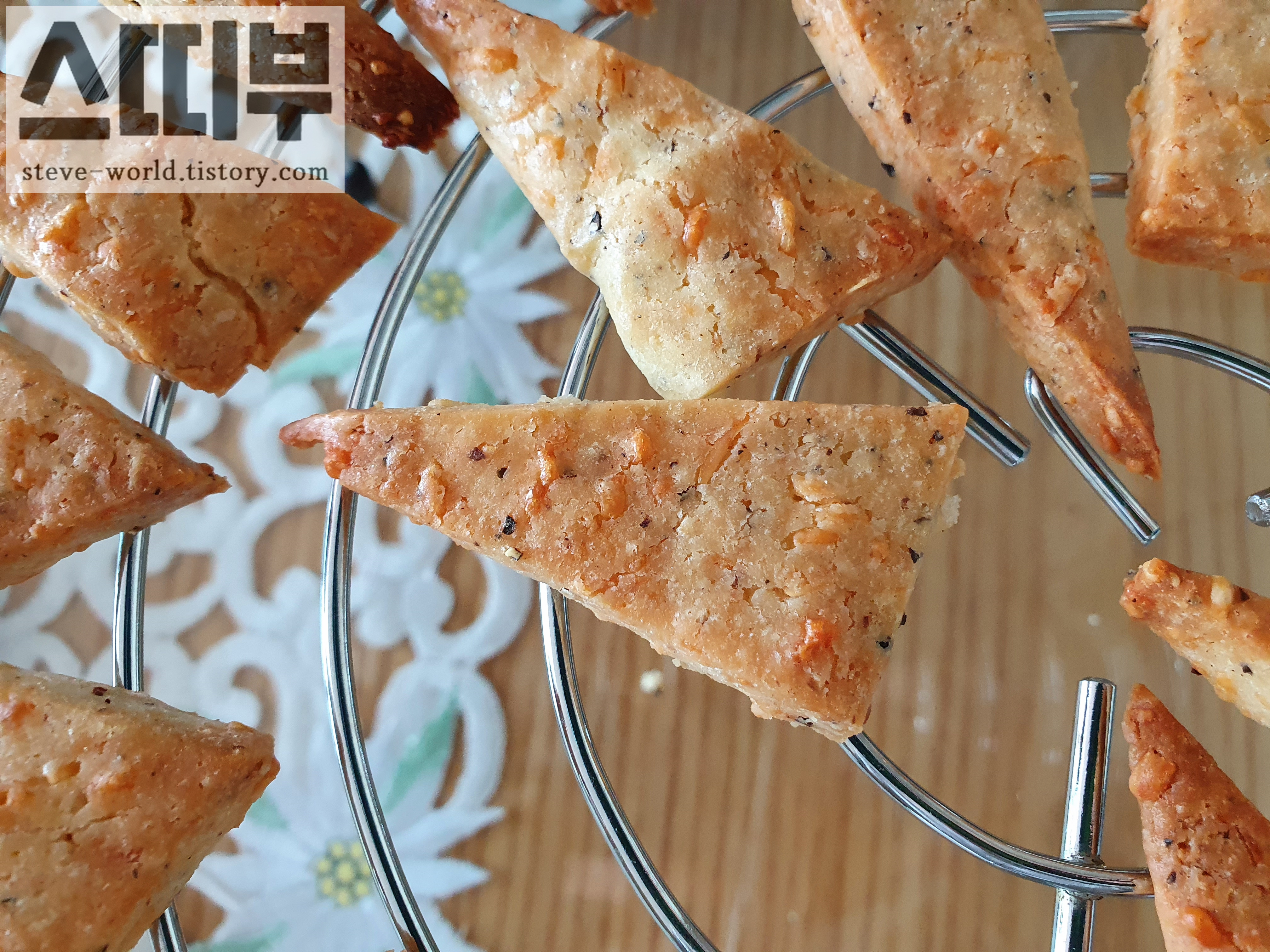 넷플릭스 보면서 콜라를 옆에 두고 쿠키를 야금야금 집어먹었는데 영화 한 편 끝나기도 전에 다 먹었습니다. 매콤한 후추 덕분에 쿠키 특유의 느끼함을 느낄 새 없이 입 안에 계속 들어가는 것 같아요. 치즈의 고소 짭조름함과 매콤한 쿠키, 버터의 풍미까지 너무 좋았습니다. 짭조름한 맥주 안주가 필요할 때 꼭꼭 만들어보세요!
