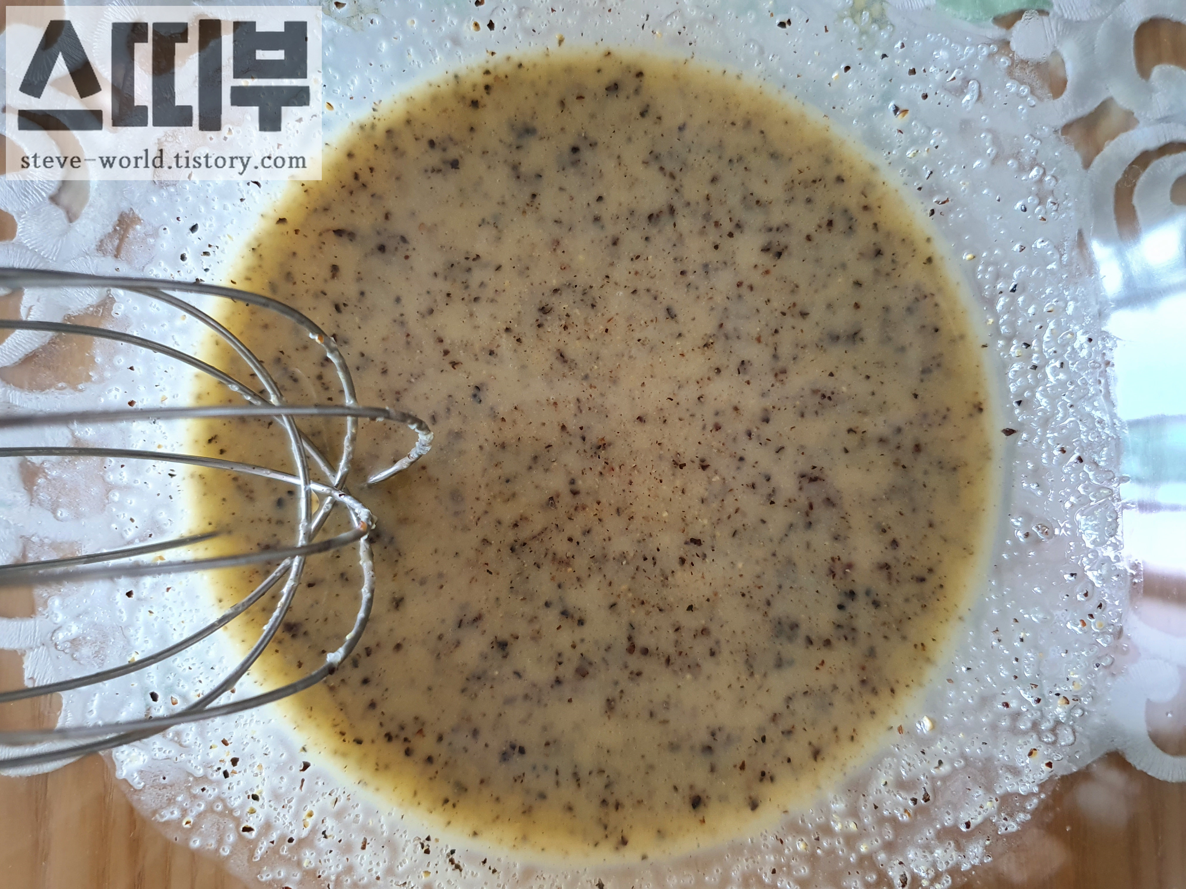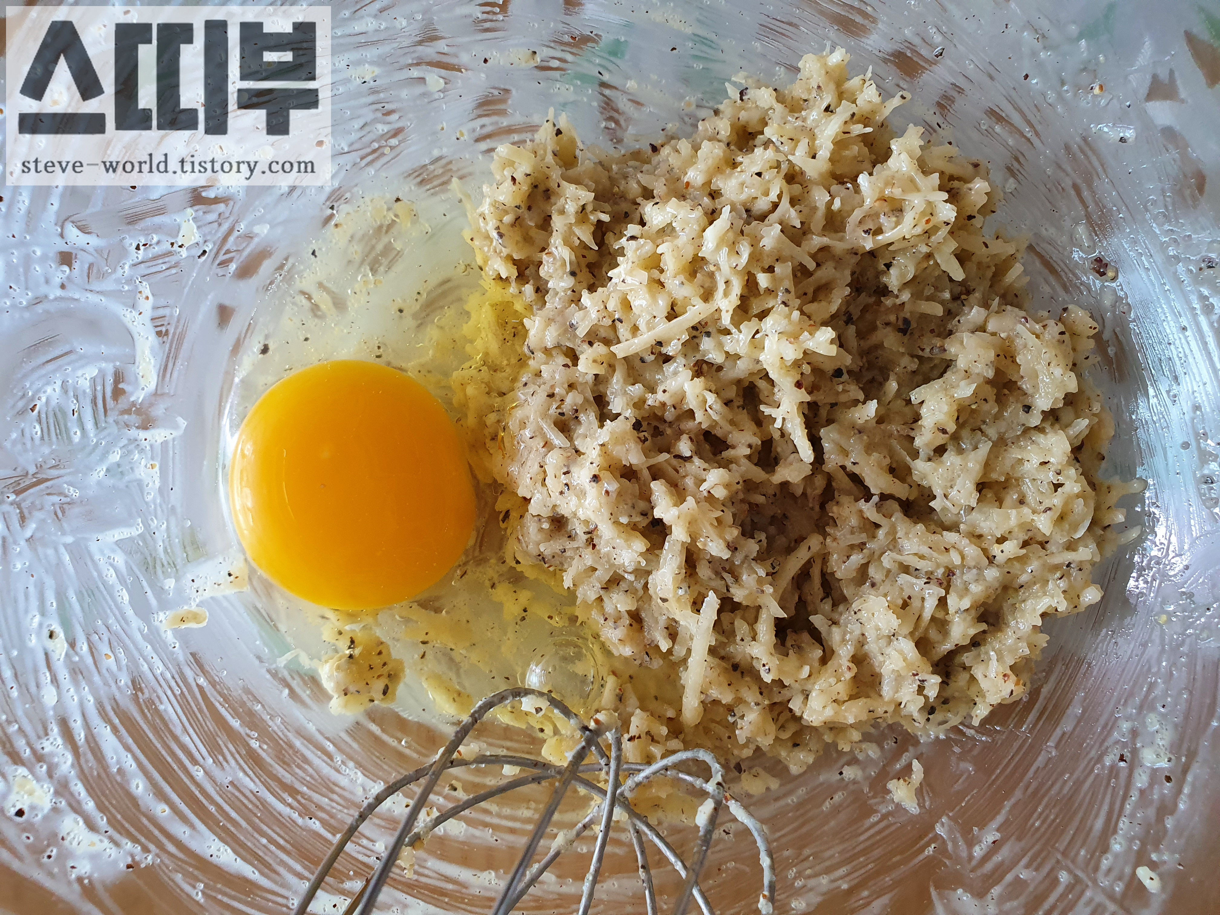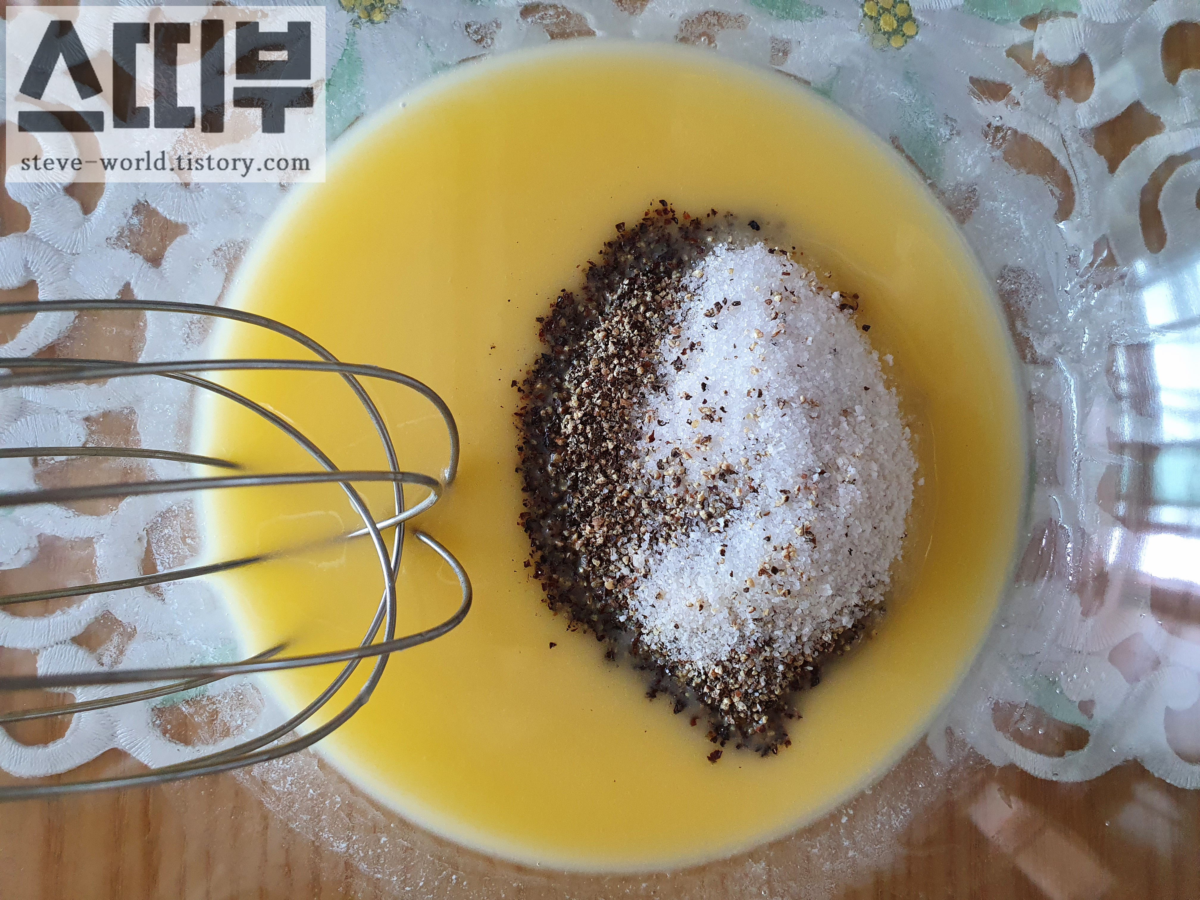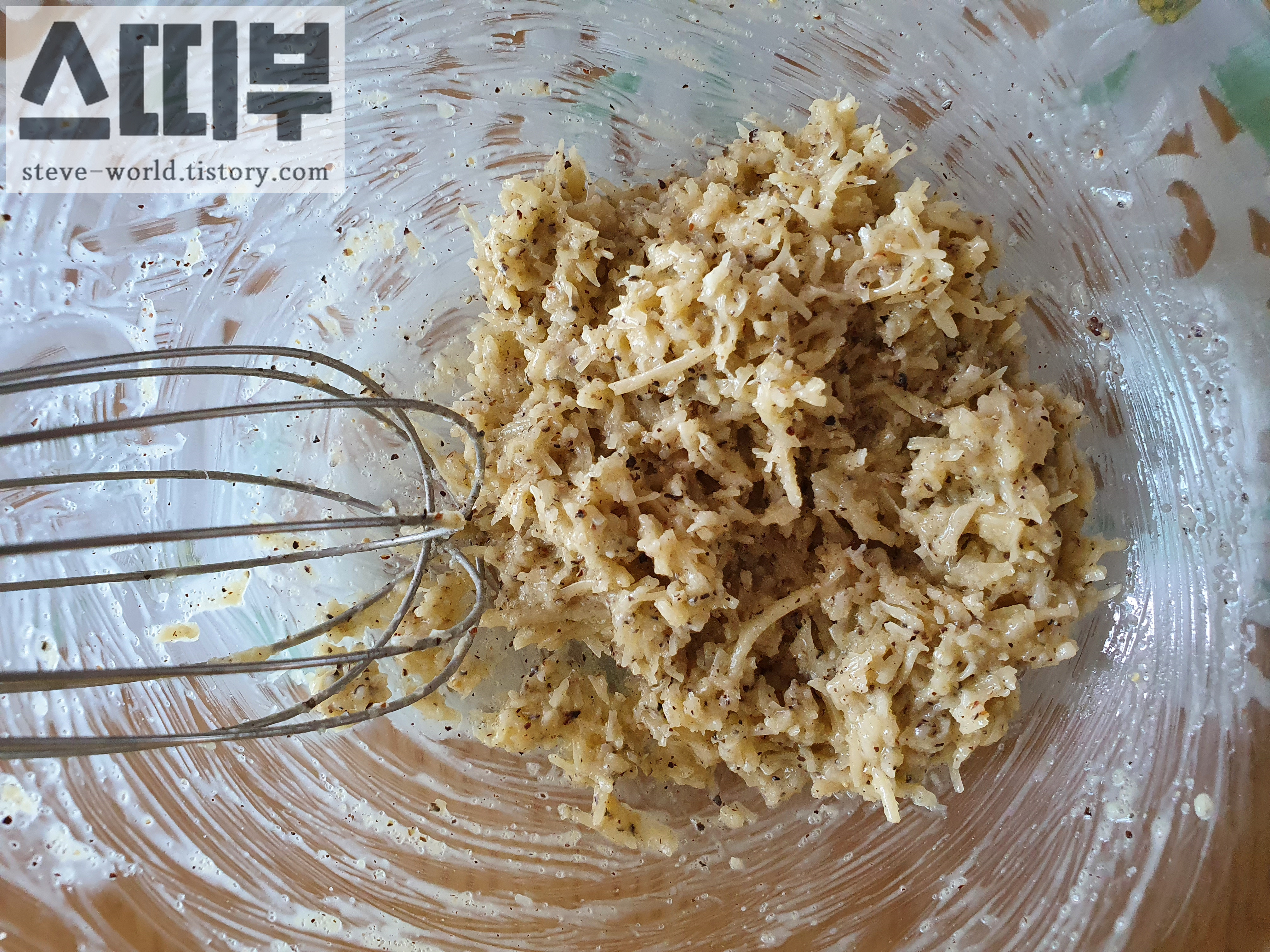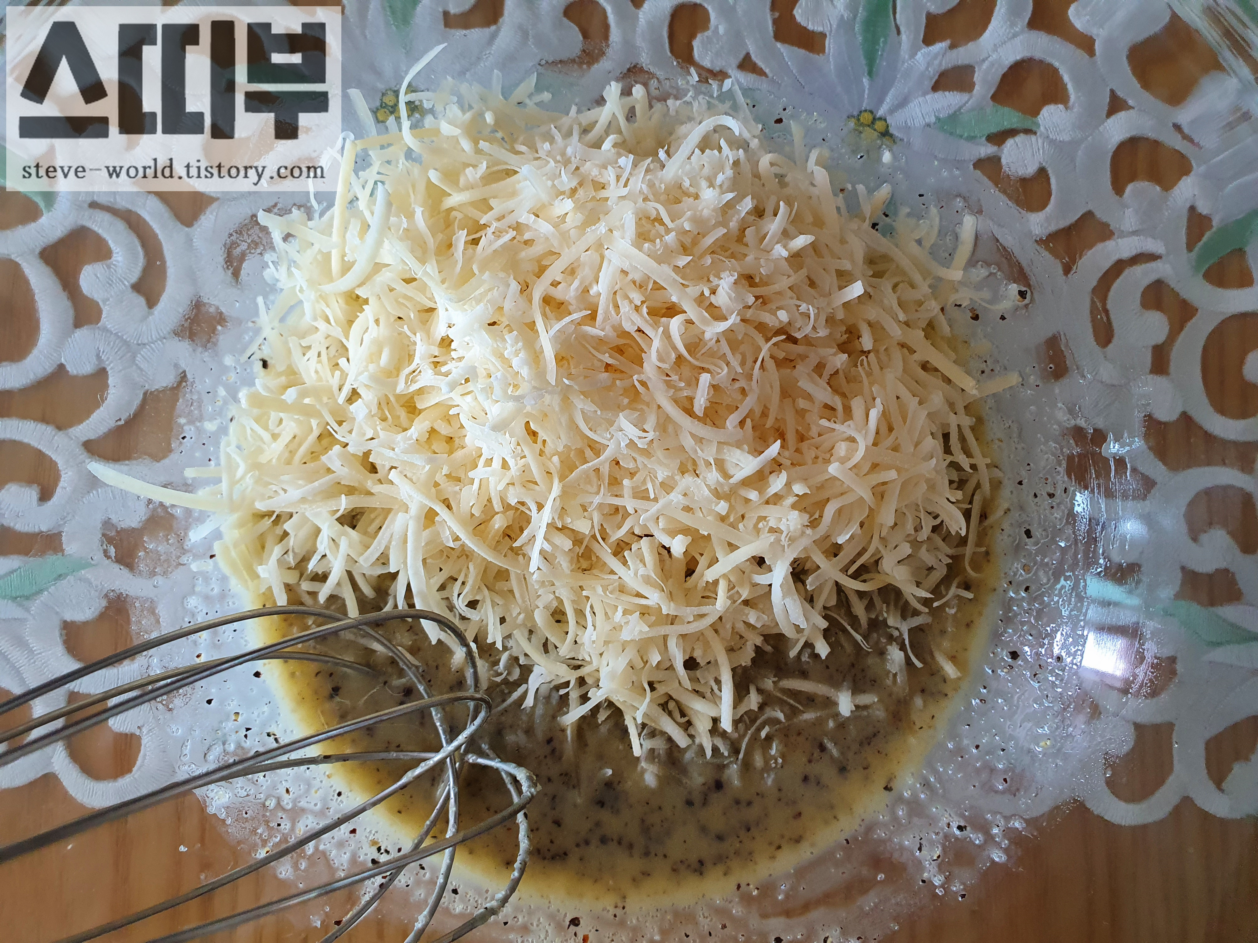 [2] 설탕, 소금, 그라인더로 간 통후추, 곱게 간 파마산 치즈를 넣고 손 거품기로 잘 섞습니다.