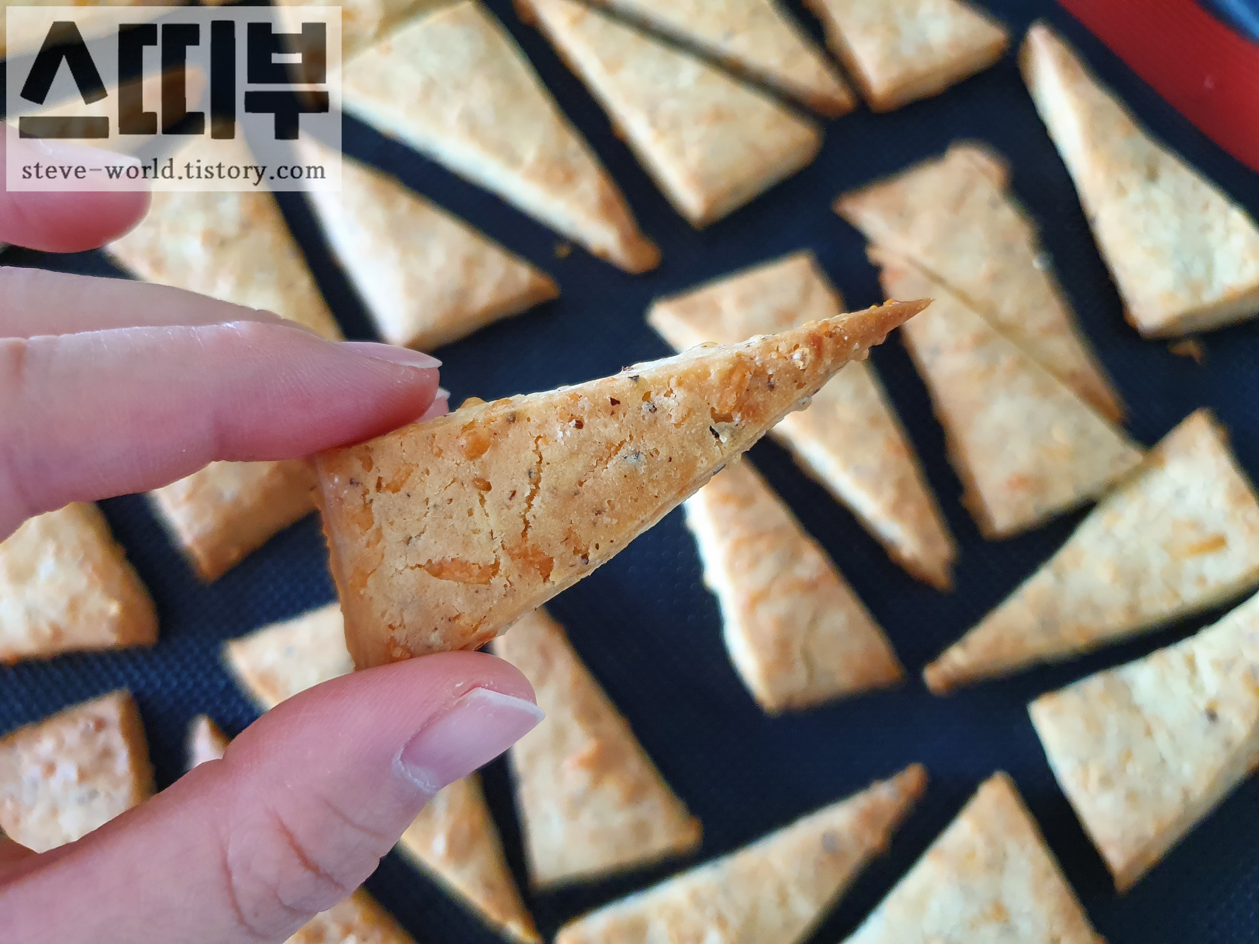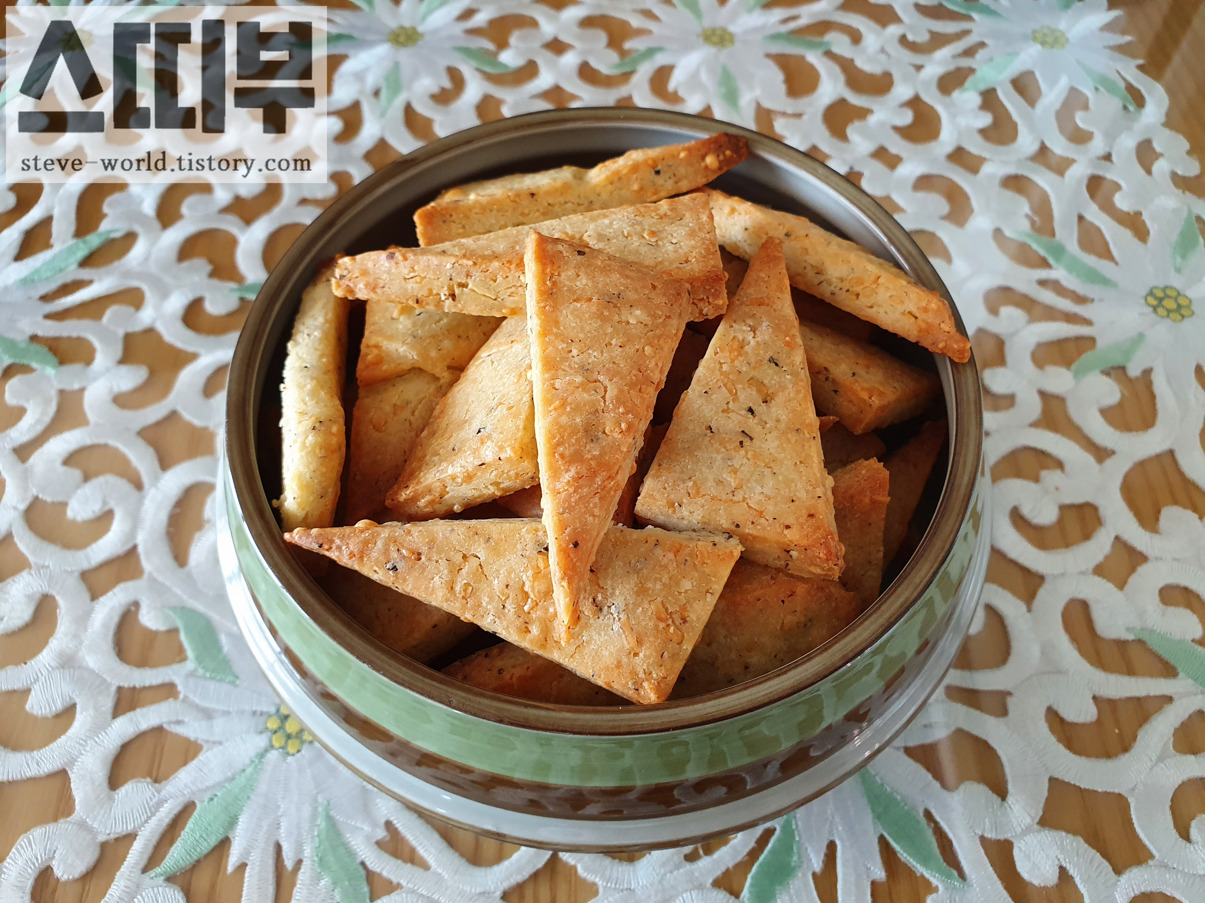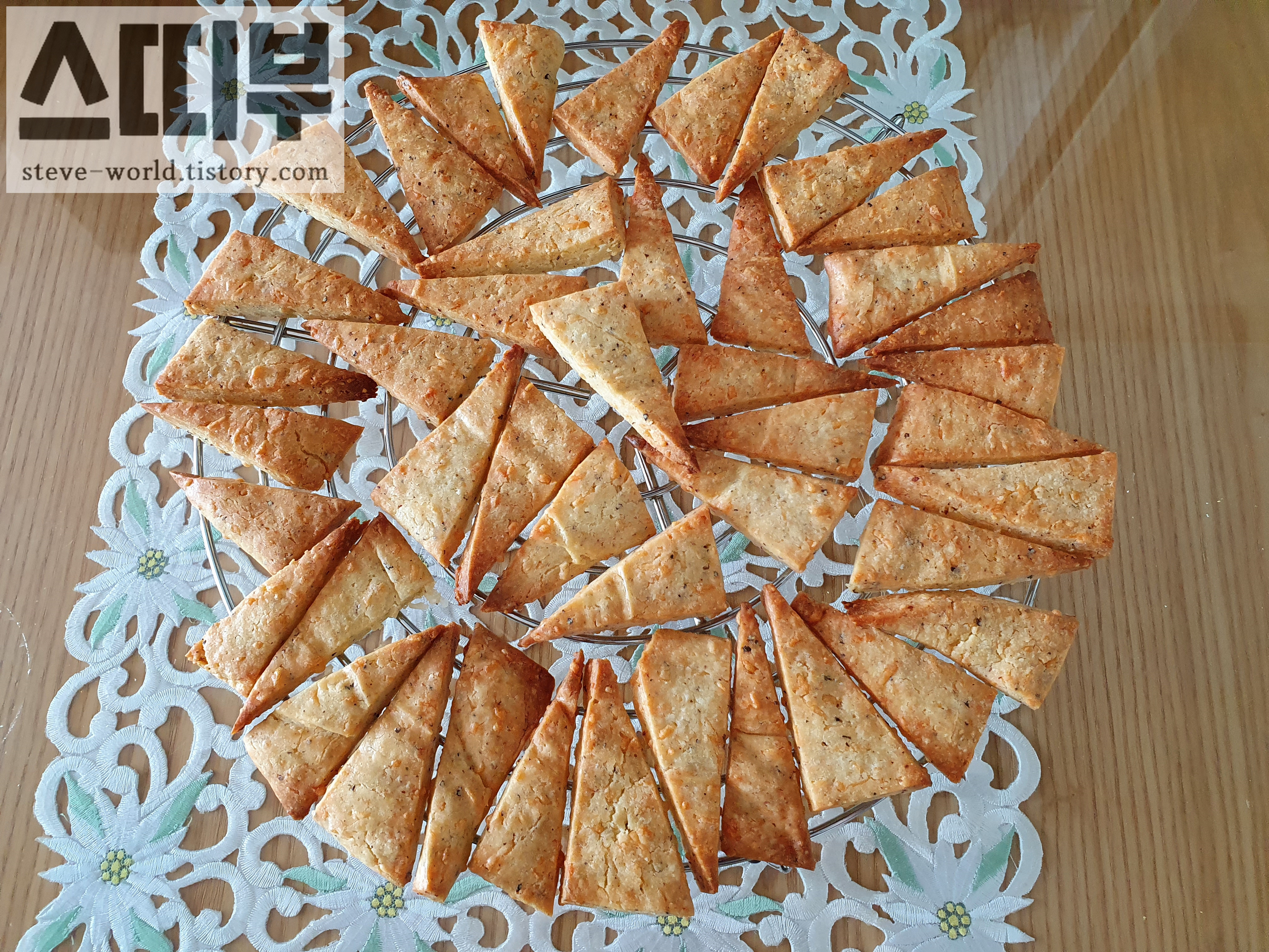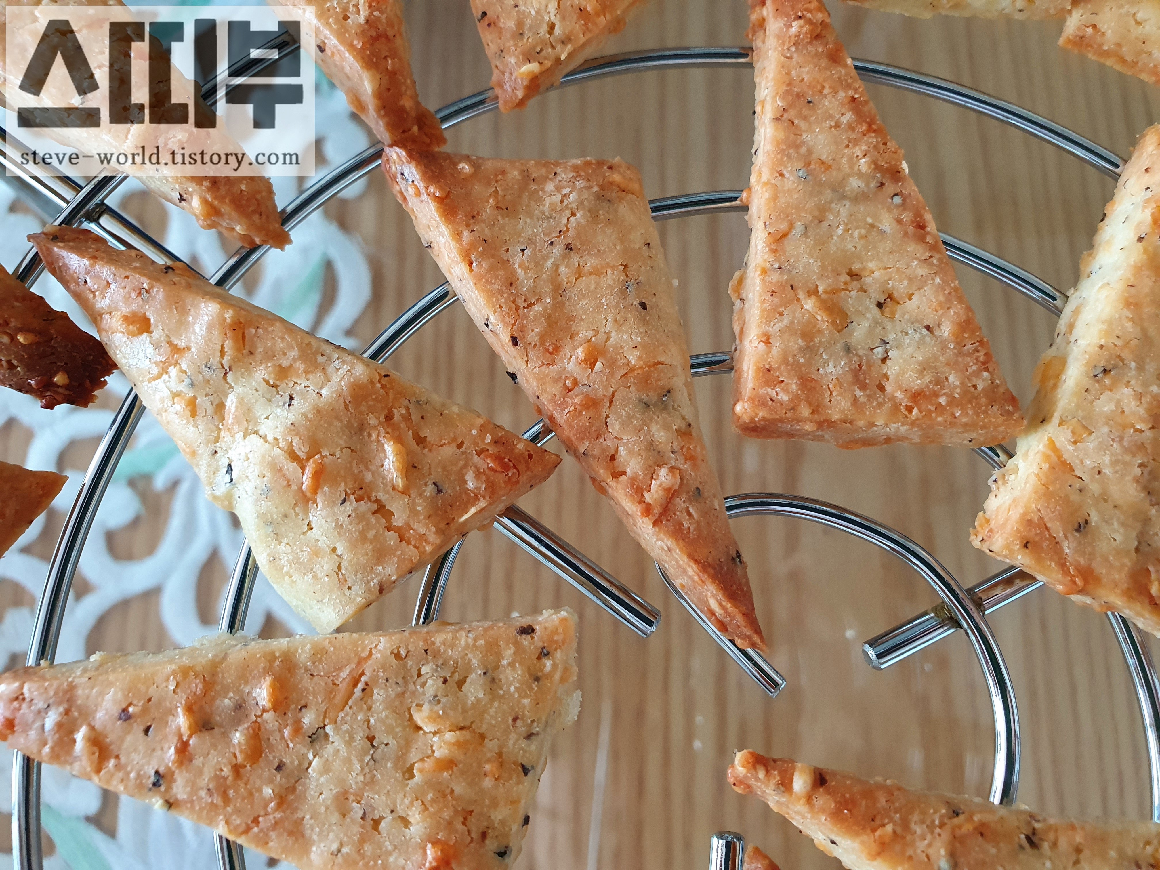 넷플릭스 보면서 콜라를 옆에 두고 쿠키를 야금야금 집어먹었는데 영화 한 편 끝나기도 전에 다 먹었습니다. 매콤한 후추 덕분에 쿠키 특유의 느끼함을 느낄 새 없이 입 안에 계속 들어가는 것 같아요. 치즈의 고소 짭조름함과 매콤한 쿠키, 버터의 풍미까지 너무 좋았습니다. 짭조름한 맥주 안주가 필요할 때 꼭꼭 만들어보세요!
