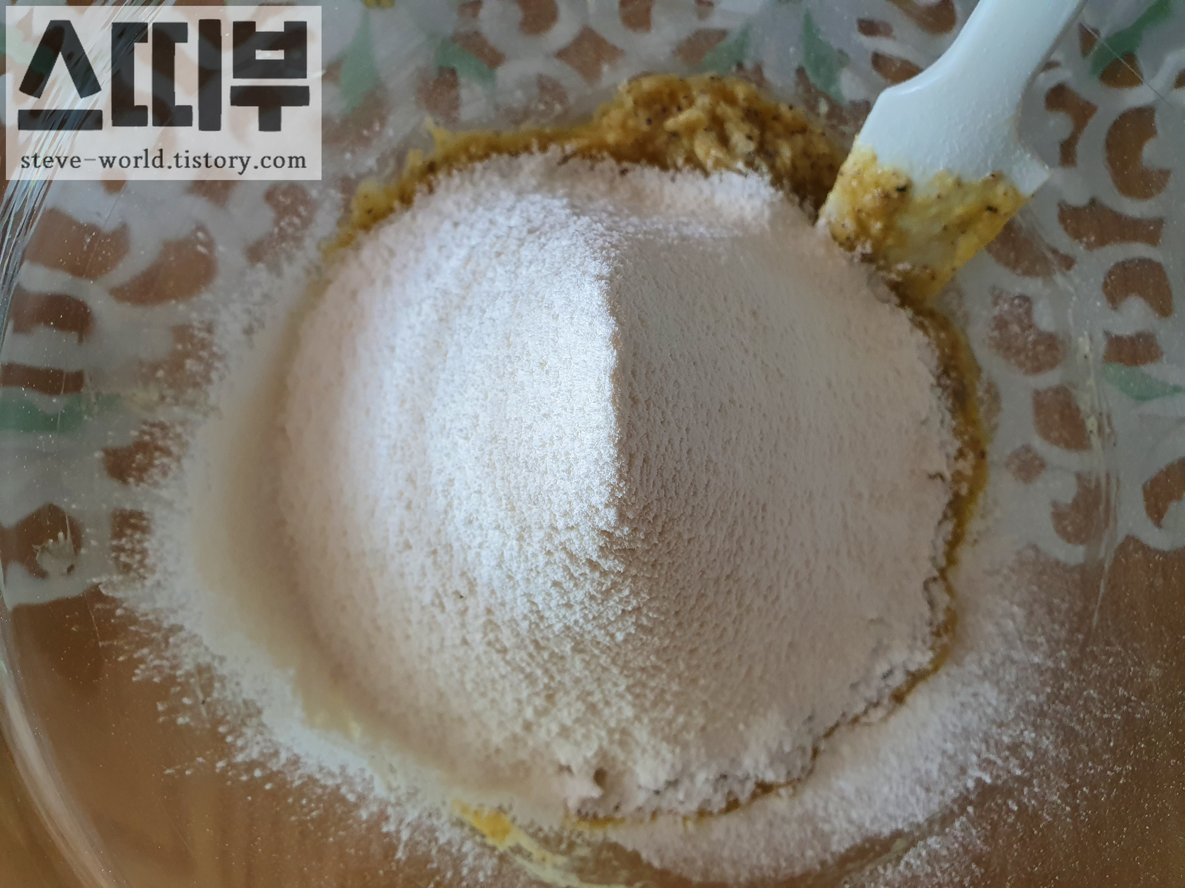 [4] 박력분을 채 쳐 넣고 주걱을 세워서 가볍게 섞어 한 덩어리로 만듭니다.