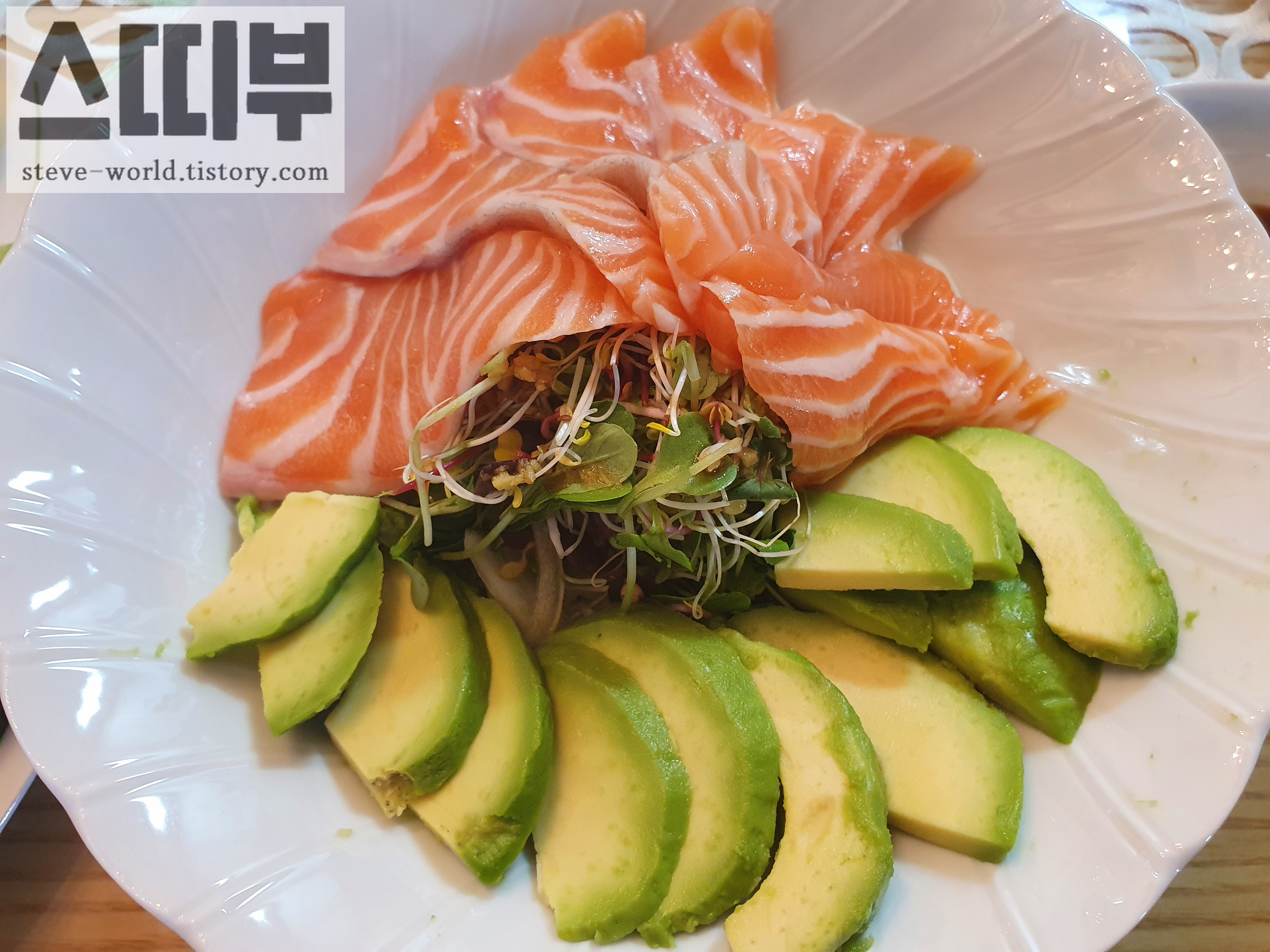 선명한 붉은색의 연어와 푸른 아보카도, 새싹채소들이 잘 어울립니다.